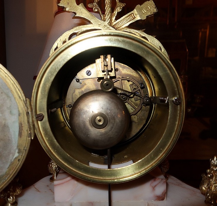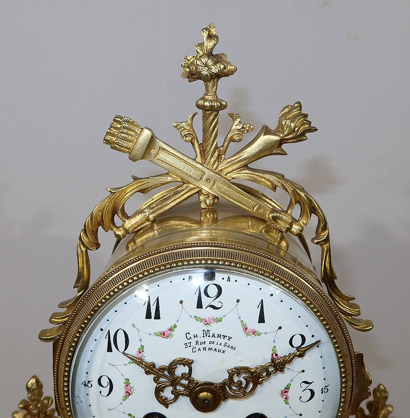 Au dessus du cadran une belle sculpture ajourée en bronze figure un flambeau, un bouquet et des flèches.