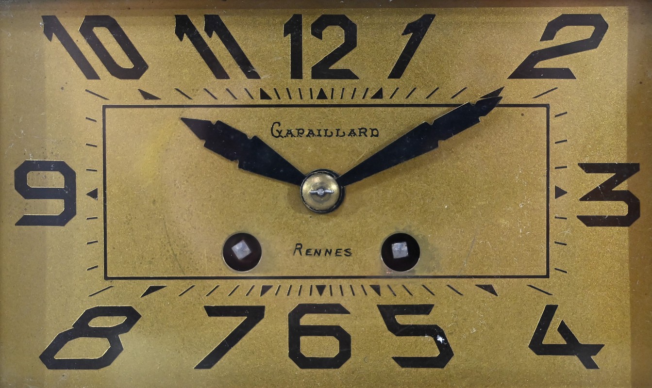 L’horloge rectangulaire est estampillée par l’horloger Alexandre Gapaillard fondateur du Grand Comptoir National d’horlogerie en 1850 à Rennes.