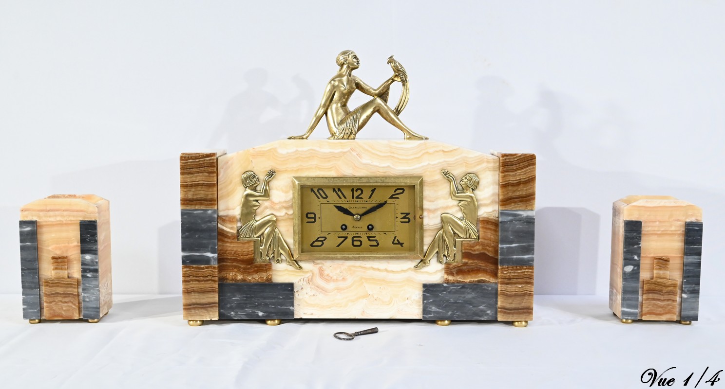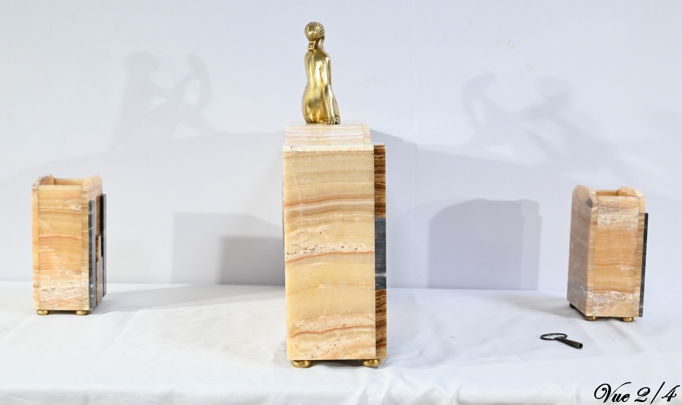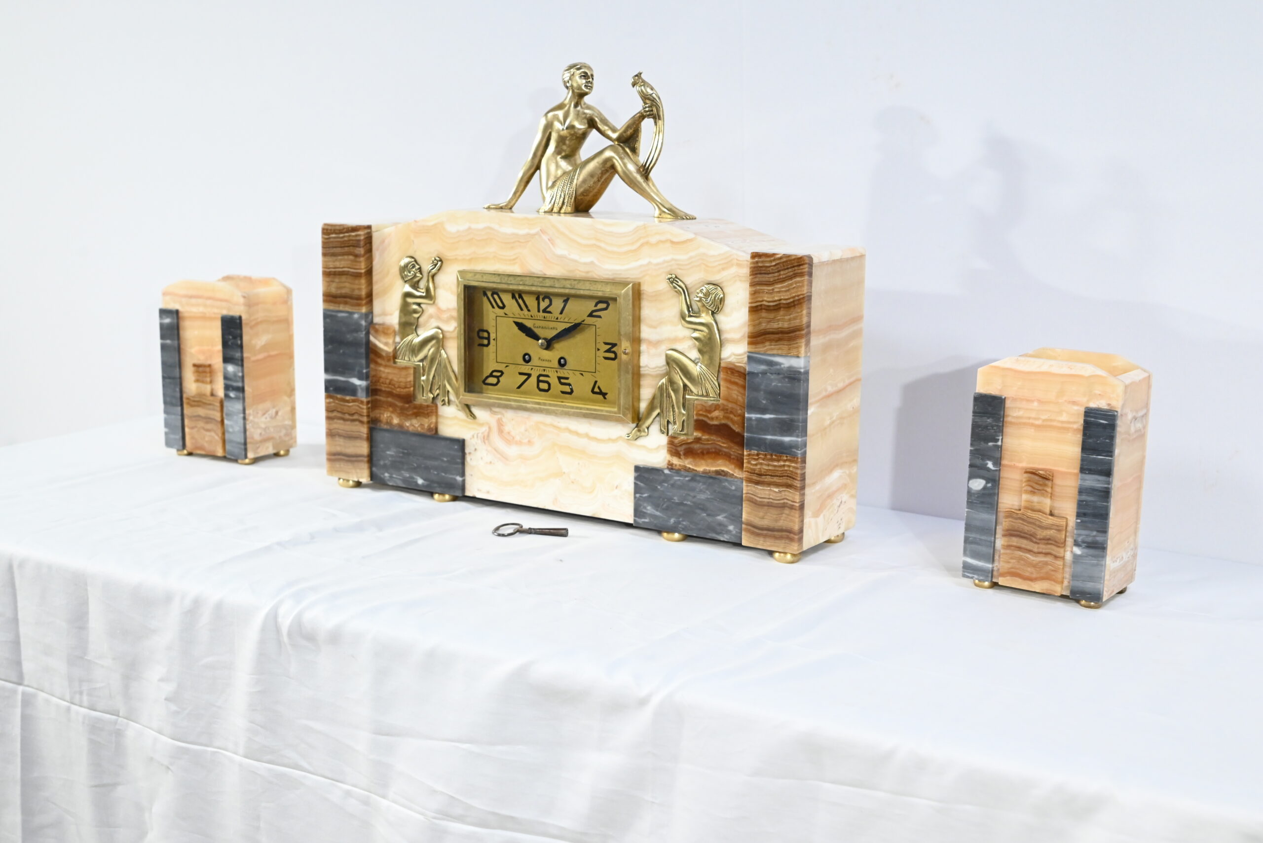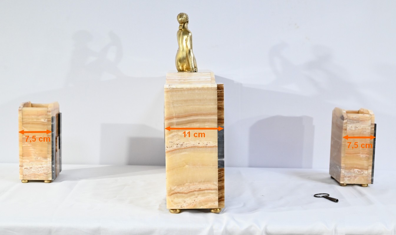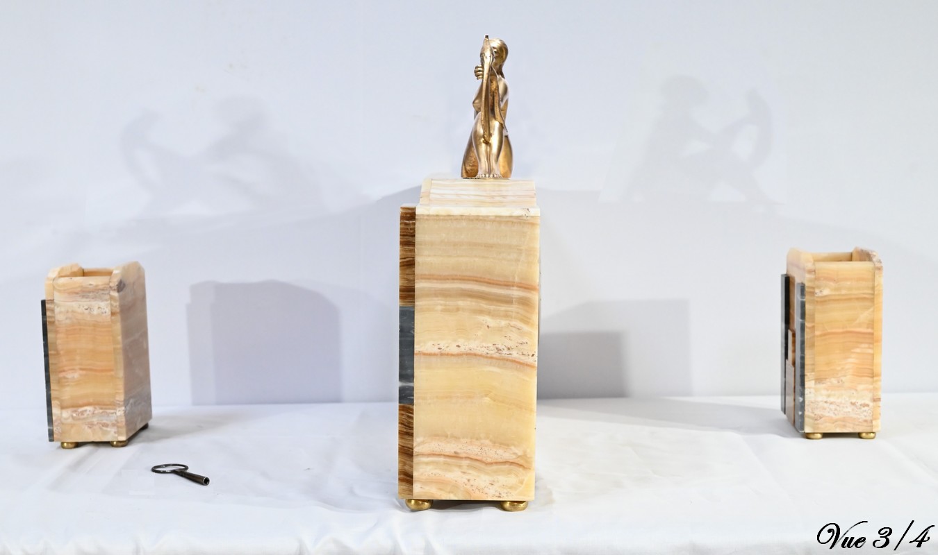 L’alliance de l’onyx, du marbre et du bronze, ainsi que ses ornementations, font de cette garniture de cheminée une œuvre fidèle au courant Art Déco.