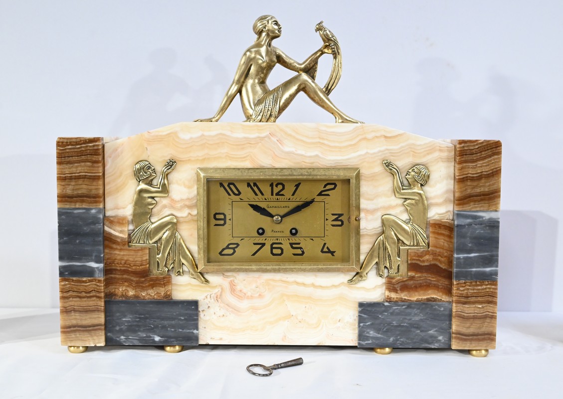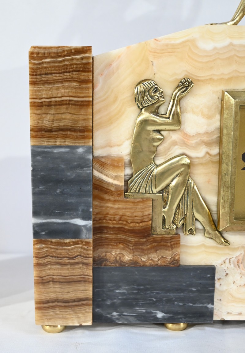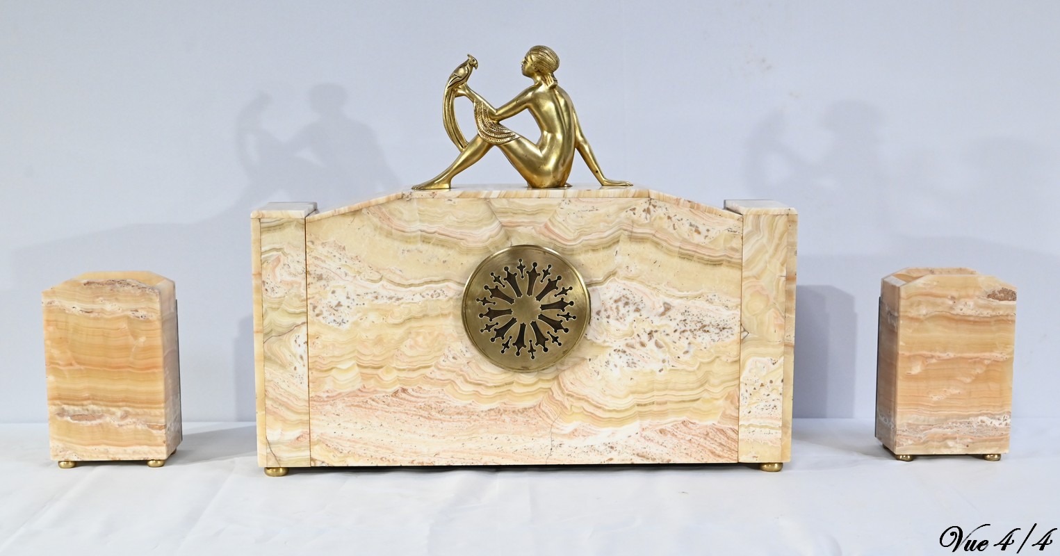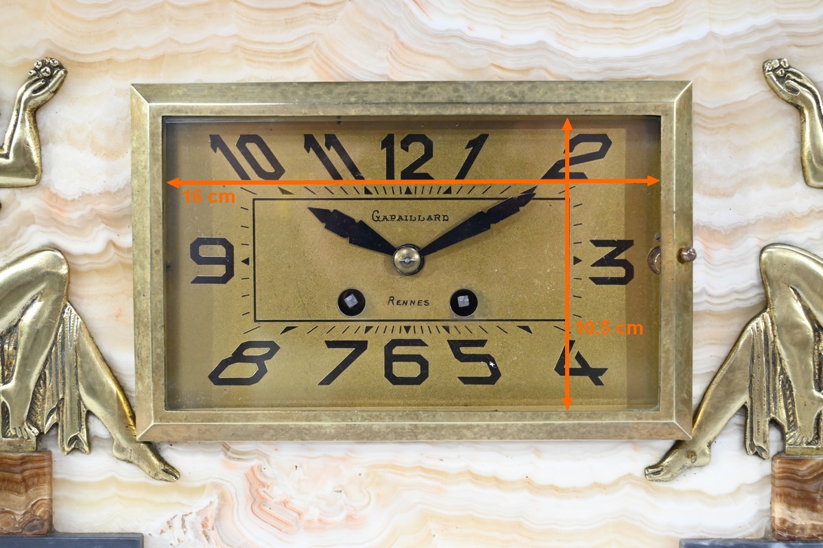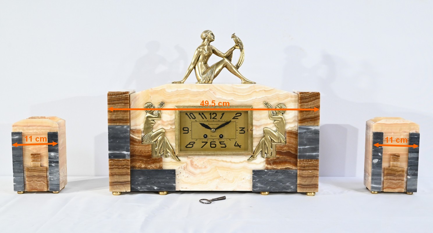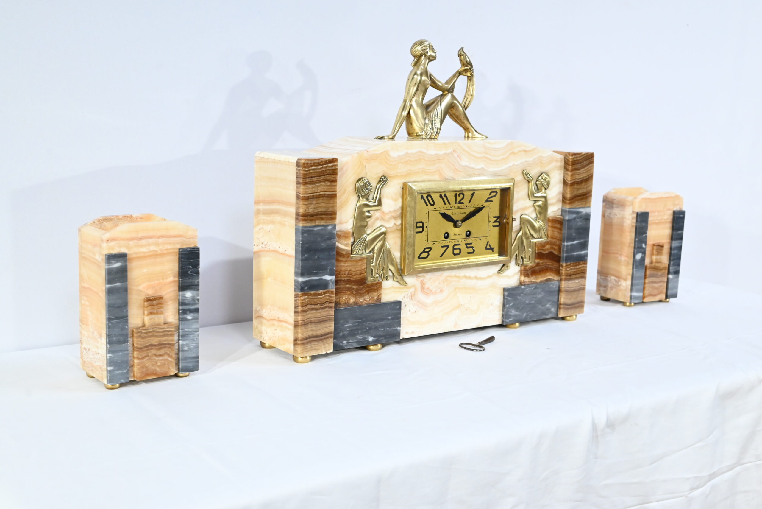 L’alliance de l’onyx, du marbre et du bronze, ainsi que ses ornementations, font de cette garniture de cheminée une œuvre fidèle au courant Art Déco.