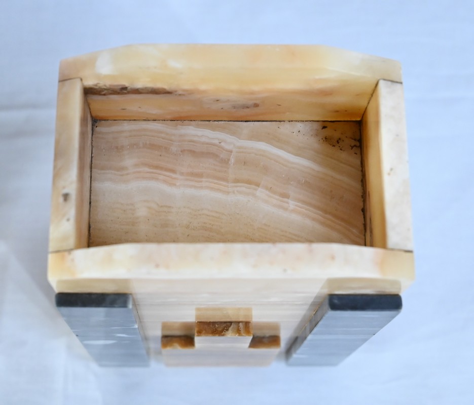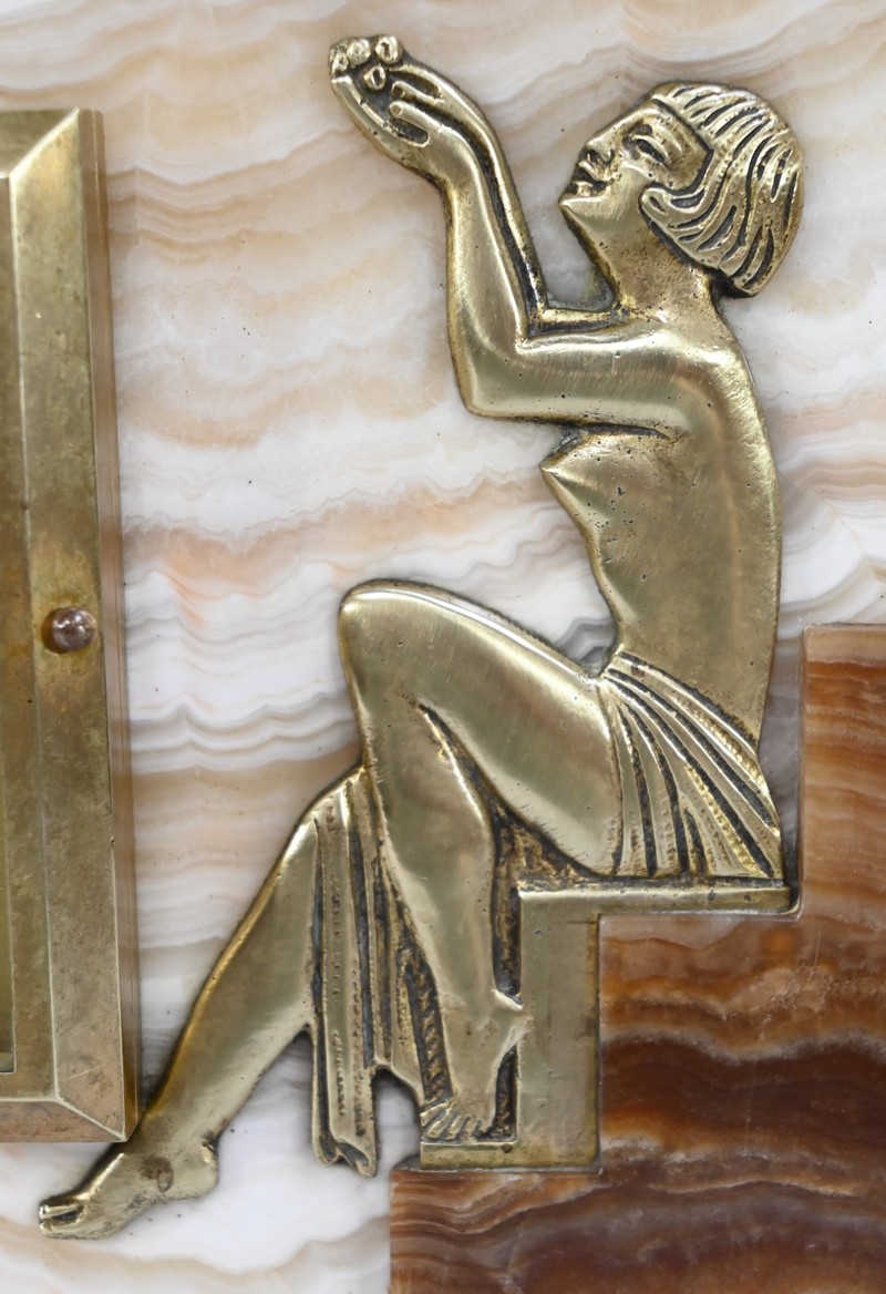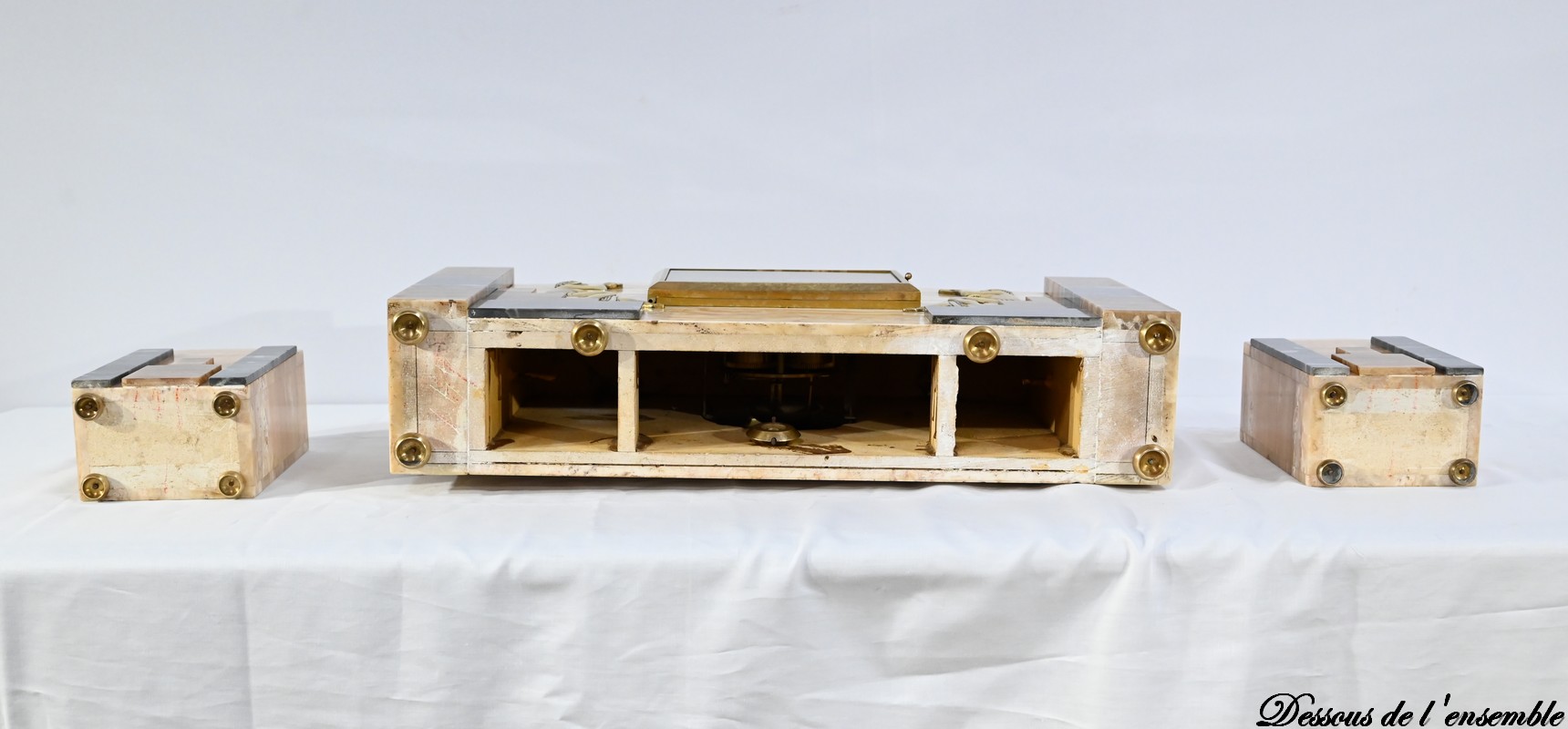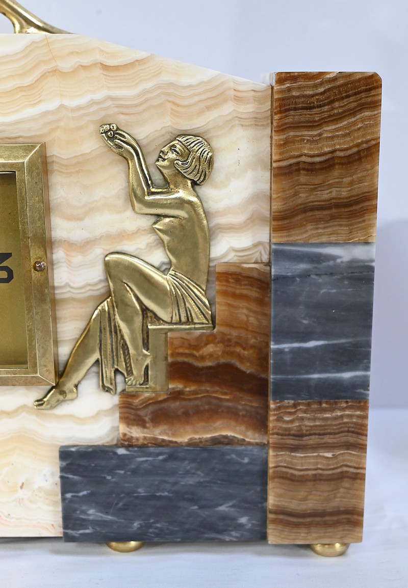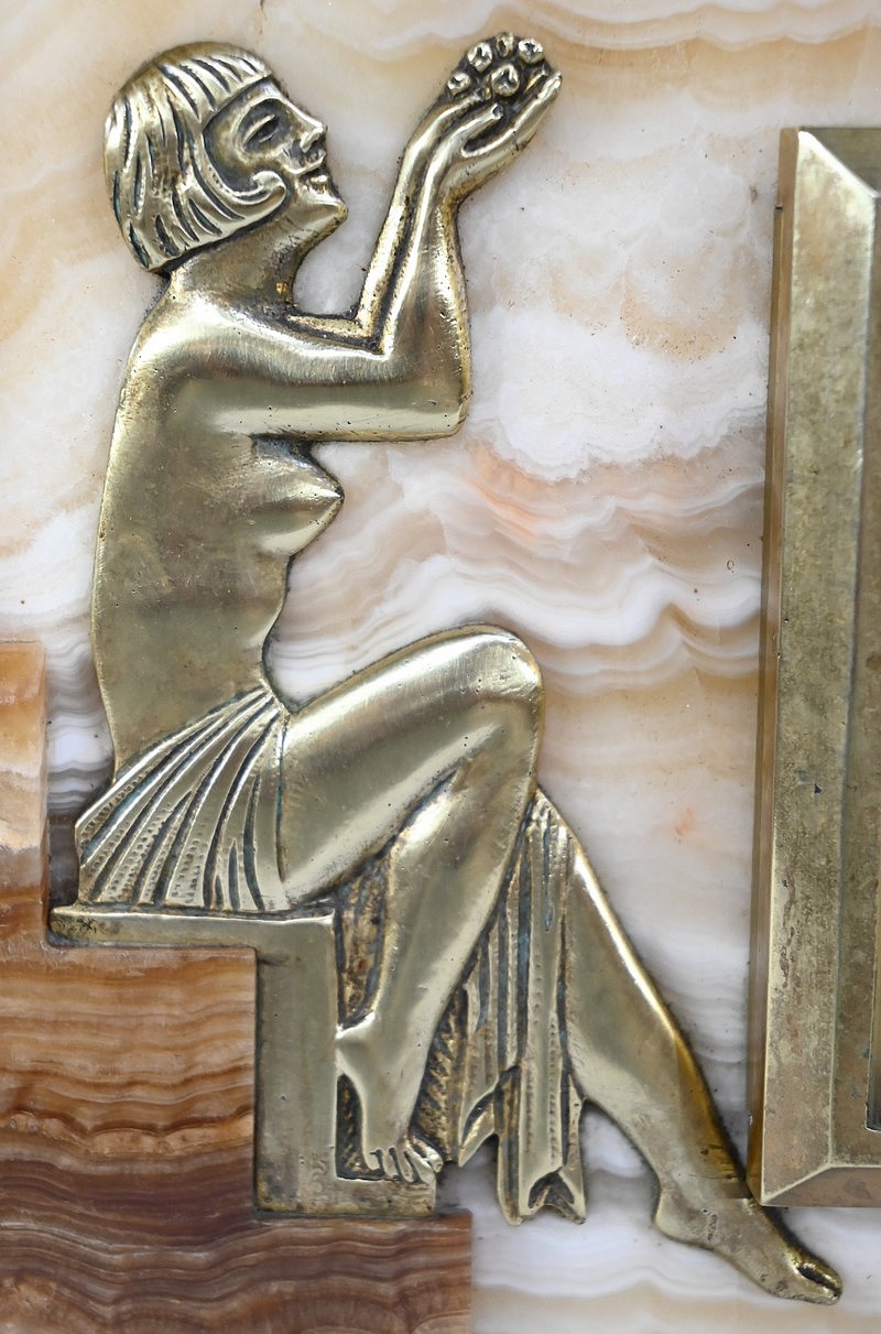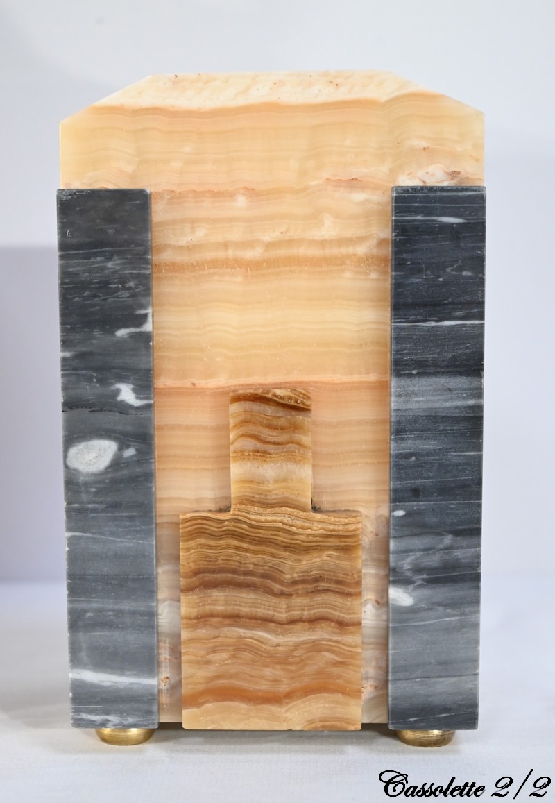 L’alliance de l’onyx, du marbre et du bronze, ainsi que ses ornementations, font de cette garniture de cheminée une œuvre fidèle au courant Art Déco.