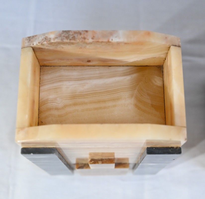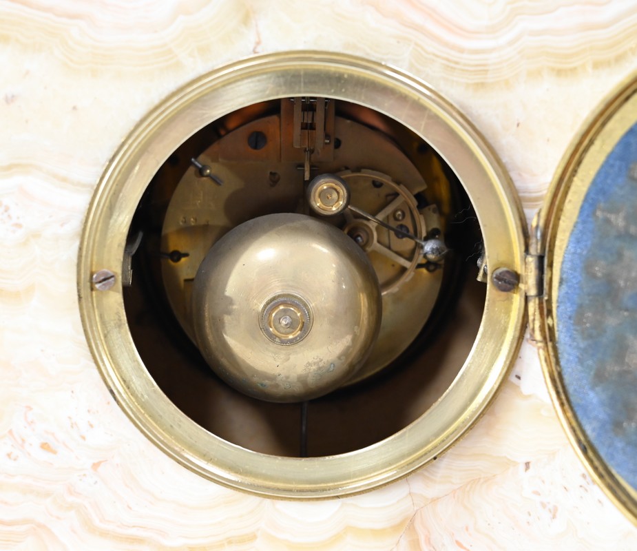 Superbe ensemble de cheminée, en onyx miel contrasté de plaques d’onyx brun et de marbre bleu de turquin, comprenant une horloge et deux cassolettes.