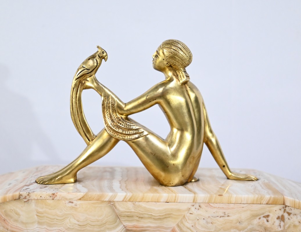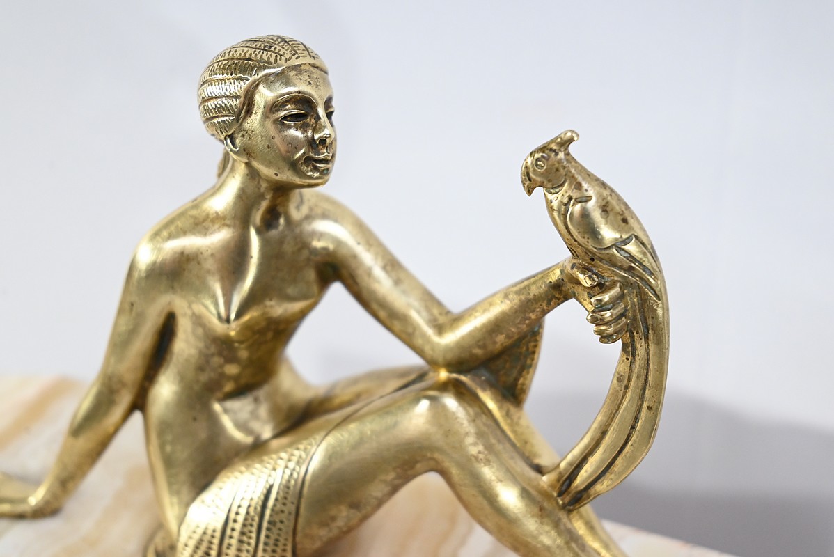 Ce garde temps comporte une sculpture en bronze représentant une femme drapée tenant un perroquet dans sa main gauche.