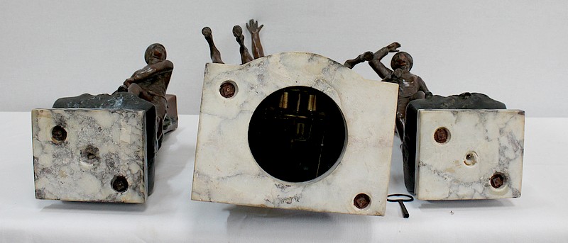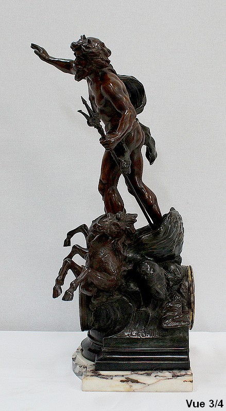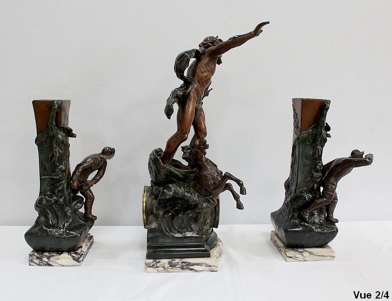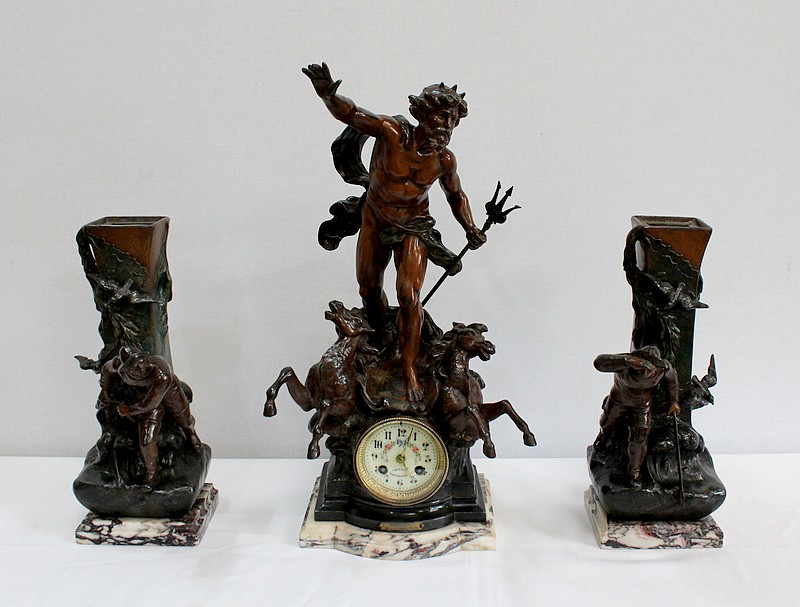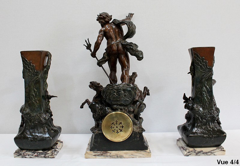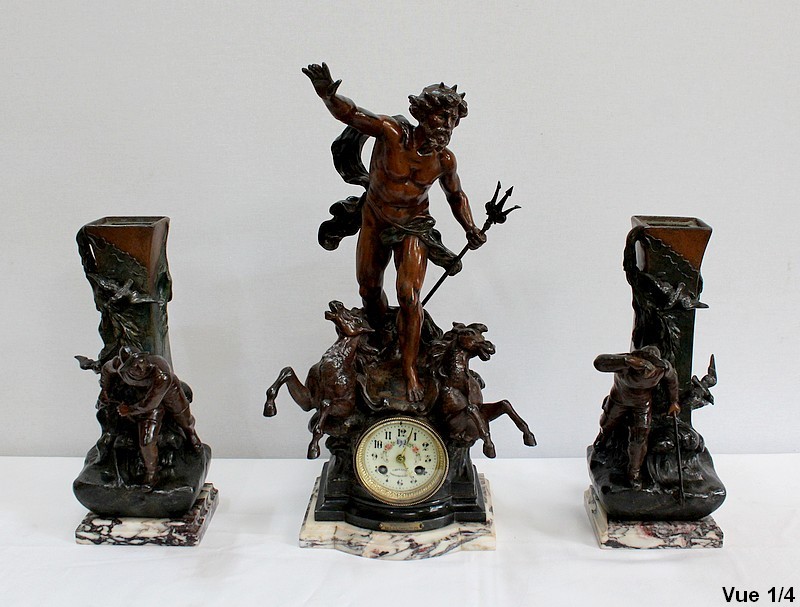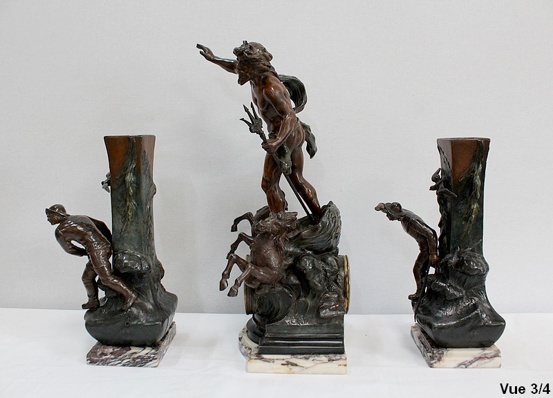 Garniture de Cheminée en Régule sur un socle en Marbre, composée d’une Pendule surmontée d’une Grande Statue illustrant Neptune et de deux Vases figurant des Pécheurs entourés de vagues et d’oiseaux marins.
