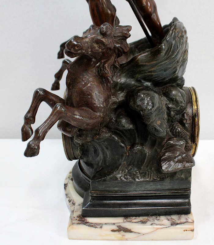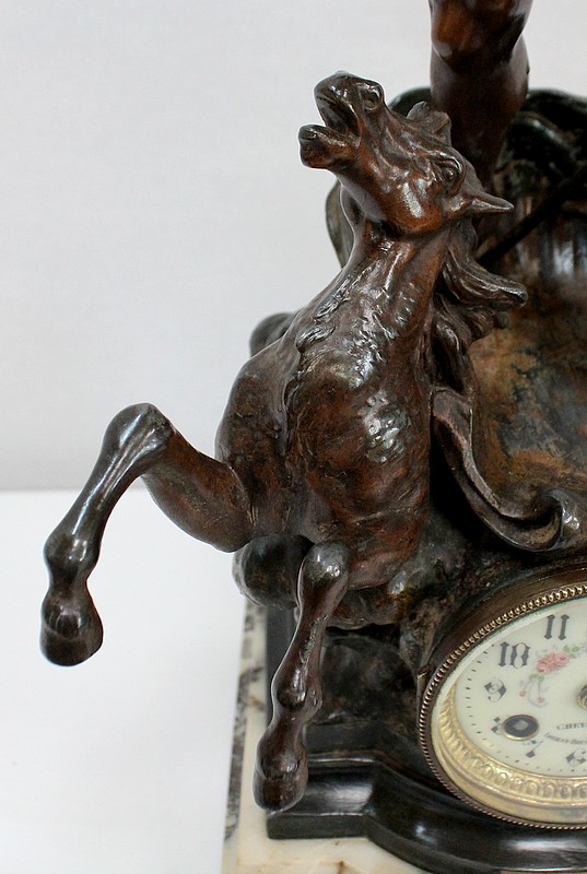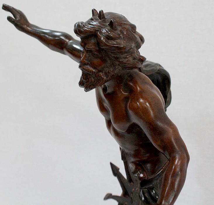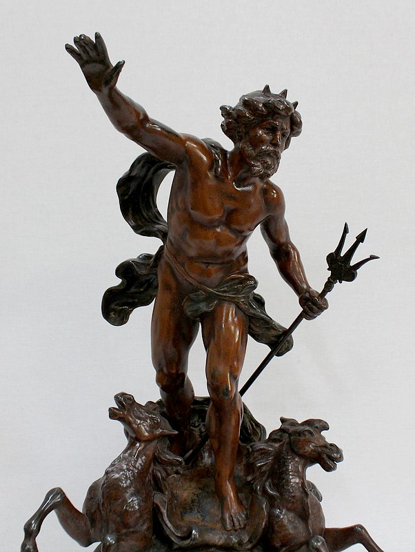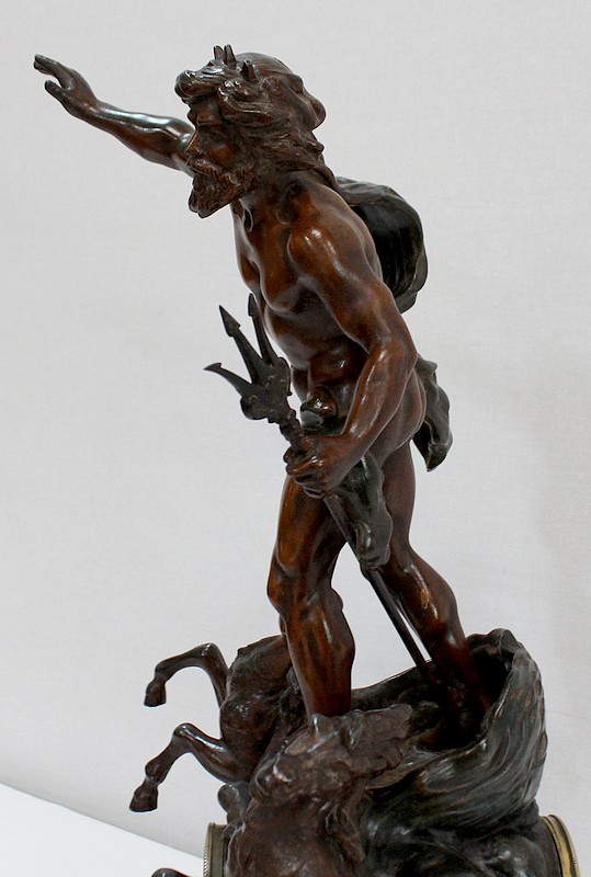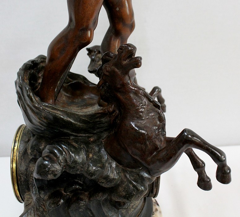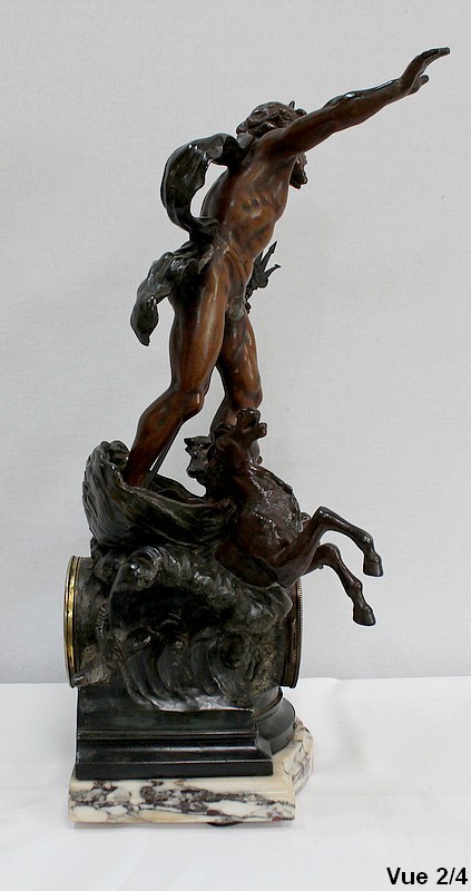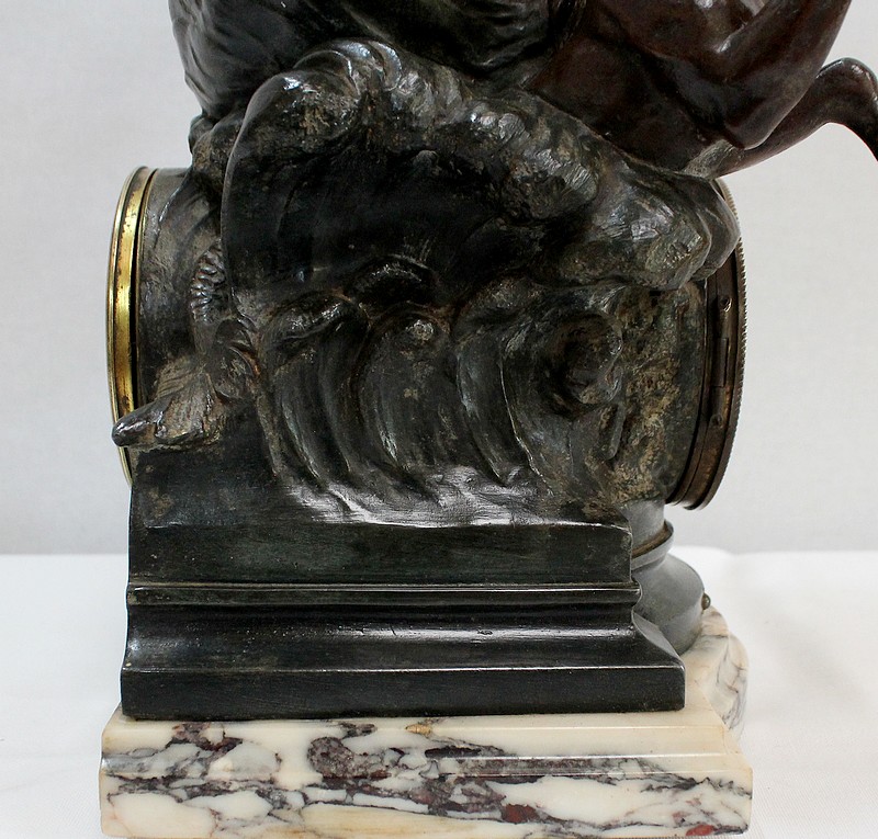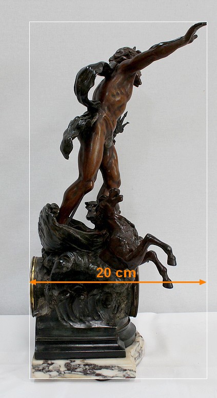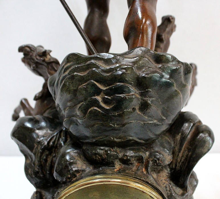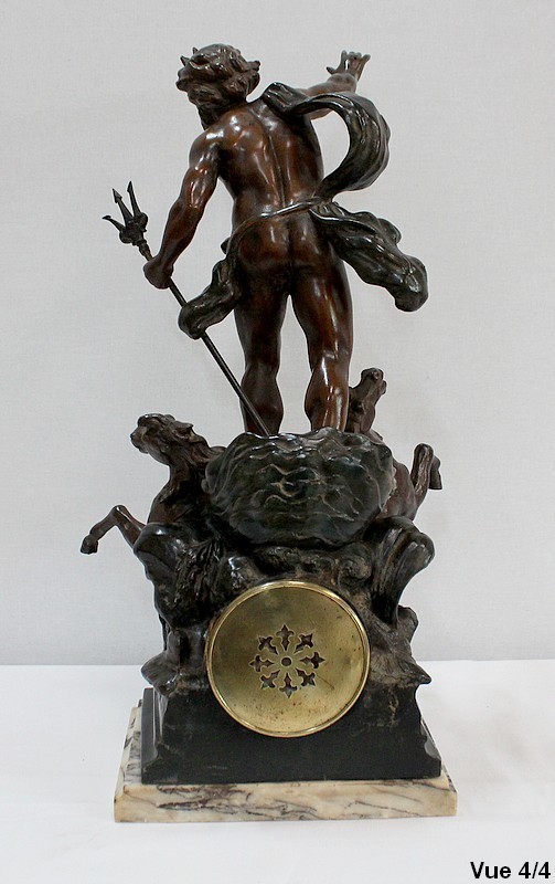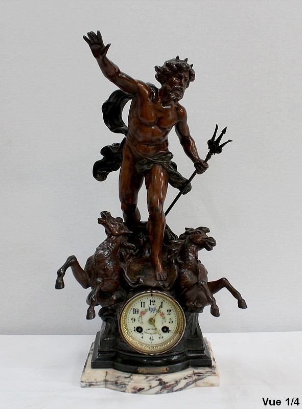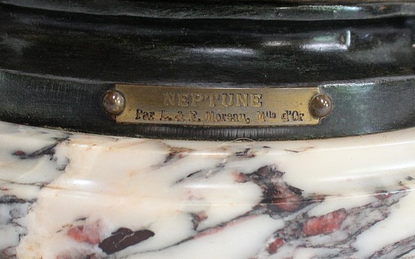 Signé Louis (1855-1919) et François (1857-1930) Moreau, l’œuvre principale représente le Dieu des Mers portant son trident debout sur son Char, tiré par des chevaux marins. La partie inférieure bénéficie d’une Horloge en état de fonctionnement munie d’une Clé, présentant un Cadran peint de motifs Floraux et la Marque Chevassu « Lorient-Brest-Nantes ». Une plaque est fixée sur le socle où la mention suivante apparait : « Neptune par L.& F. Moreau, Mlle d’Or ».
