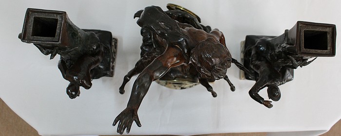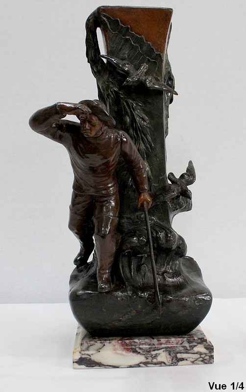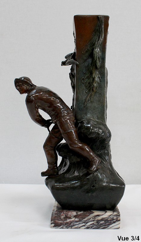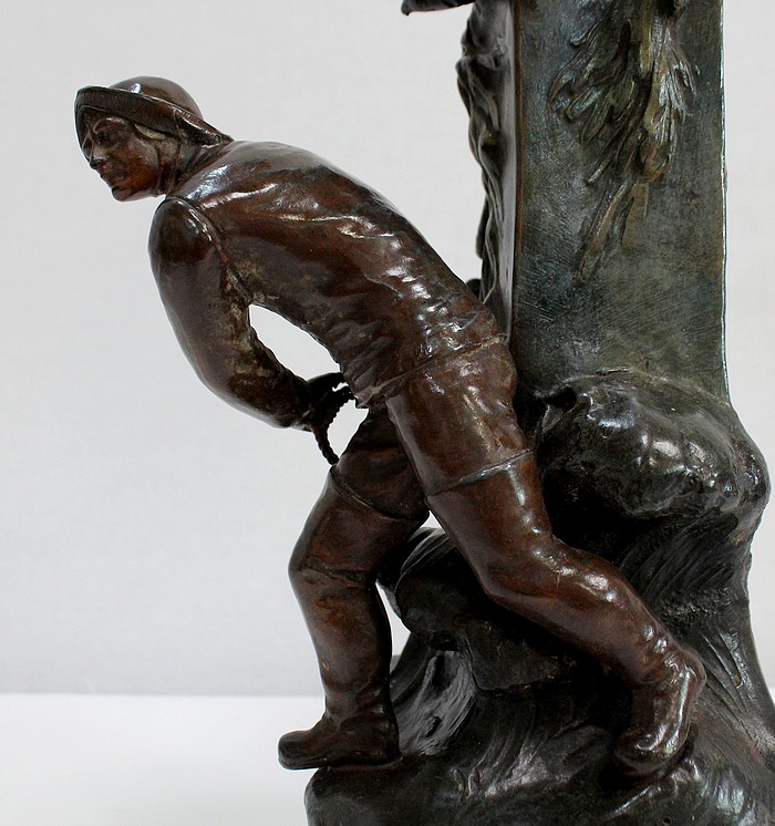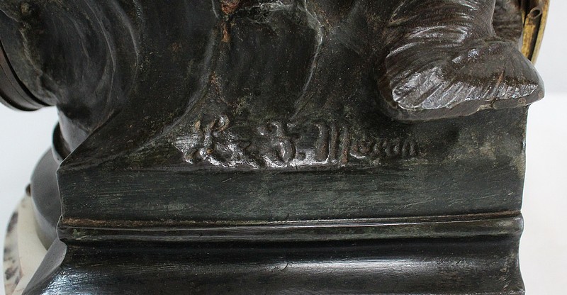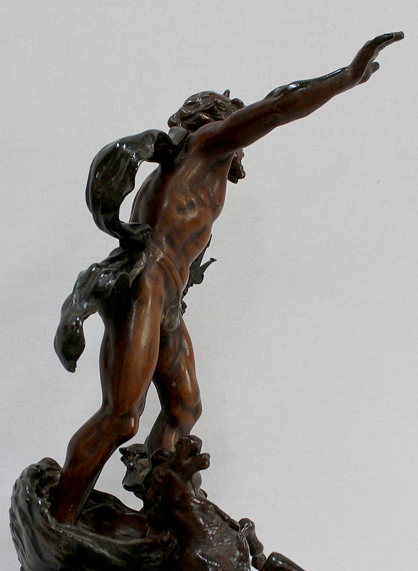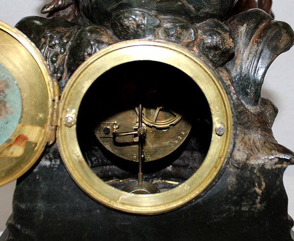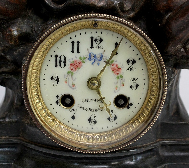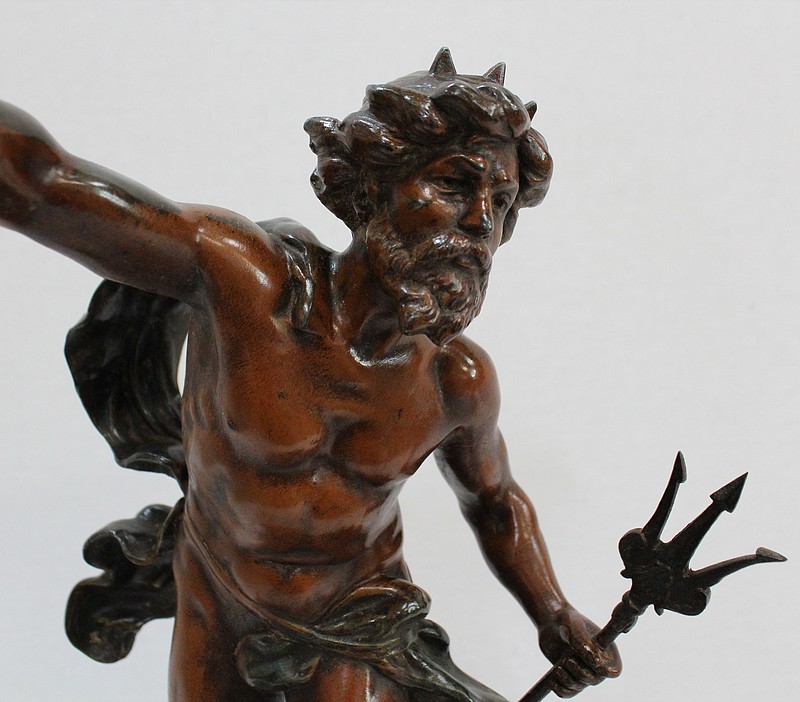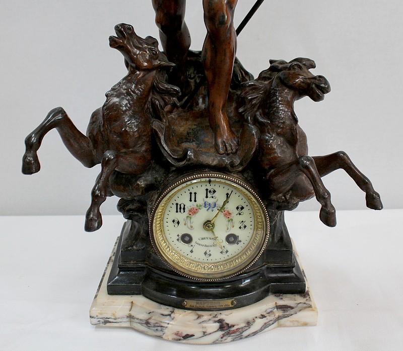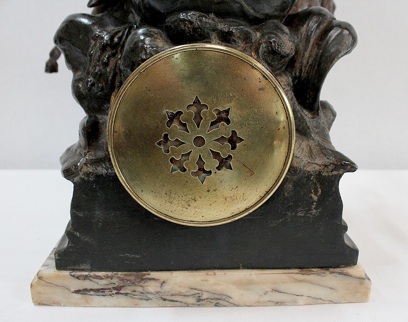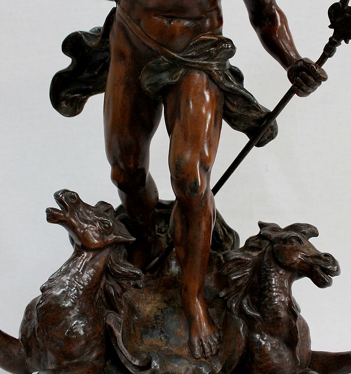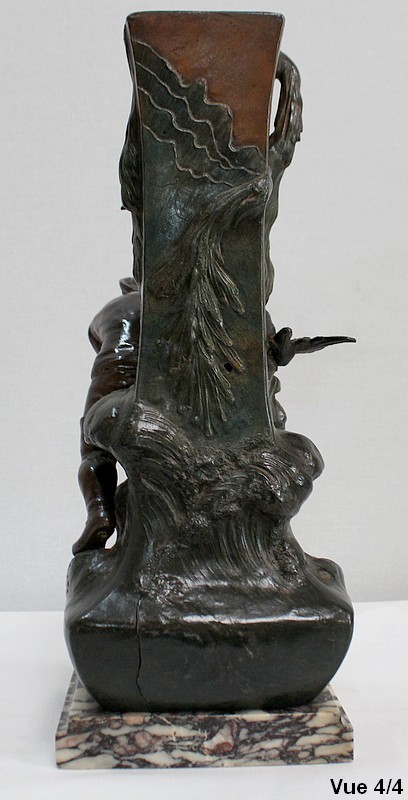 Signé Louis (1855-1919) et François (1857-1930) Moreau, l’œuvre principale représente le Dieu des Mers portant son trident debout sur son Char, tiré par des chevaux marins. La partie inférieure bénéficie d’une Horloge en état de fonctionnement munie d’une Clé, présentant un Cadran peint de motifs Floraux et la Marque Chevassu « Lorient-Brest-Nantes ». Une plaque est fixée sur le socle où la mention suivante apparait : « Neptune par L.& F. Moreau, Mlle d’Or ».