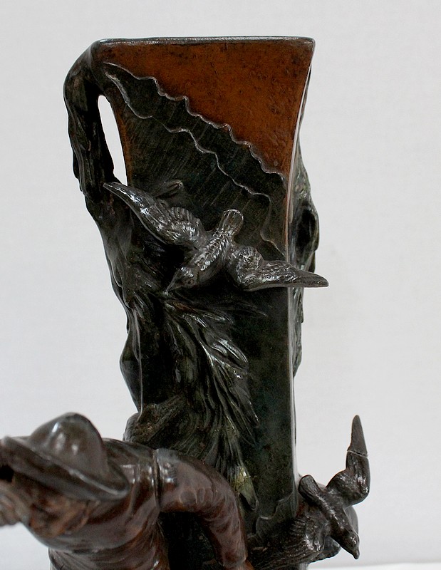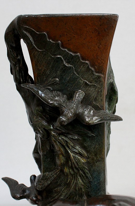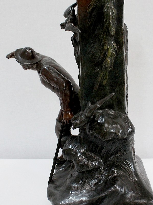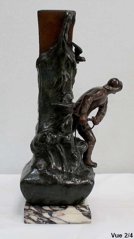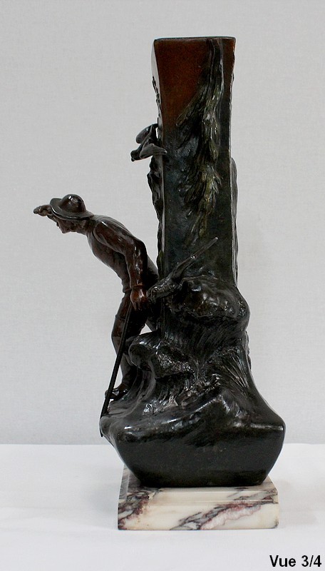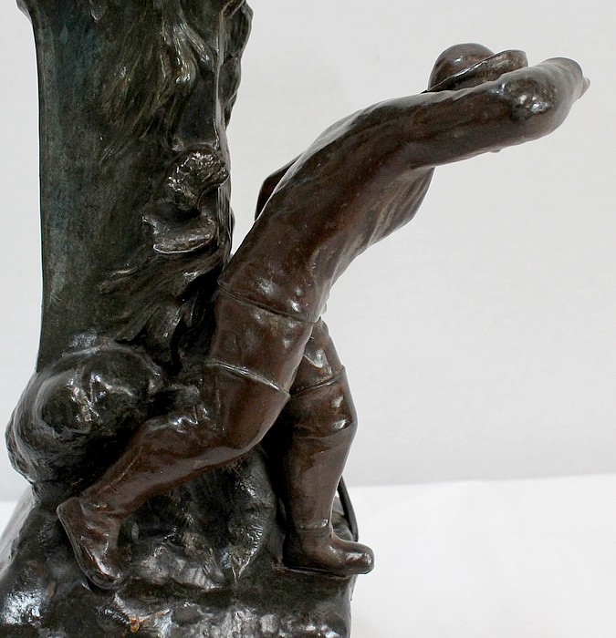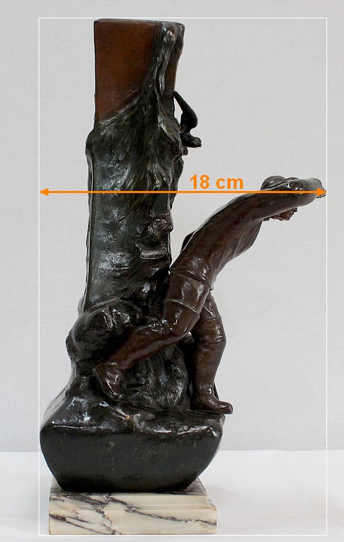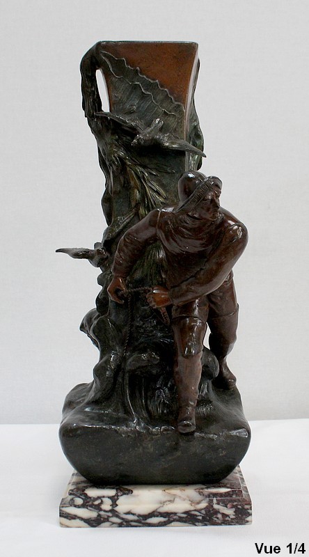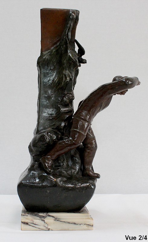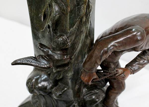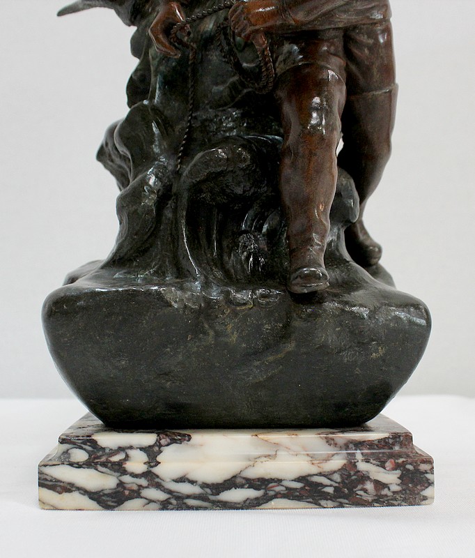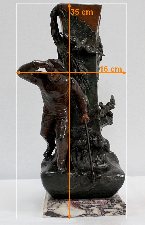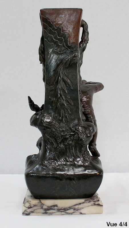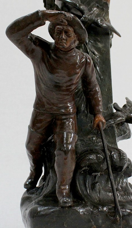 Signé Louis (1855-1919) et François (1857-1930) Moreau, l’œuvre principale représente le Dieu des Mers portant son trident debout sur son Char, tiré par des chevaux marins. La partie inférieure bénéficie d’une Horloge en état de fonctionnement munie d’une Clé, présentant un Cadran peint de motifs Floraux et la Marque Chevassu « Lorient-Brest-Nantes ». Une plaque est fixée sur le socle où la mention suivante apparait : « Neptune par L.& F. Moreau, Mlle d’Or ».