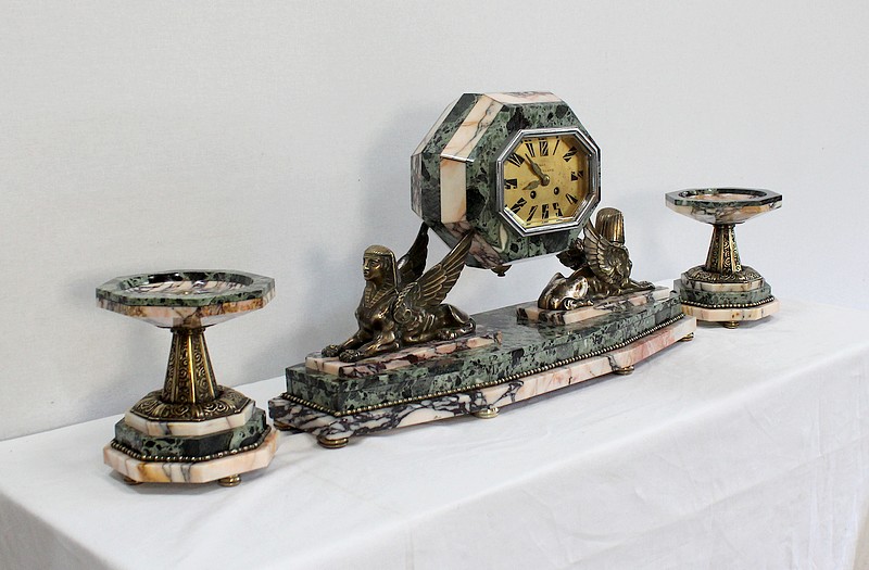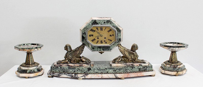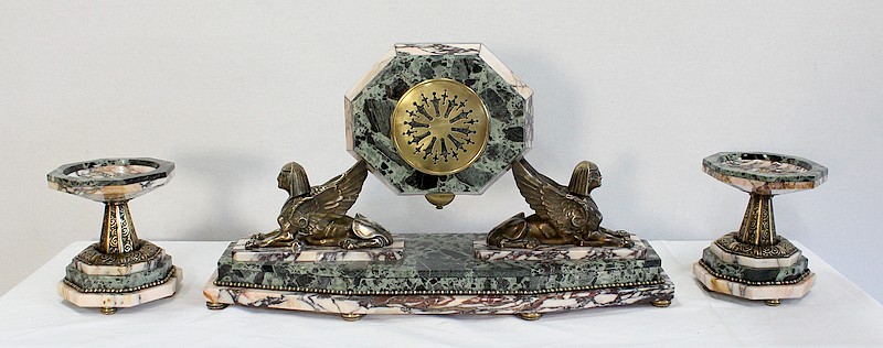 Garniture de cheminée composée d’une importante pendule accompagnée de deux cassolettes en marbre rose et vert de mer.