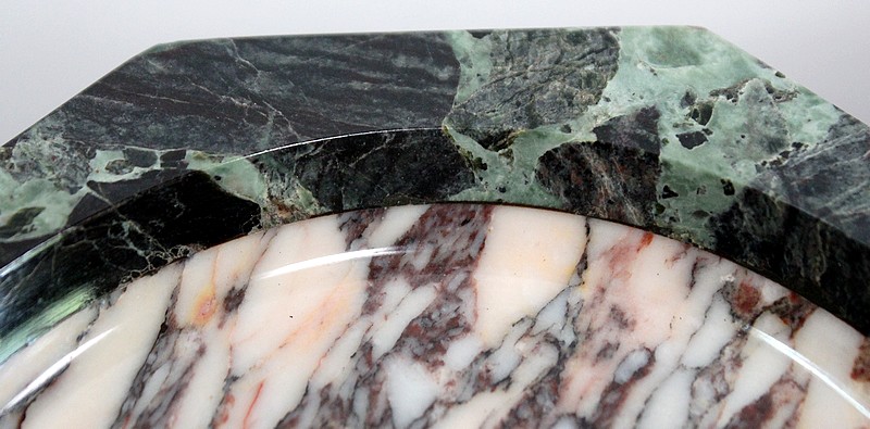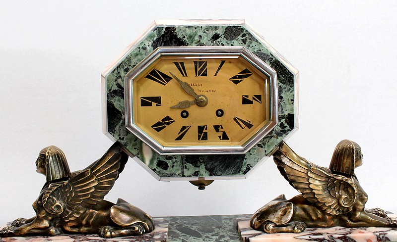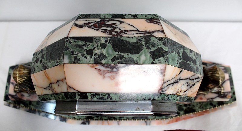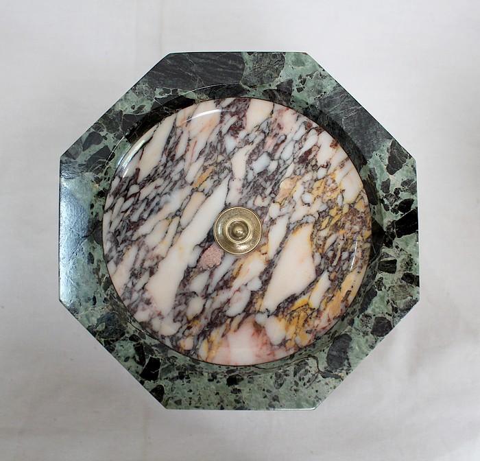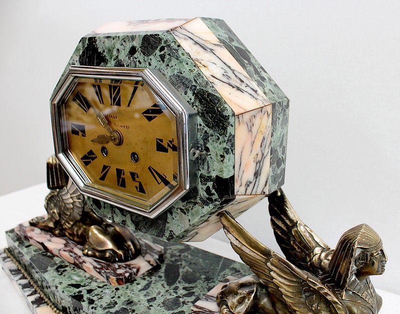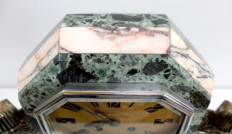 Cette horloge octogonale constituée de marbre veiné rose et vert est munie d’un cadran de même forme en métal chromé apparaissant en relief et portant la marque « Vallage Nantes ».