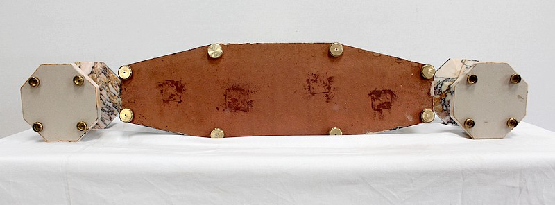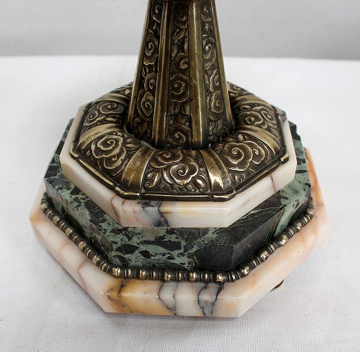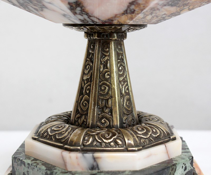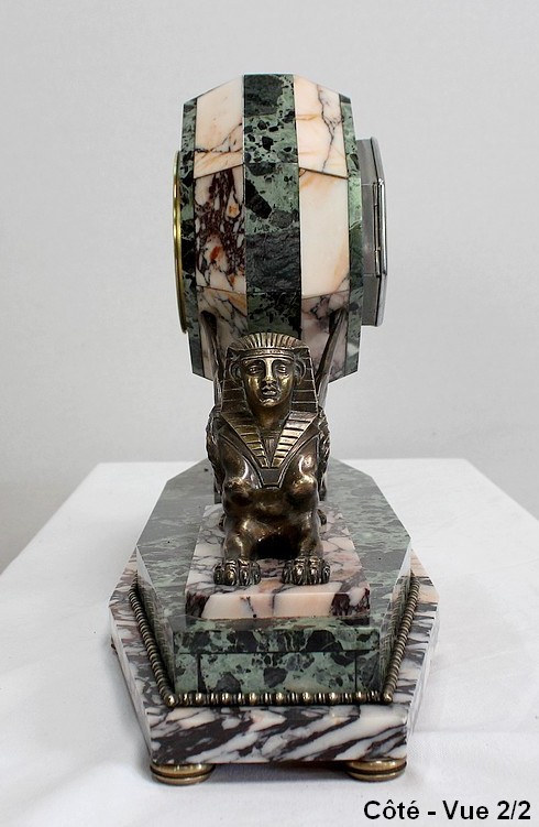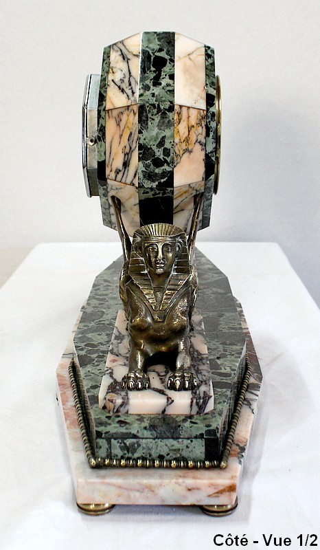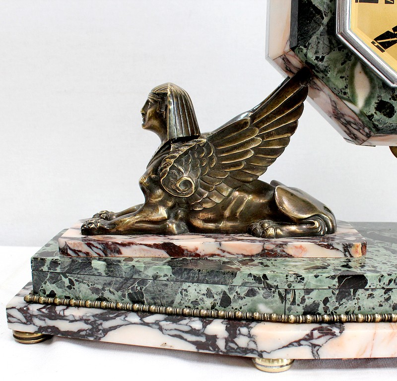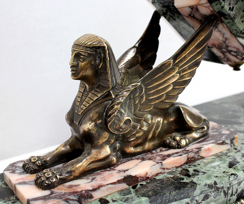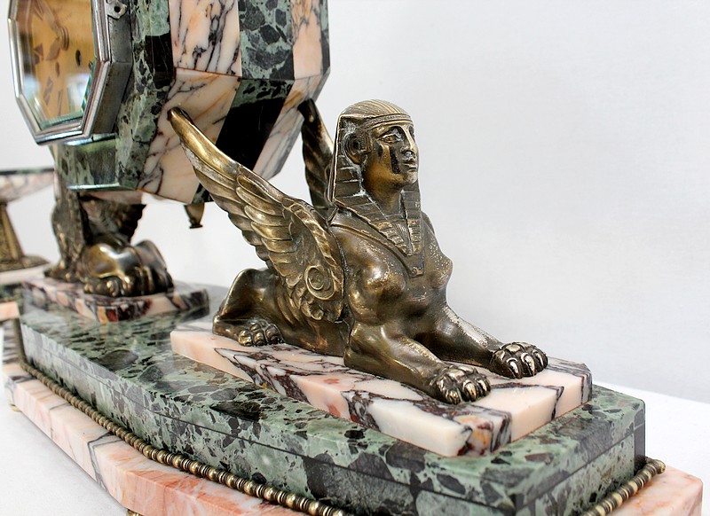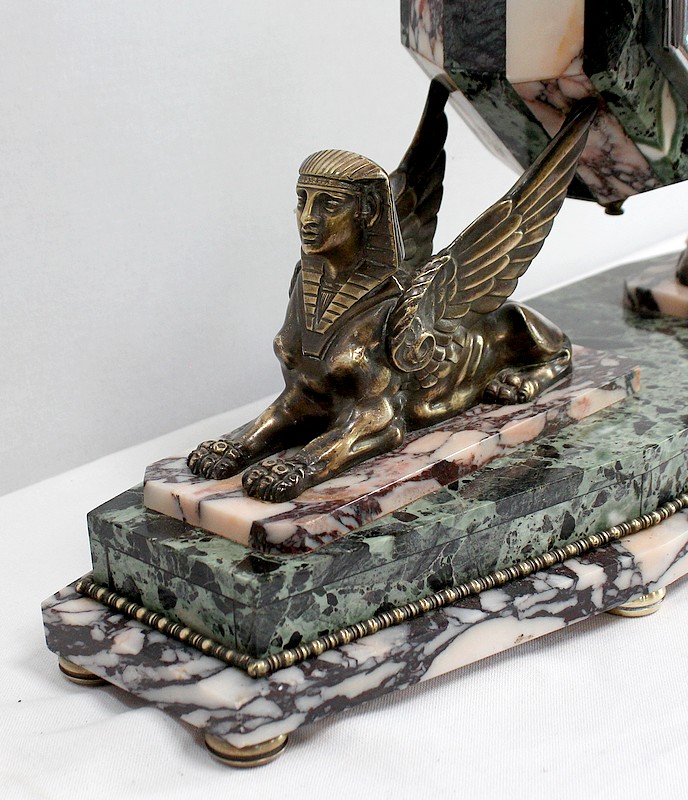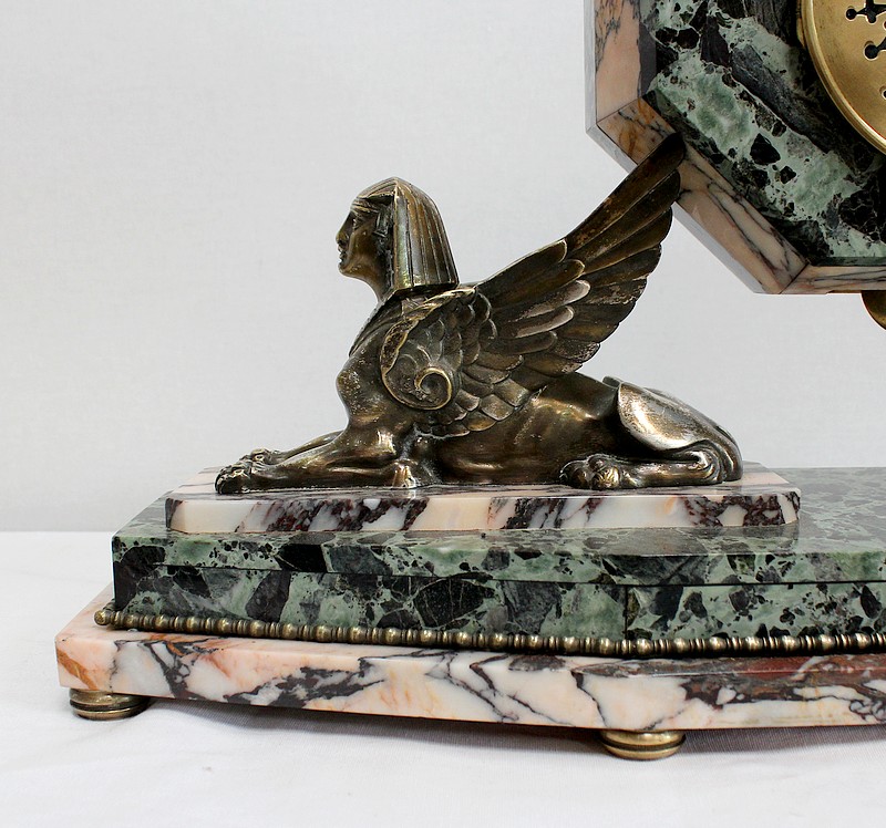 L’ensemble est soutenu par les ailes de deux Sphinges en bronze patiné. Chacune repose sur un rectangle de marbre rosé veiné, portés par un grand socle octogonal composé de deux marbres aux couleurs éclatantes, dont l’angle est agrémenté d’un chapelet en bronze.