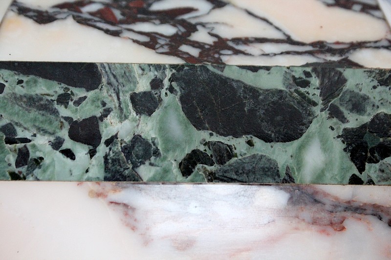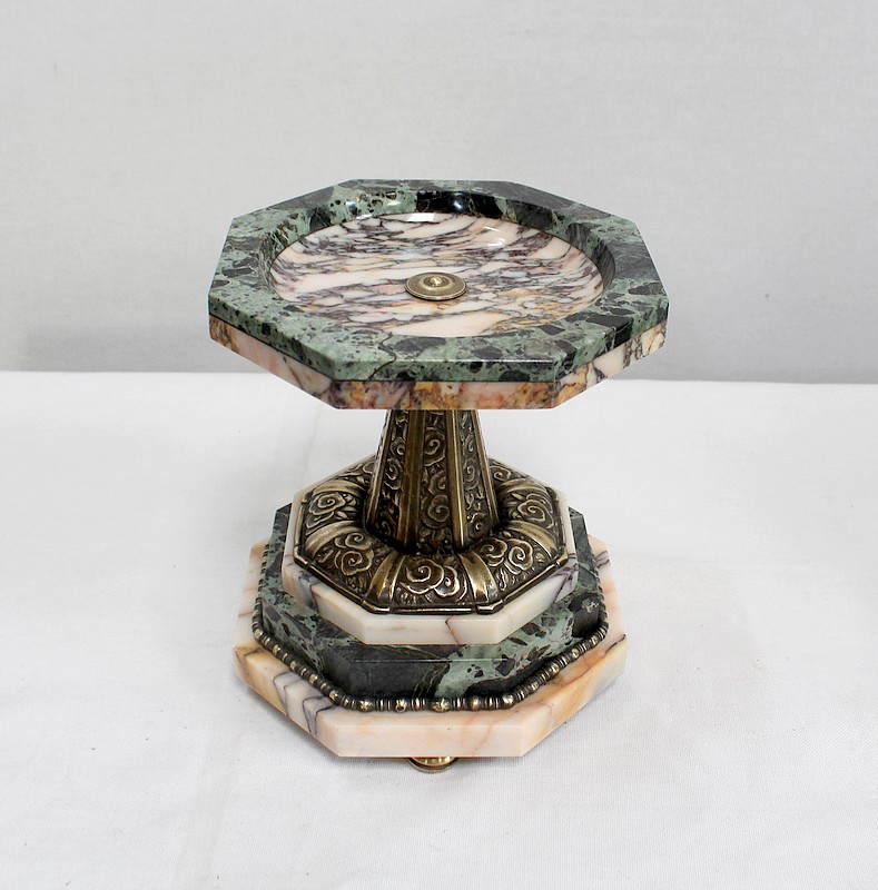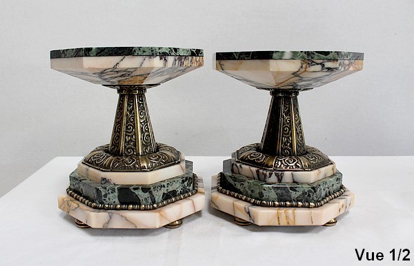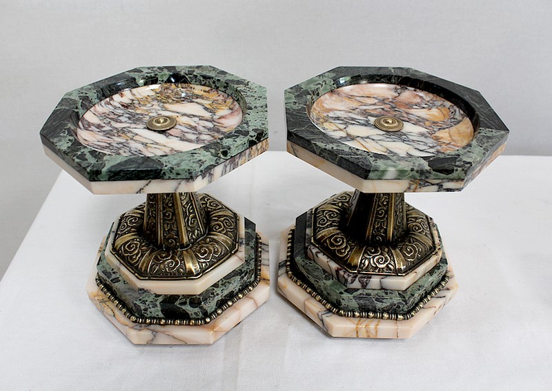 Ces cassolettes stratifiées de marbre vert de mer et rose veiné, bénéficient de pieds à pans coupés en bronze légèrement ouvragés se terminant par une collerette.