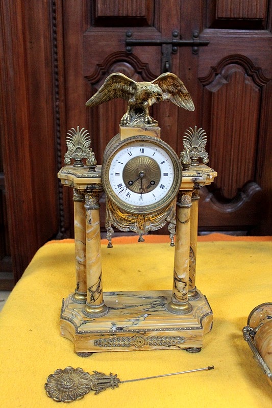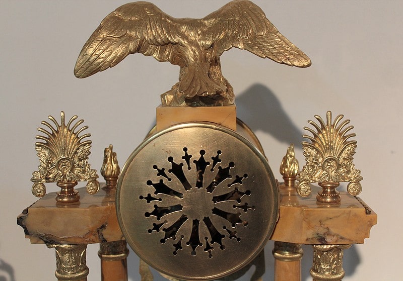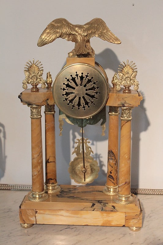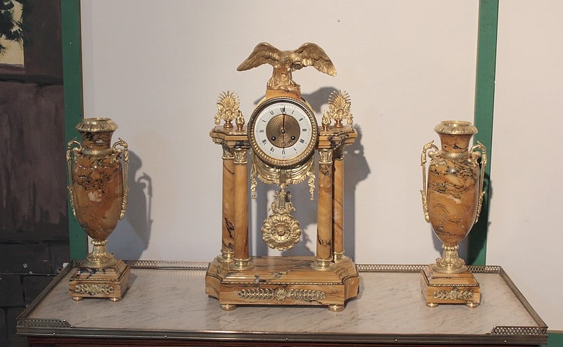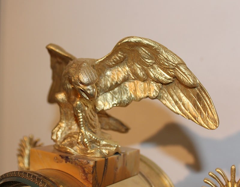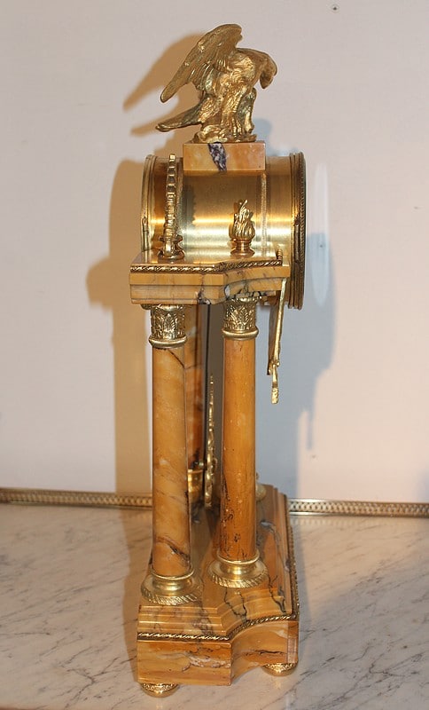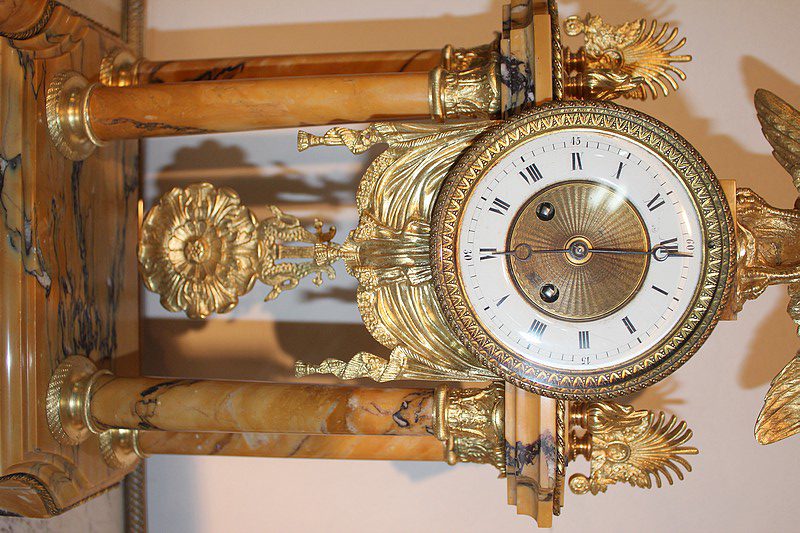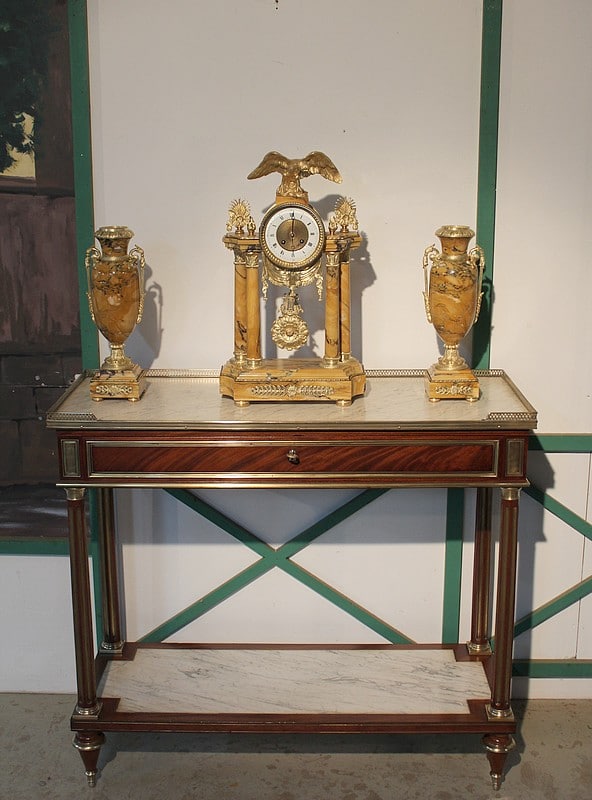 Garniture de cheminée en marbre et bronzes dorés de style Empire composée d’une pendule à colonnes et de 2 cassolettes. Le marbre est de couleur ocre veiné de brun , le cadran est surmonté d’un aigle en bronze aux ailes déployées. Elle est ornée de bronzes : palmettes, bagues, pieds … qui ont tous été déposés pour être nettoyés. (voir photos). Signature au dos du balancier : ‘H. Rozière’.