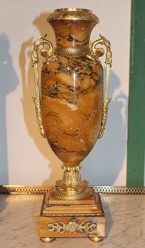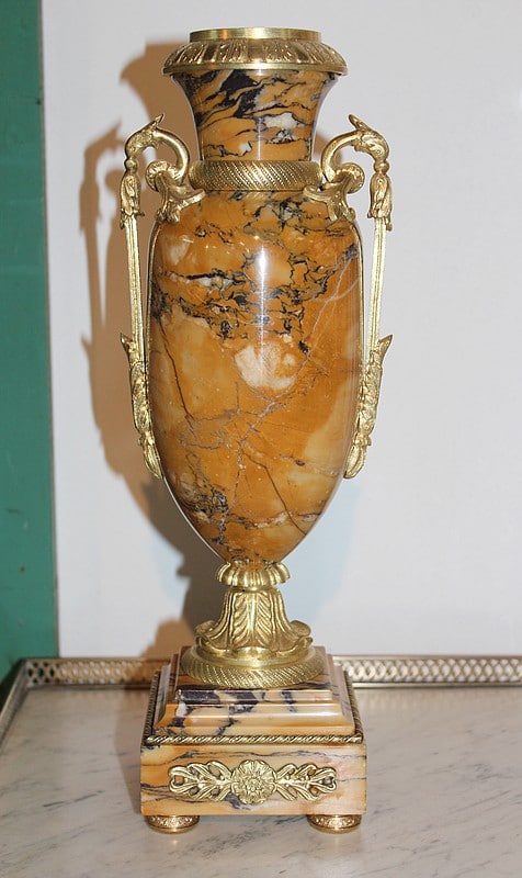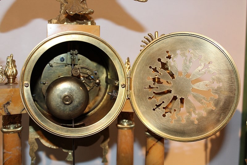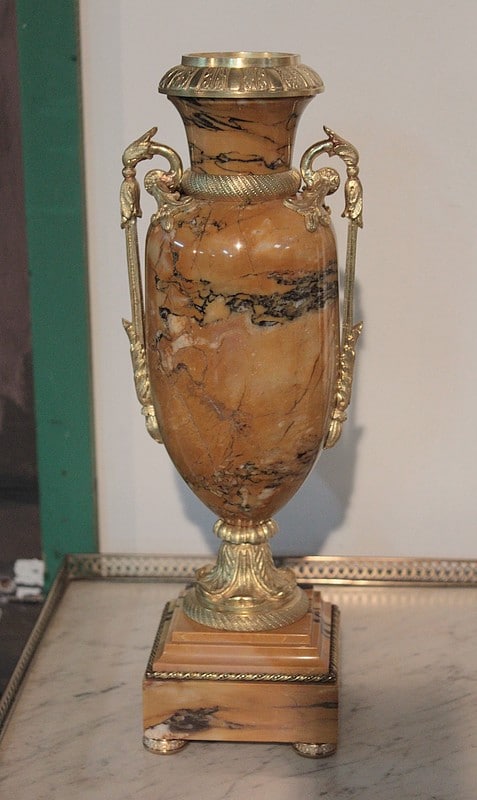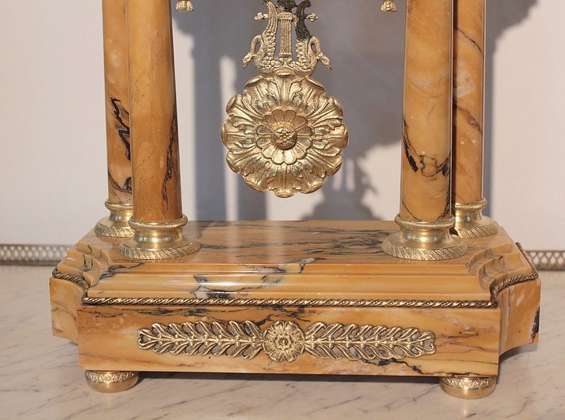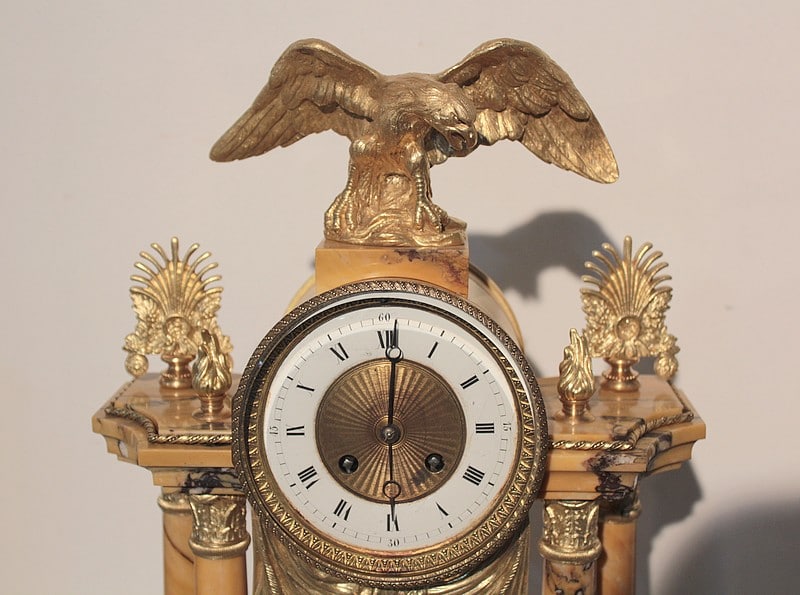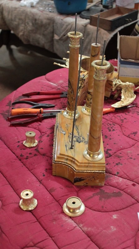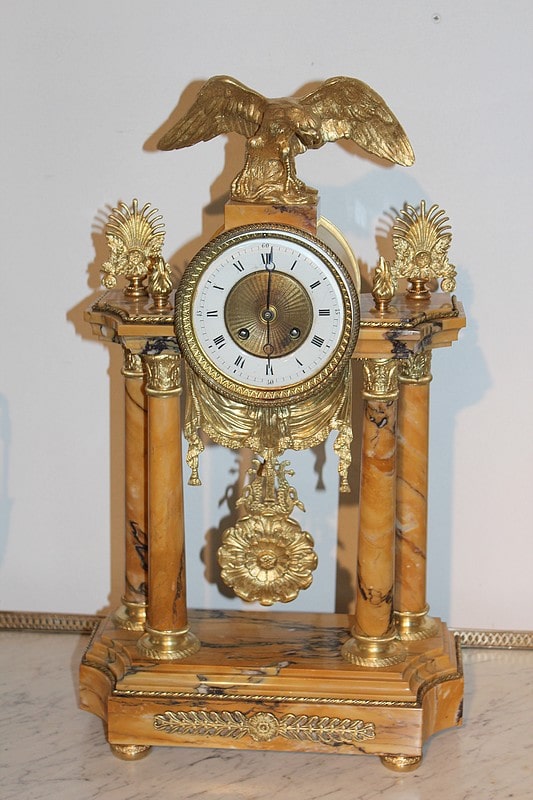 Garniture de cheminée en marbre et bronzes dorés de style Empire composée d’une pendule à colonnes et de 2 cassolettes. Le marbre est de couleur ocre veiné de brun , le cadran est surmonté d’un aigle en bronze aux ailes déployées. Elle est ornée de bronzes : palmettes, bagues, pieds … qui ont tous été déposés pour être nettoyés. (voir photos). Signature au dos du balancier : ‘H. Rozière’.