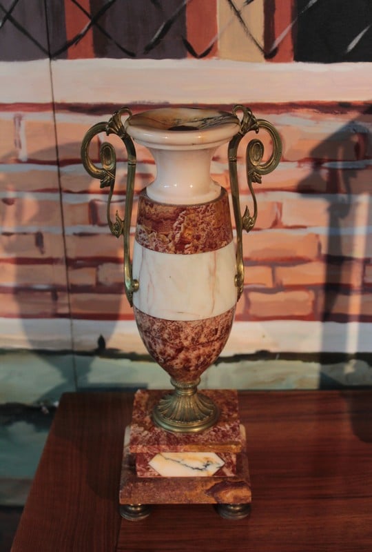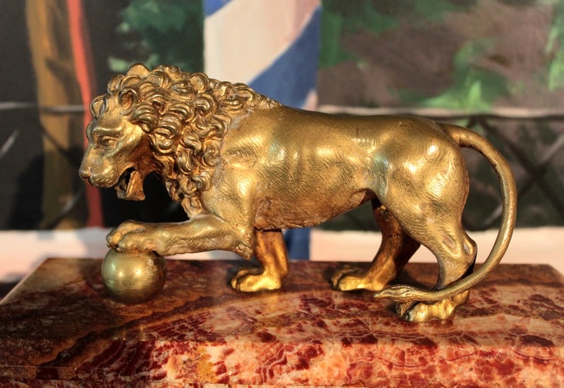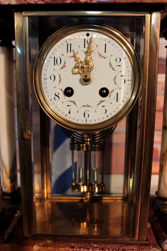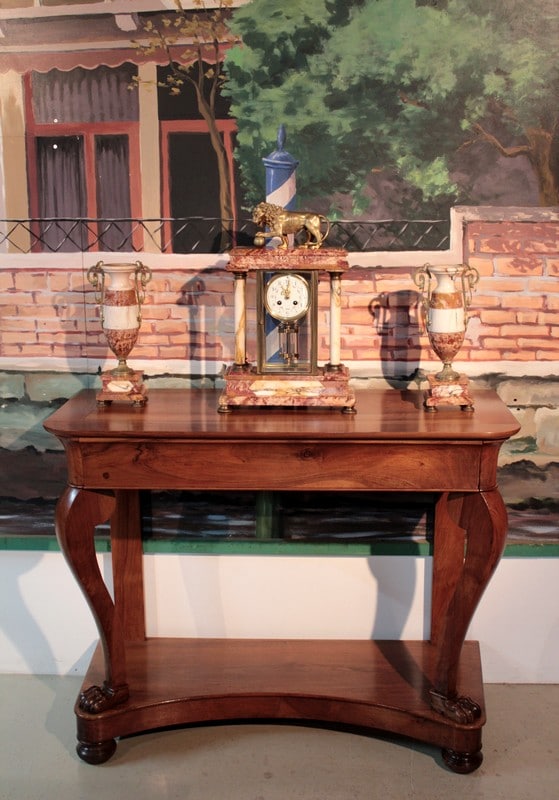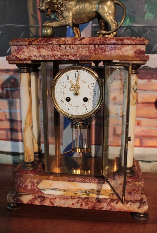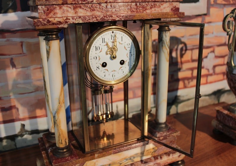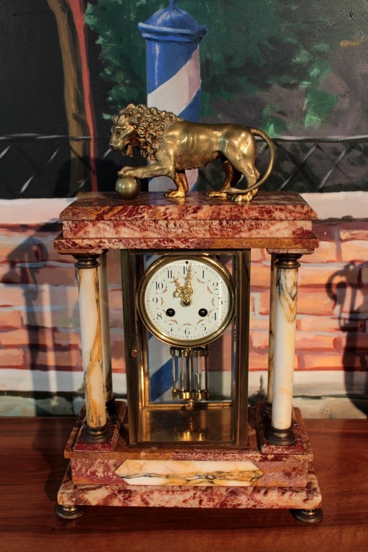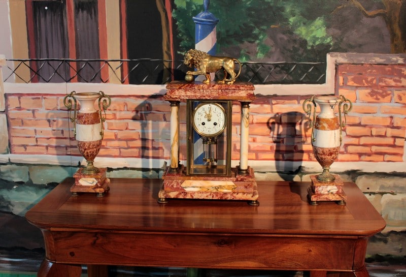 Garniture de cheminée en marbre rose orangé de style Empire composée d’une pendule cage encadrée de 4 colonnes blanches, surmontée d’un Lion en bronze et de deux pendants en forme de vases ornés de bronze. Le cadran de la pendule est en émail et son balancier à mercure. Époque : fin XIXe