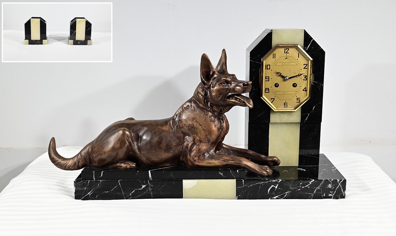 Belle garniture de cheminée en marbre noir de Cihigue, contrasté de plaques d’onyx, comprenant une horloge et deux cassolettes. Elle possède une grande sculpture en régule figurant un grand chien allongé, joyeux et oreilles dressées, semblant regarder son maître. Le cadran octogonal est estampillé de nom de l’horloger et de sa ville « A. Guyon Cholet ». Les cassolettes de même composition sont pourvues d’une cavité en partie supérieure.