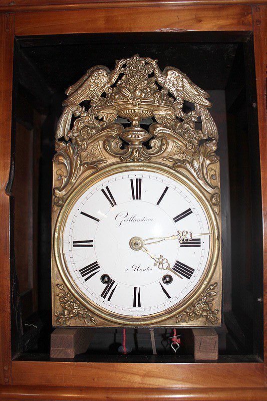Horloge de parquet Louis XV en merisier massif – façade et côtés – reposant sur des pieds avants galbés et pieds arrières droits. Le cadran, en tôle émaillée, est signé ‘GOILLANDEAU à Nantes’. La tête du cadran, en laiton repoussé, est à décor d’oiseaux, de coupe de fruits et de rinceaux.