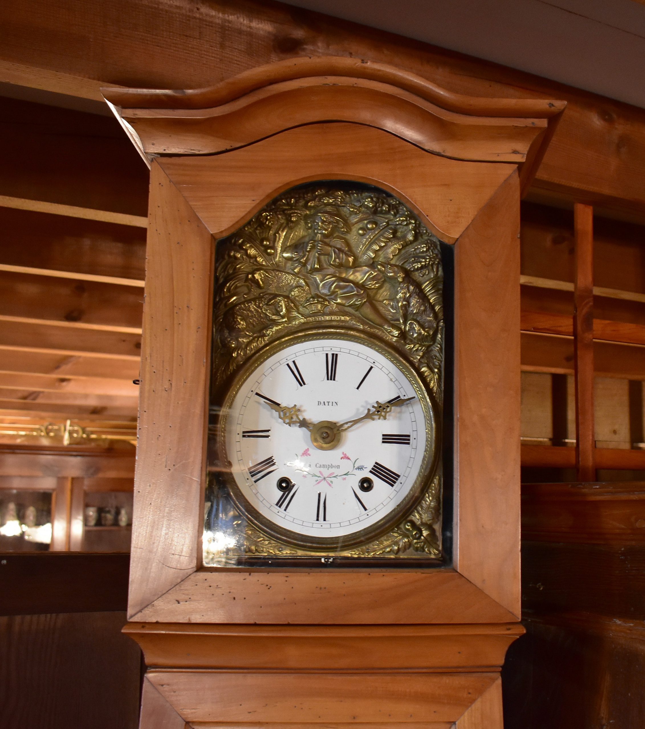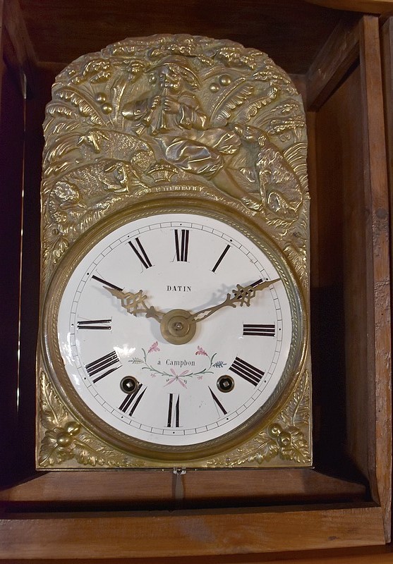 Son cadran en émail, avec chiffres romains, est décoré d’un motif de feuillage , le nom et l’adresse de l’horloger l’ayant vendue est inscrit dessus :’DATIN à Campbon’ . Son entourage est en laiton repoussé à décor pastoral (jeune berger jouant du pipeau, moutons et feuillages).