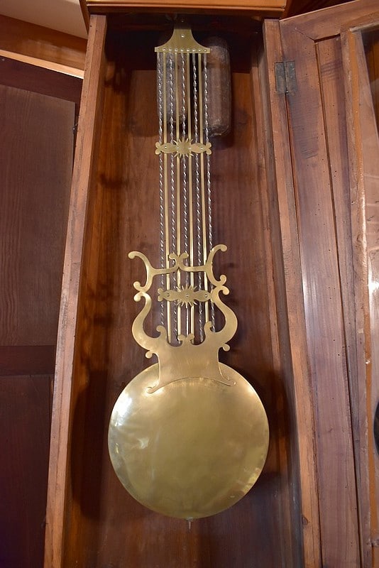 Le balancier, de forme lyre, est également en laiton.