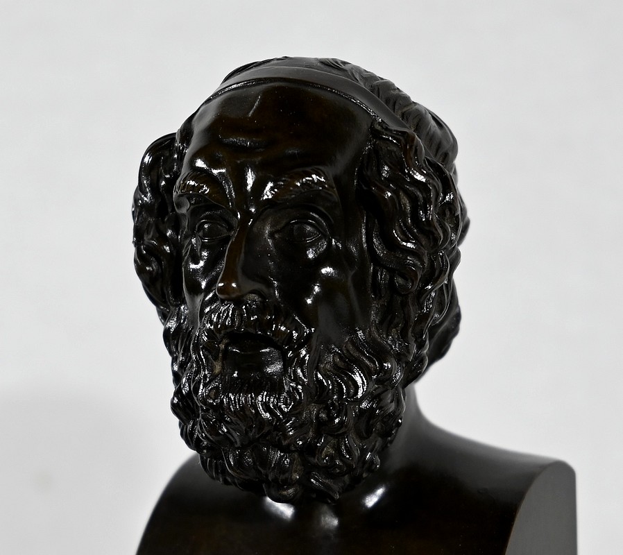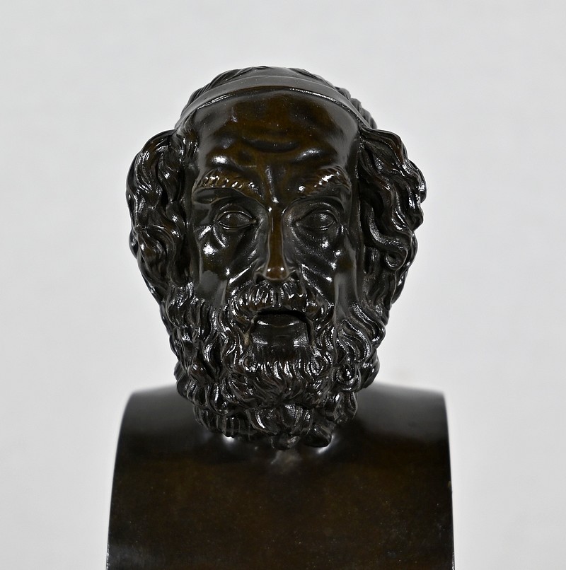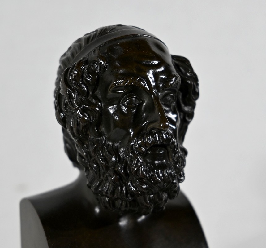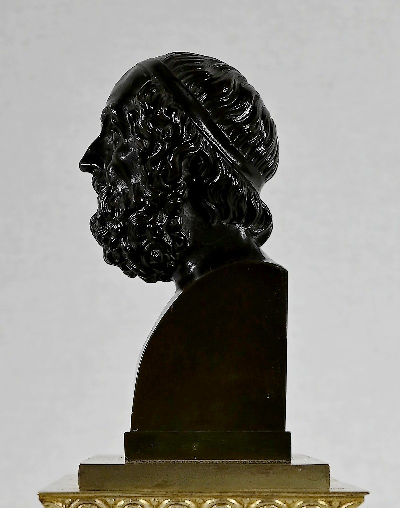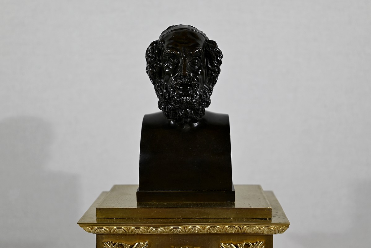Il est sommé d’un buste d’Homère en bronze à patine brune.