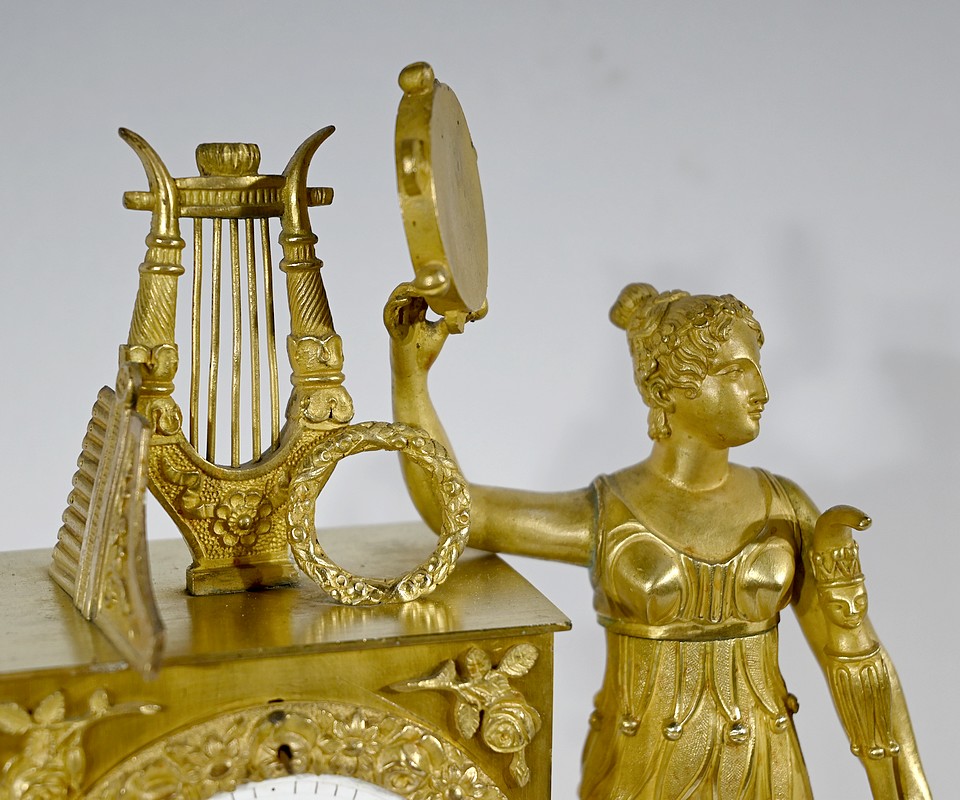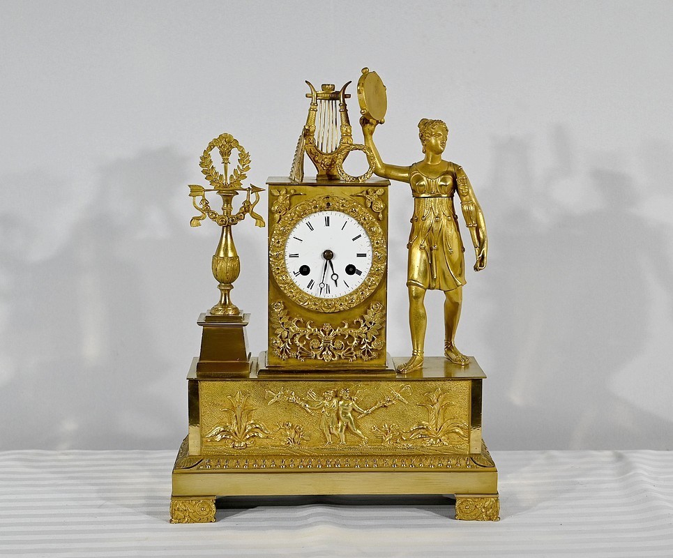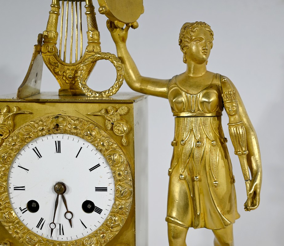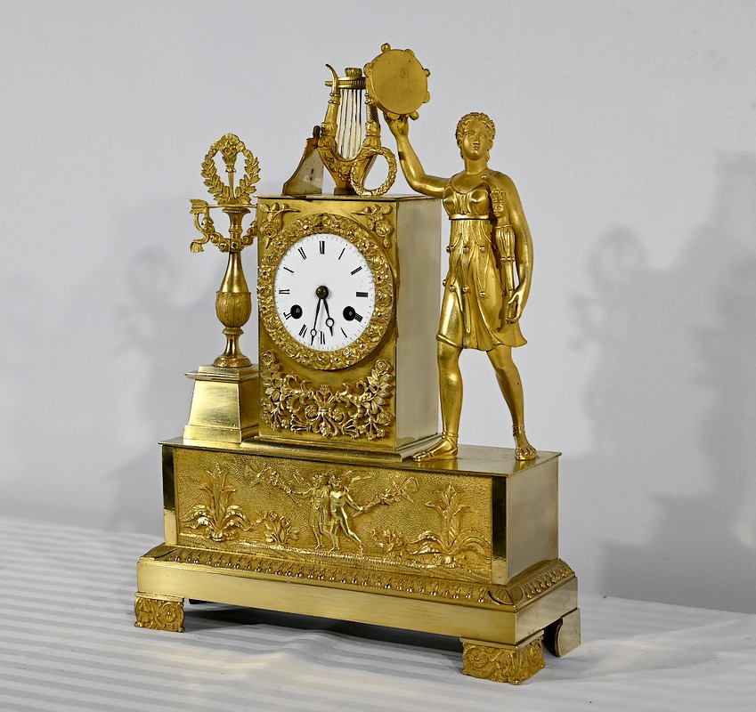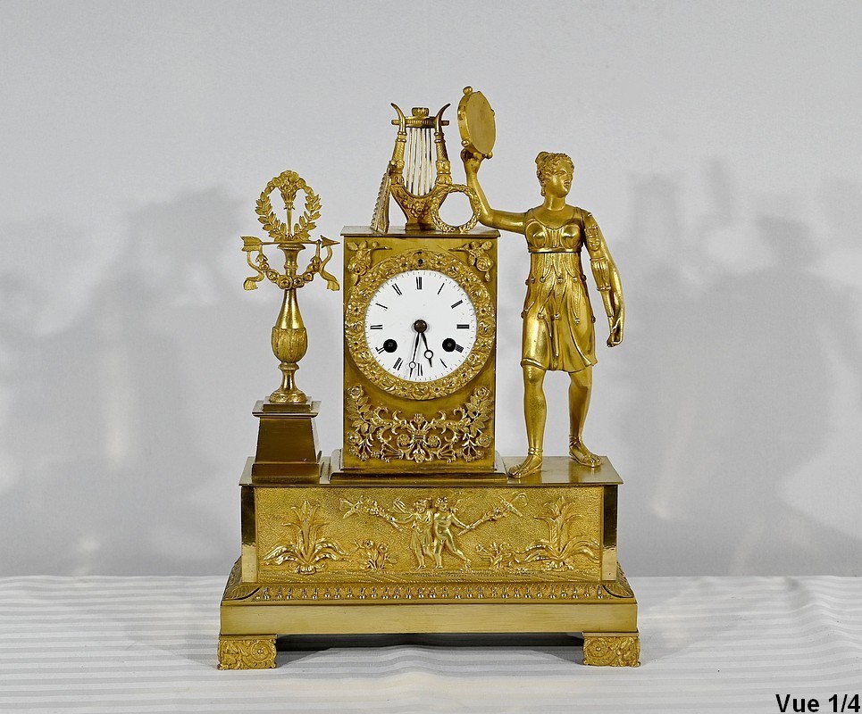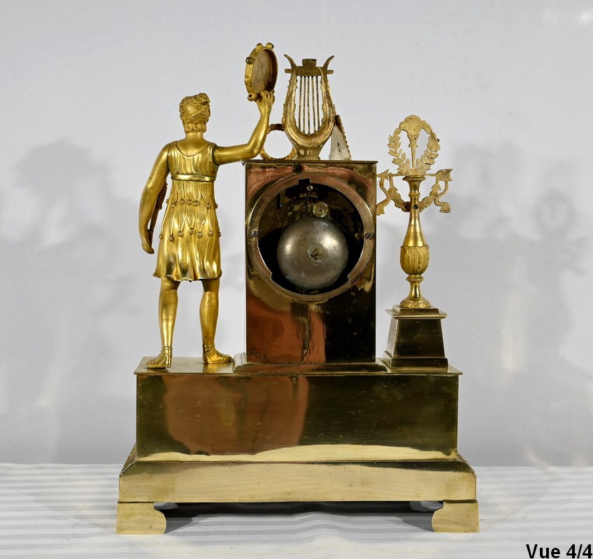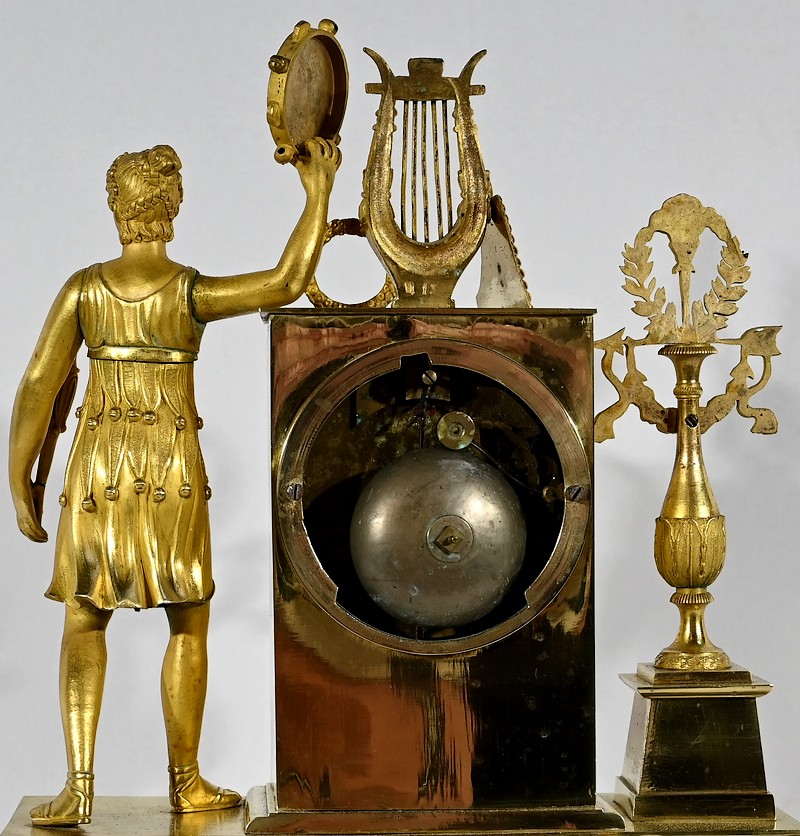 Ce garde temps figure une déesse, sceptre à la main et levant un tambourin. Elle est accompagnée d’une lyre, d’une flûte de pan, d’un vase sommé d’une guirlande et d’une flèche.