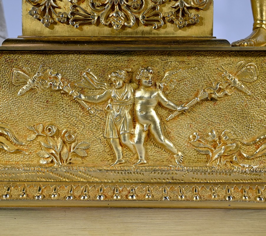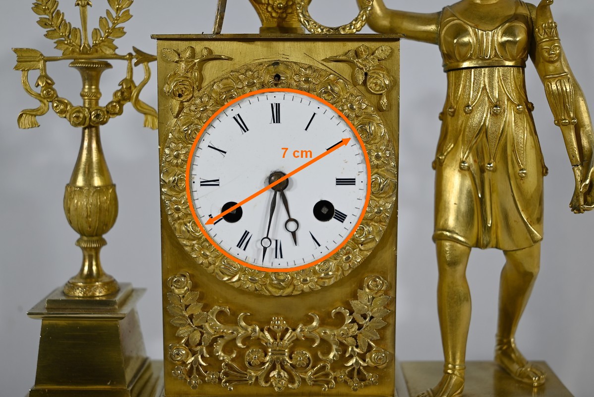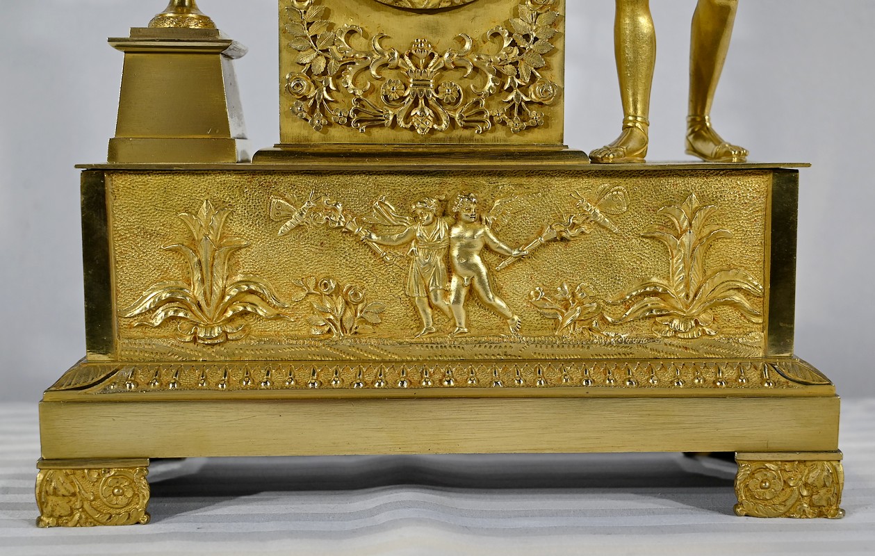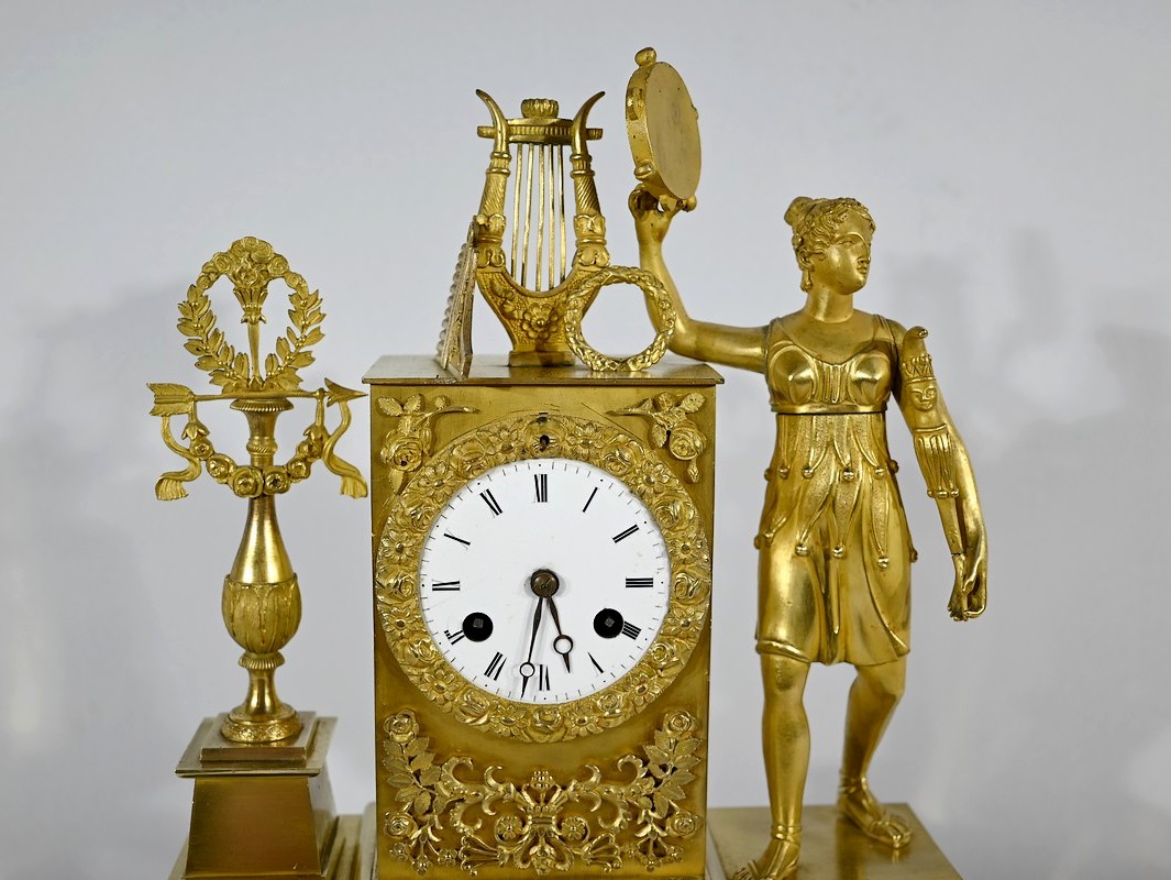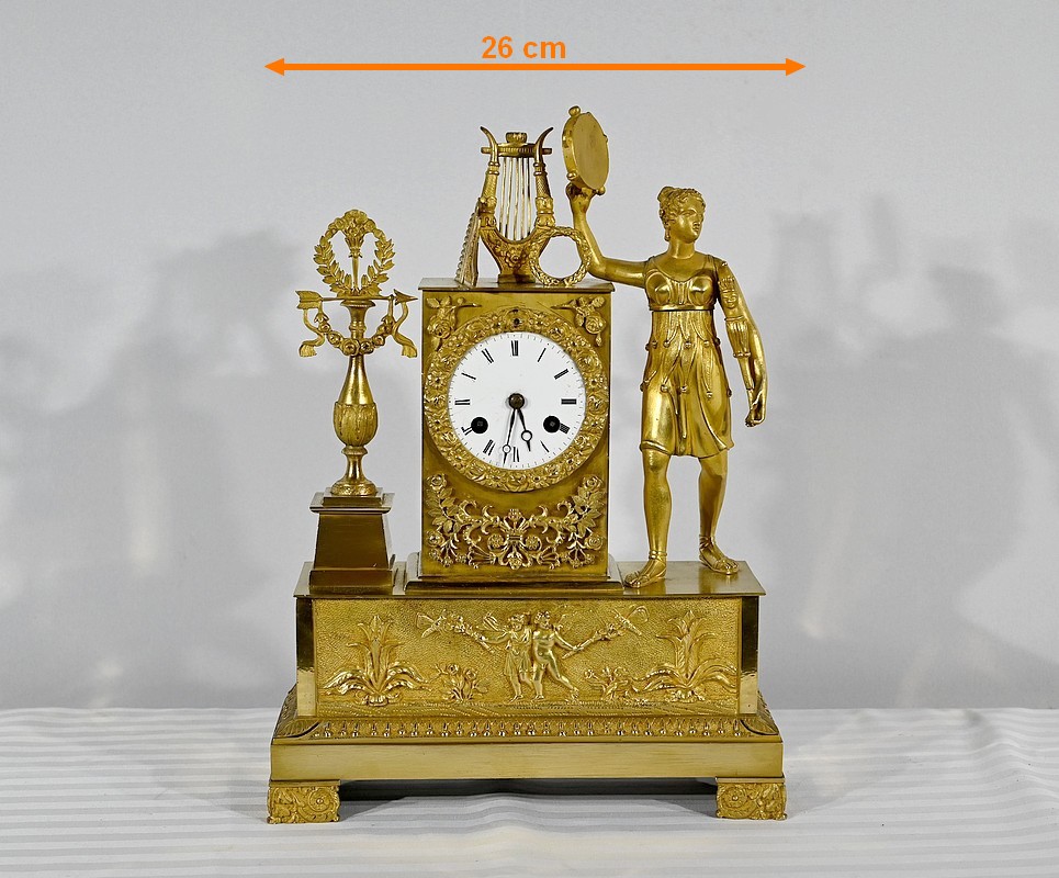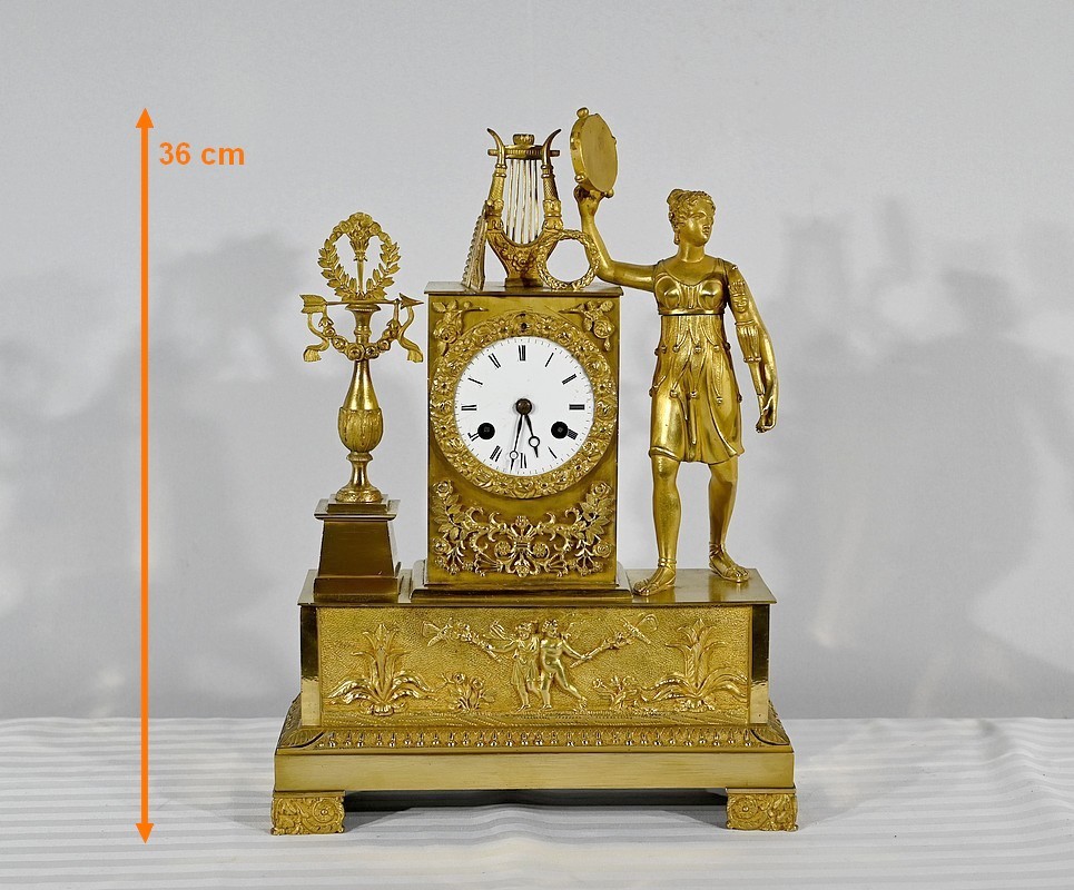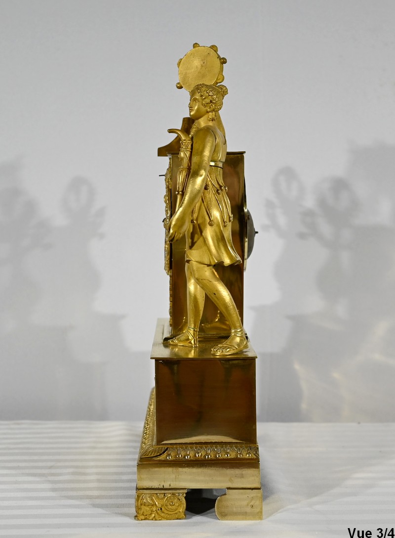 Ce garde temps figure une déesse, sceptre à la main et levant un tambourin. Elle est accompagnée d’une lyre, d’une flûte de pan, d’un vase sommé d’une guirlande et d’une flèche.