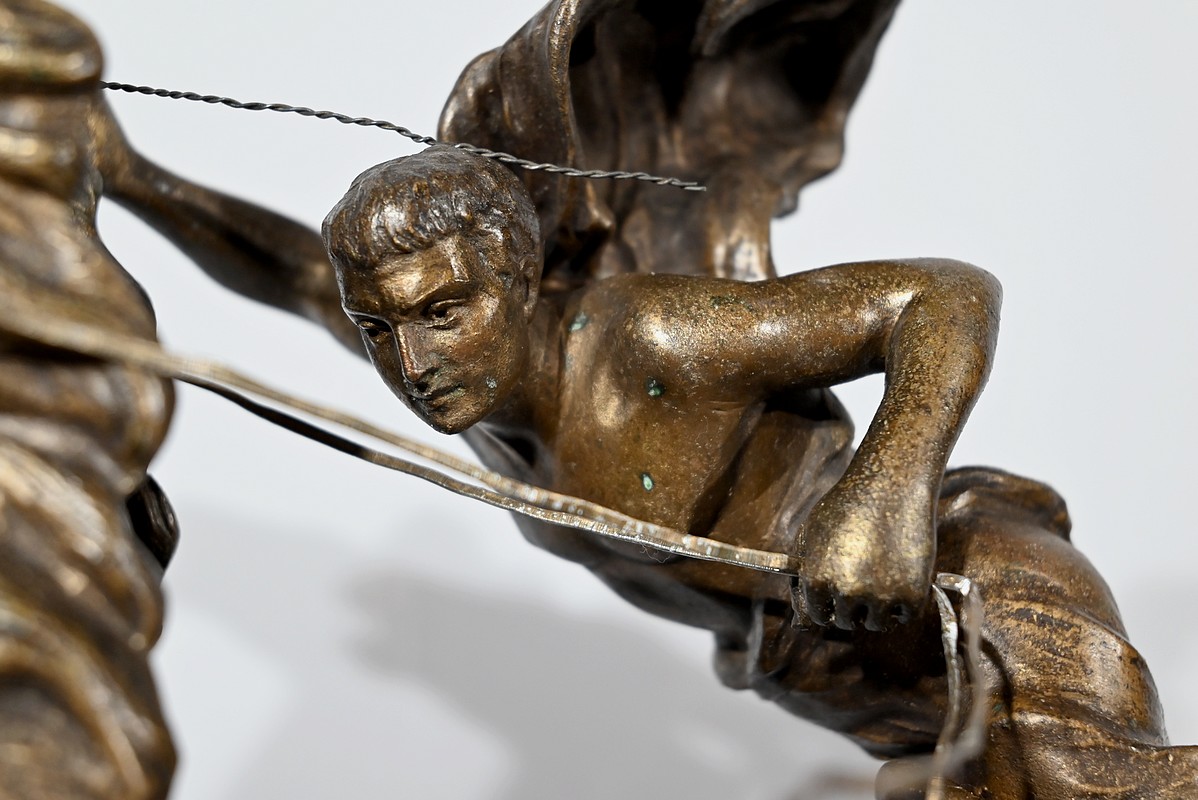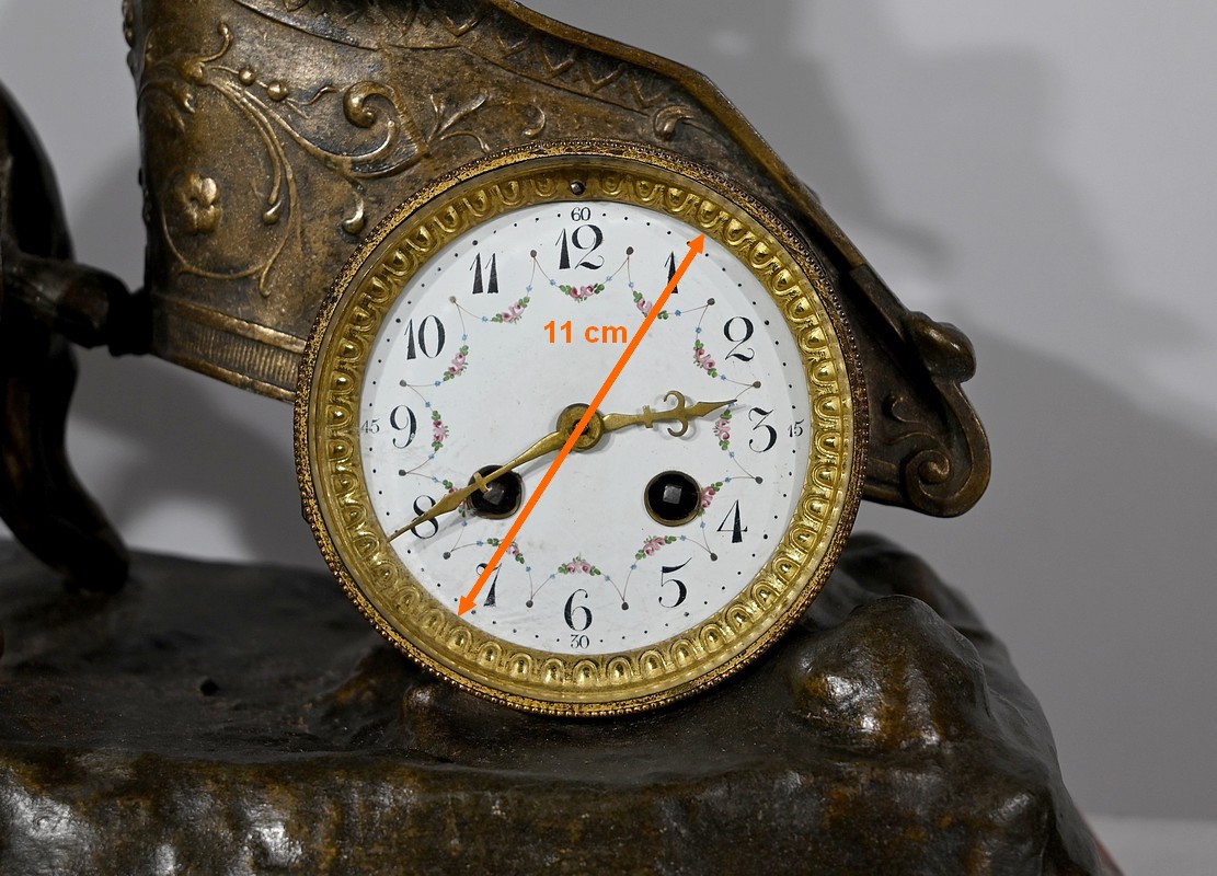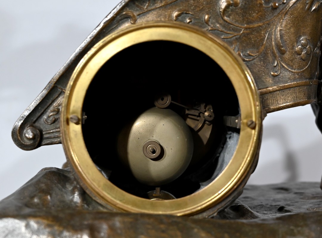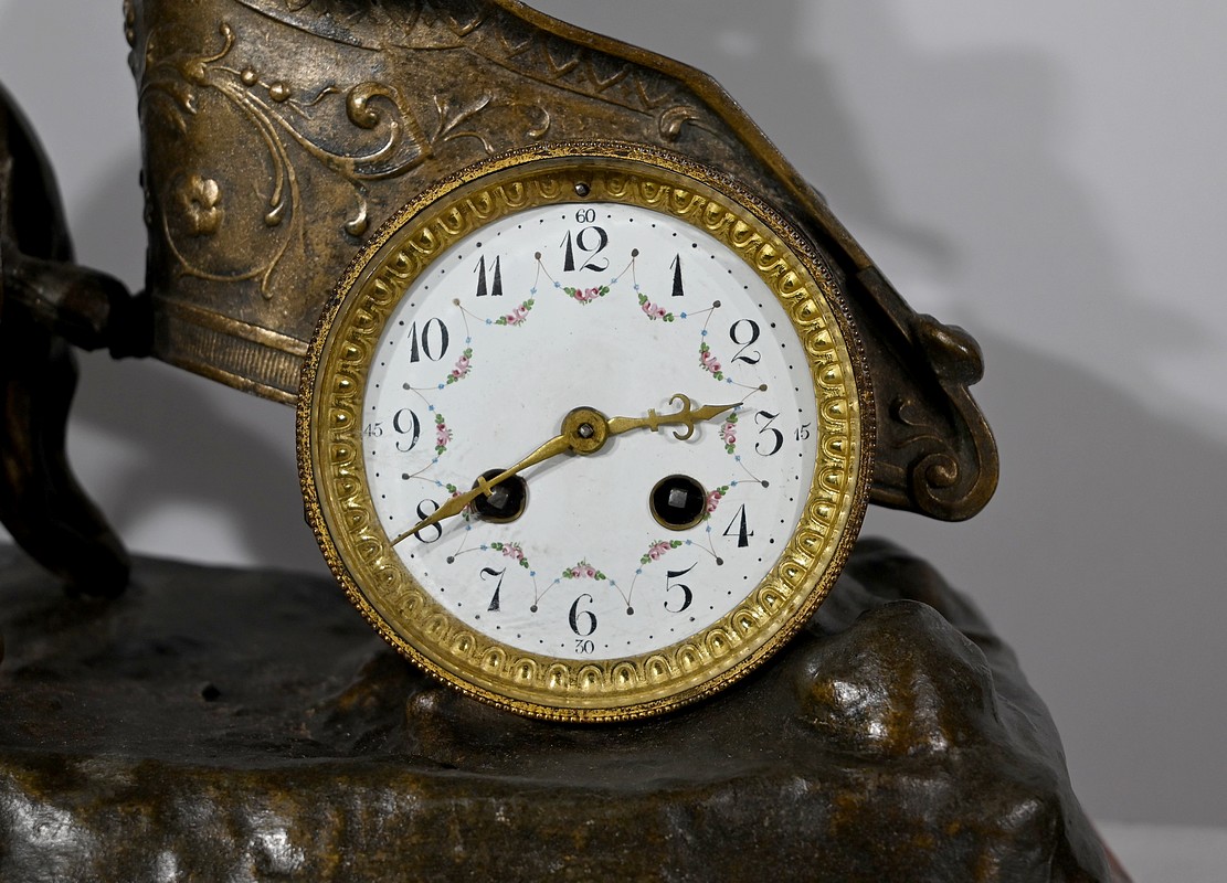 Horloge à remontoir en régule, à patine mordorée, du sculpteur français Xavier Raphanel (1876-1957). Chevalier de la Légion d’honneur, il est connu pour ses œuvres chryséléphantines, une technique qu’il maîtrise à la perfection.