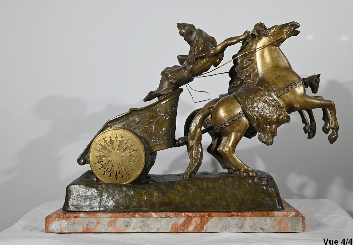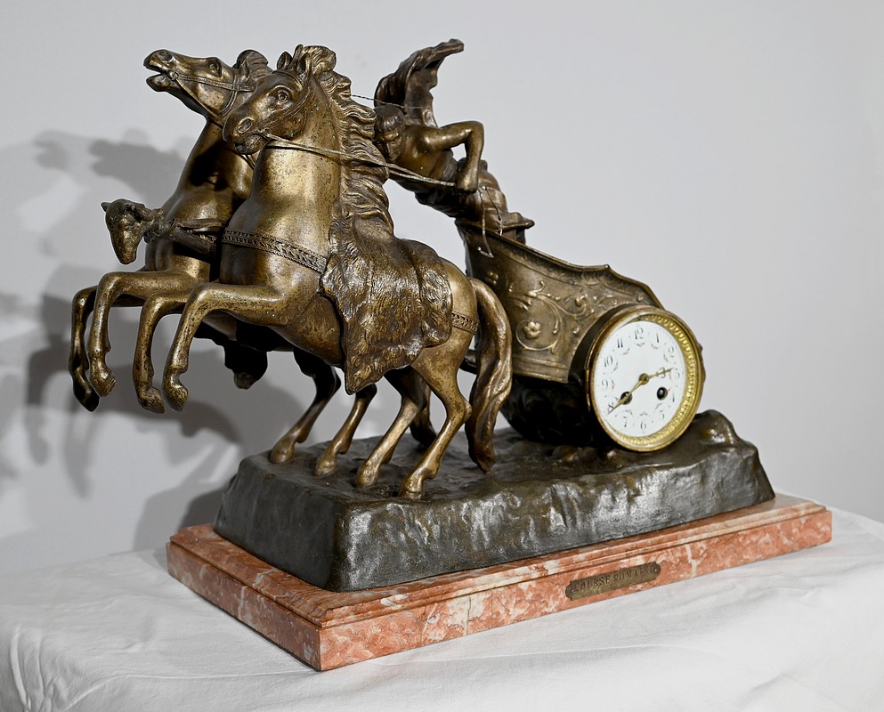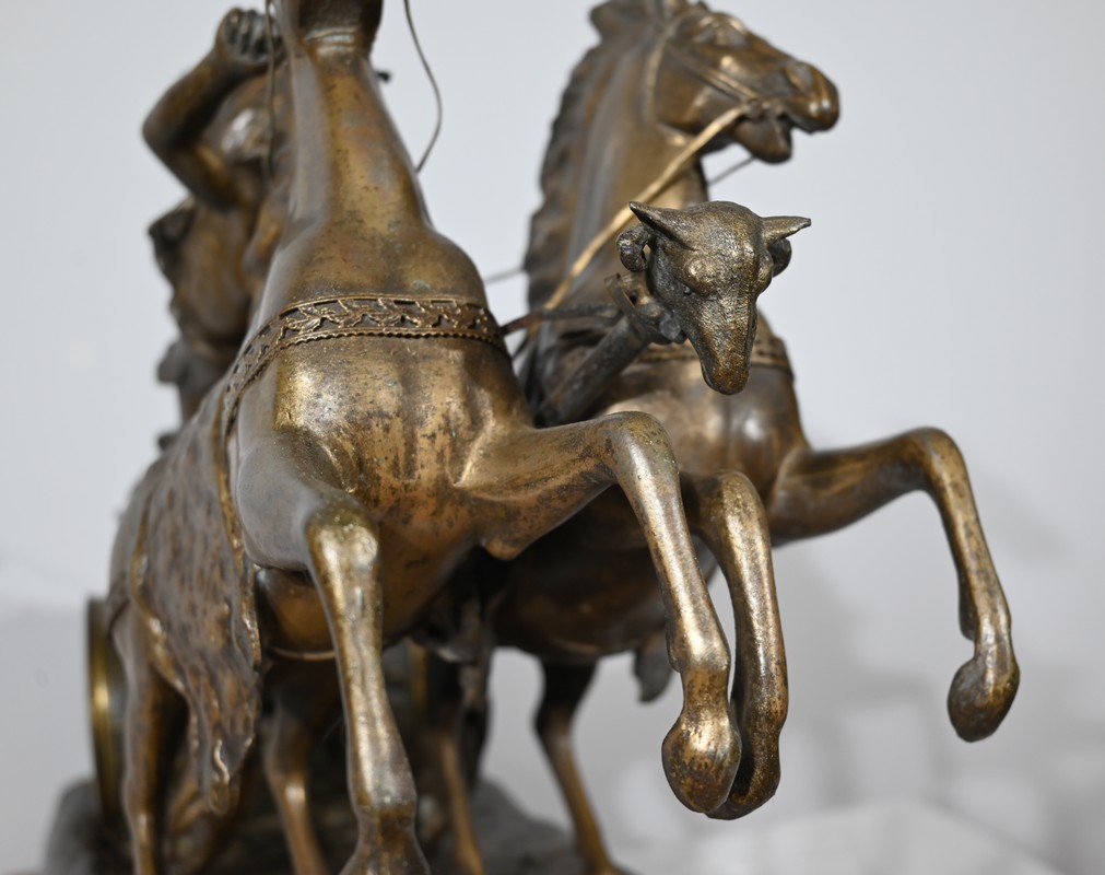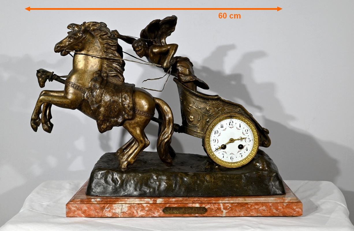L’œuvre « Course Romaine » figure l’épreuve reine des jeux du cirque durant l’antiquité. Elle présente un char, à décors de volutes, tiré par deux chevaux cabrés. Ces équidés sont dirigés par un aurige vêtu d’une toge flottant dans les airs.