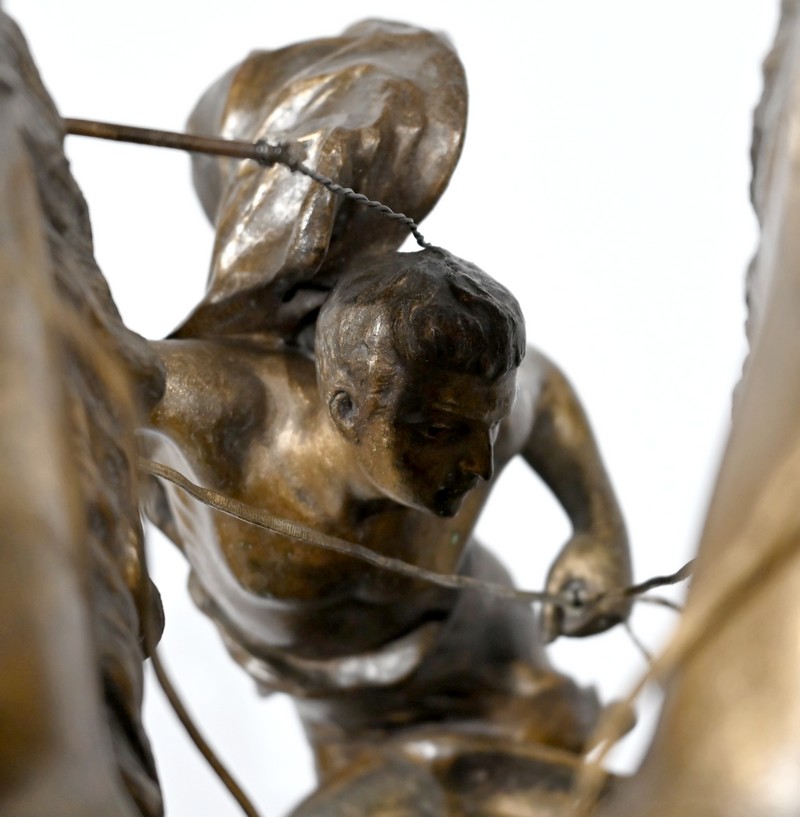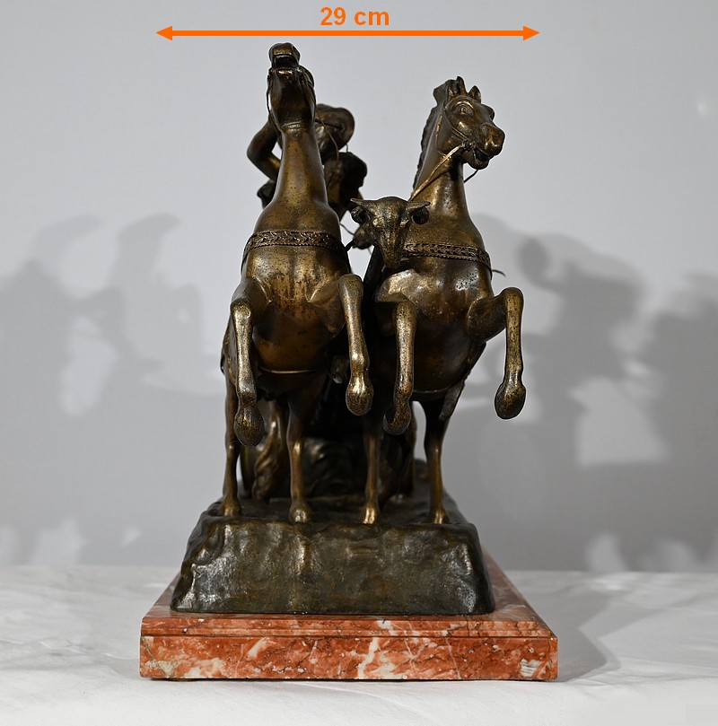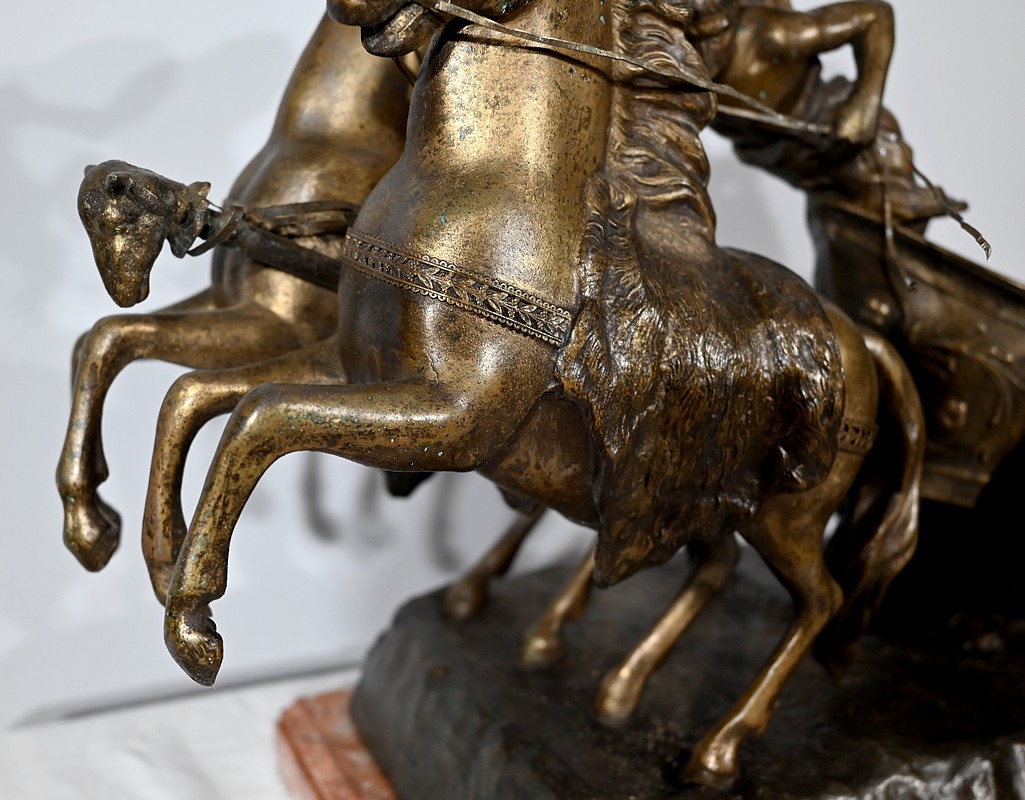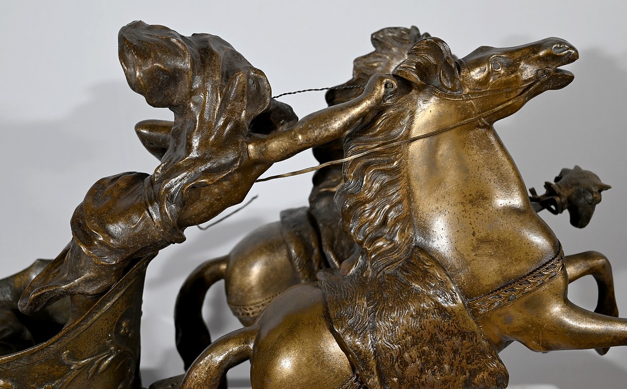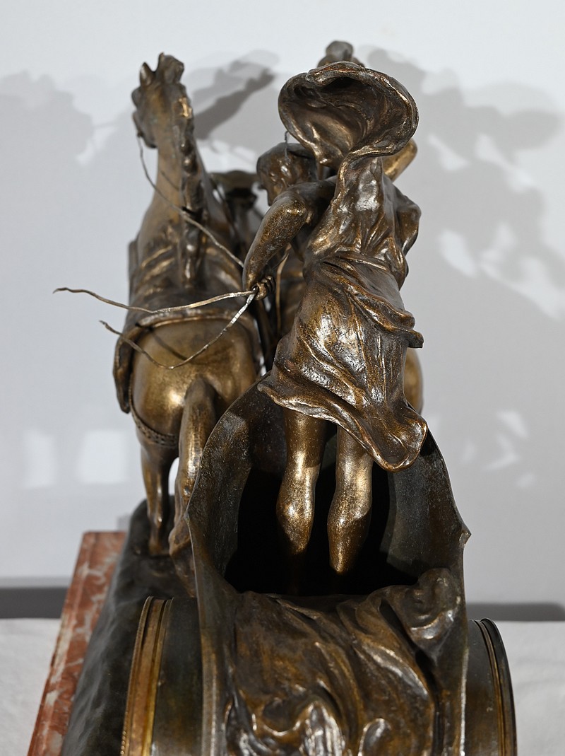 L’œuvre « Course Romaine » figure l’épreuve reine des jeux du cirque durant l’antiquité. Elle présente un char, à décors de volutes, tiré par deux chevaux cabrés. Ces équidés sont dirigés par un aurige vêtu d’une toge flottant dans les airs.