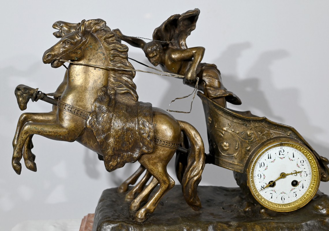 L’horloge forme l’une des roues du char. Son cadran est blanc émaillé et décoré de guirlandes de fleurs. Les heures et les quarts d’heures sont gradués en chiffres arabes.
