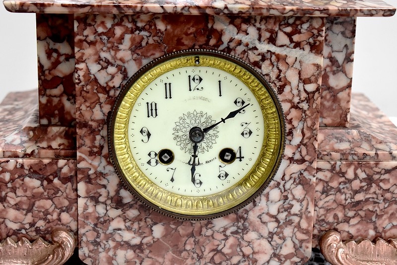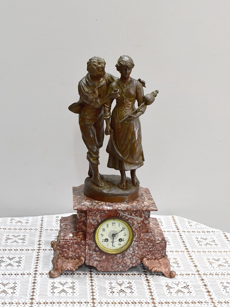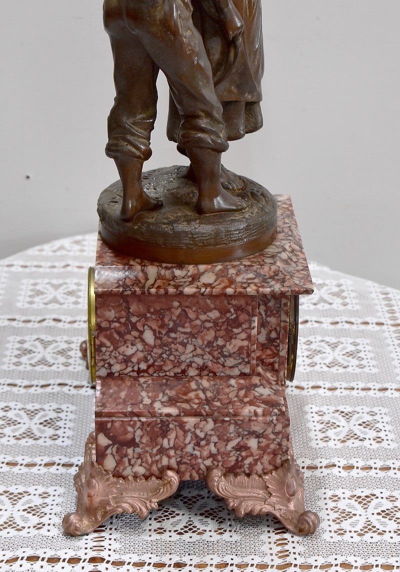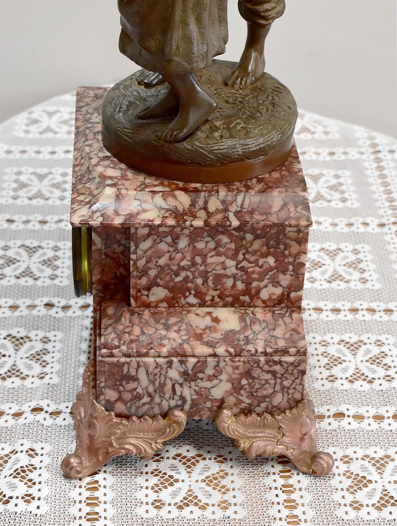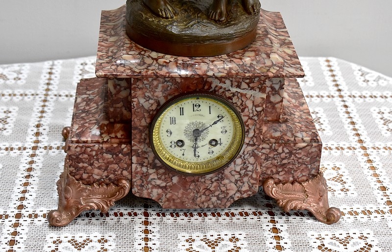 Pendule de cheminée en marbre rouge surmontée de sa sculpture en Régule signée Victor Rousseau (1865 – 1954).