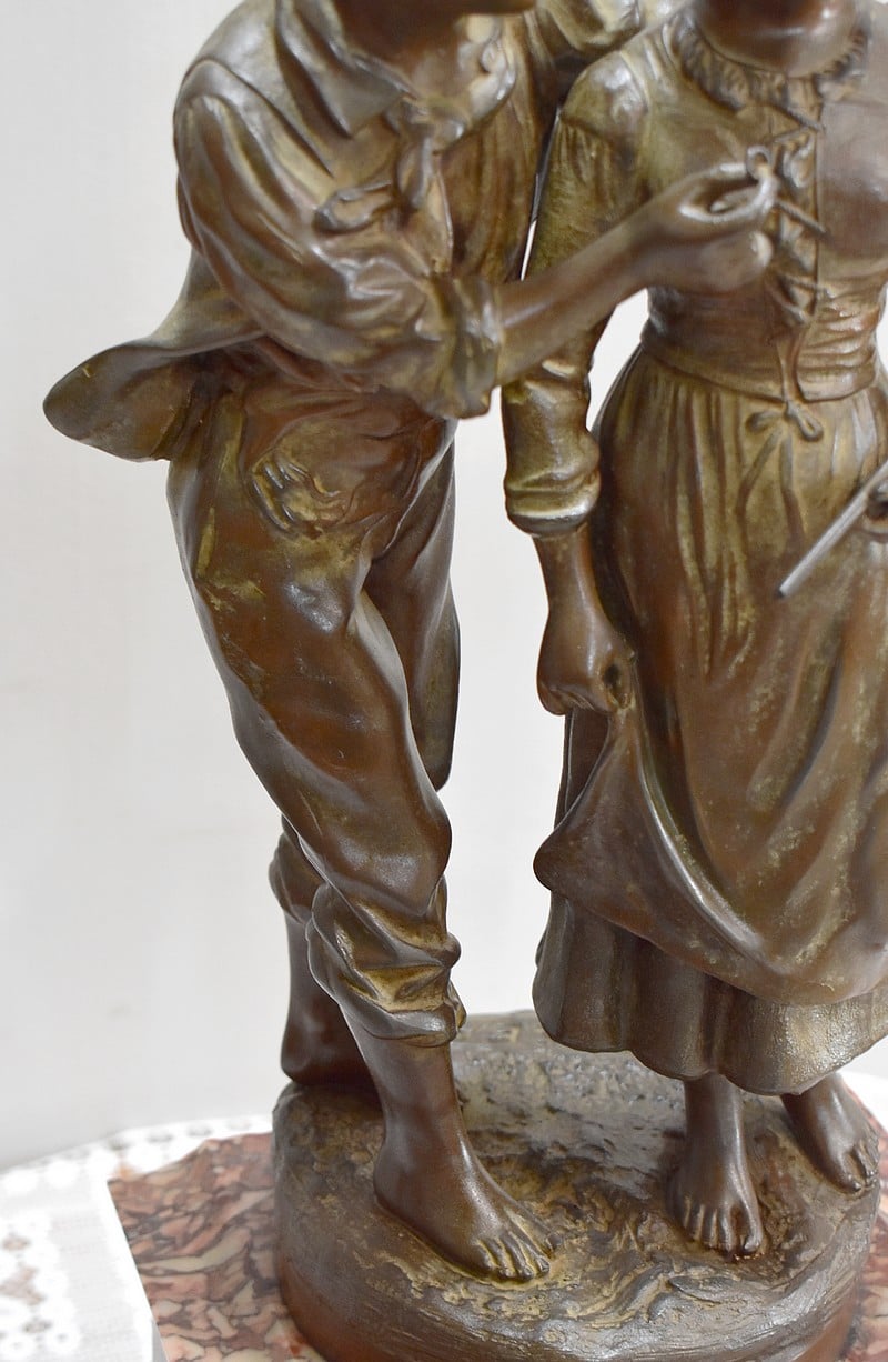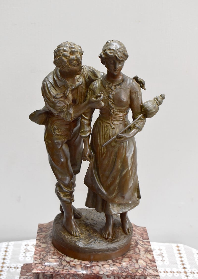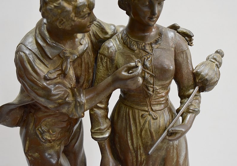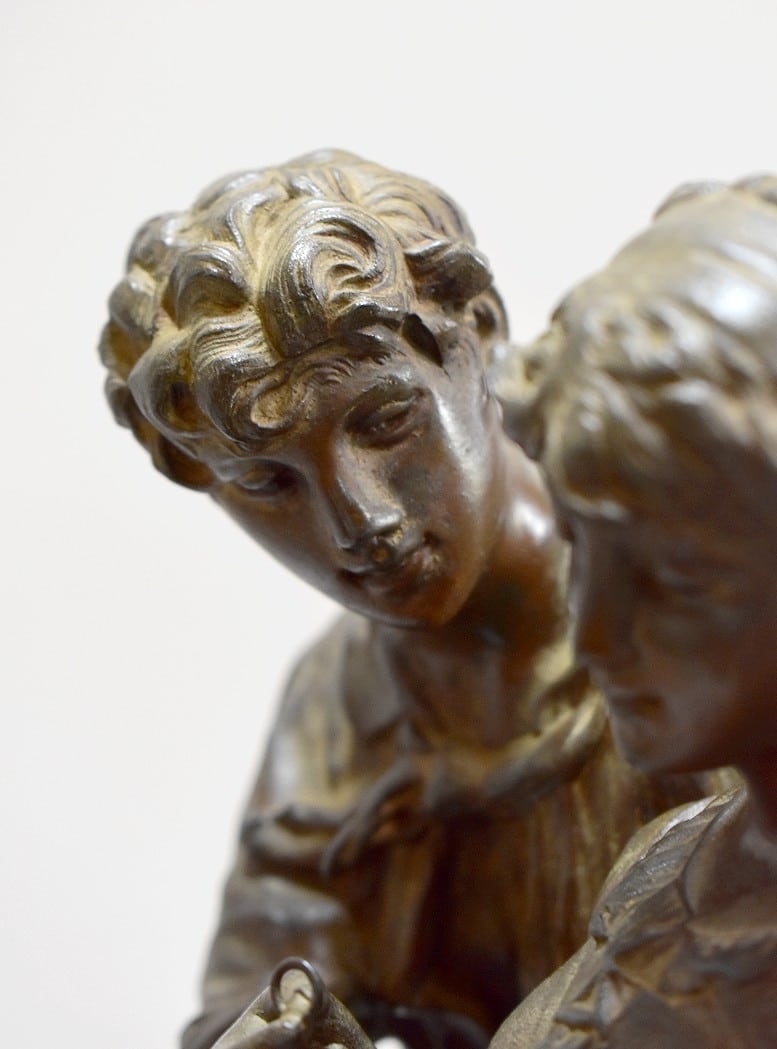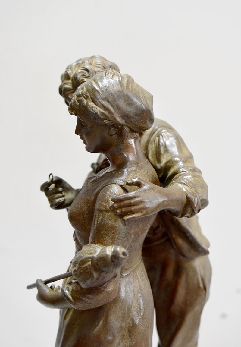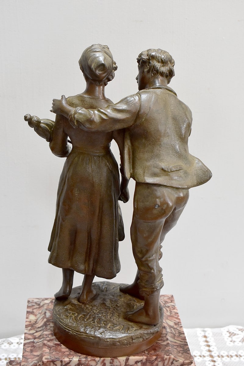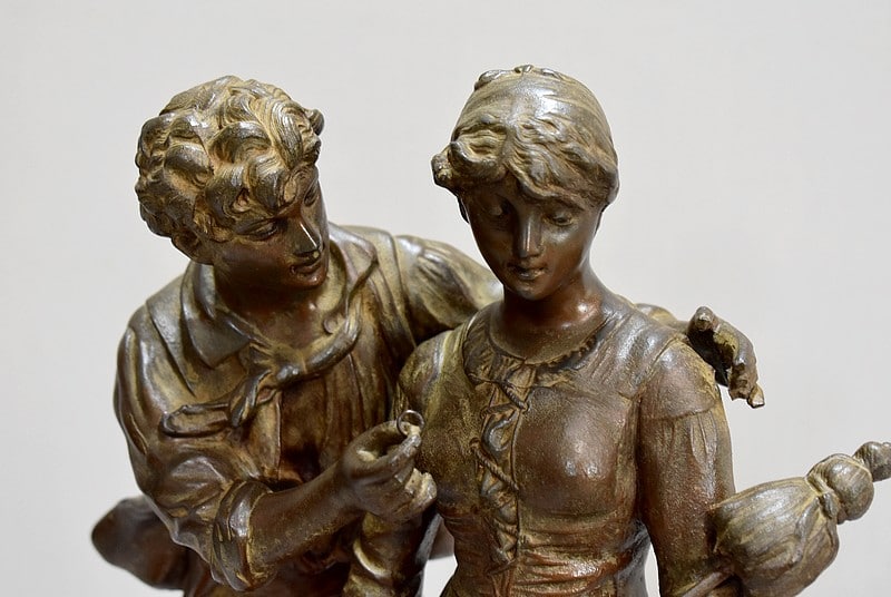La sculpture représente un jeune homme enlaçant une jeune femme indécise de son bras gauche tout en lui proposant une alliance.