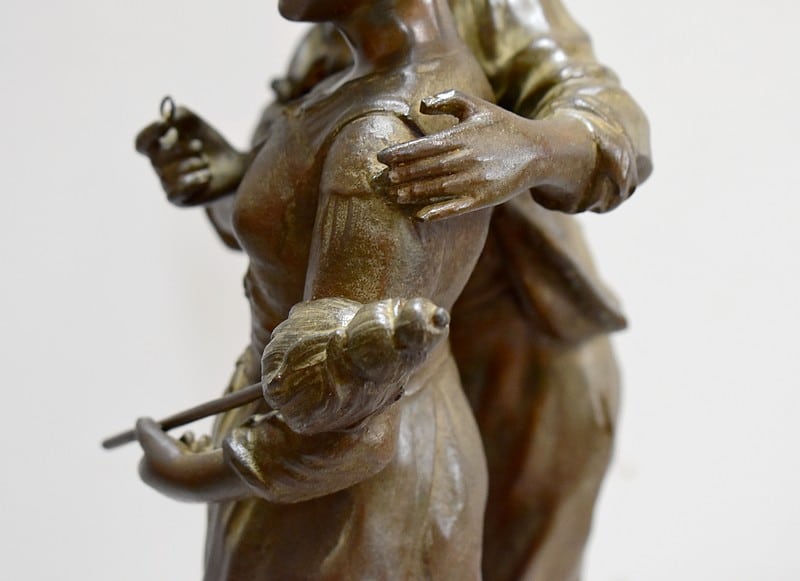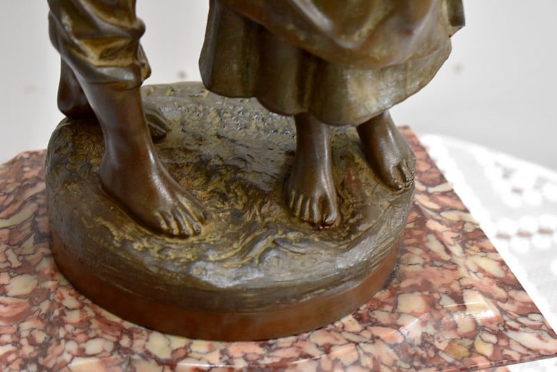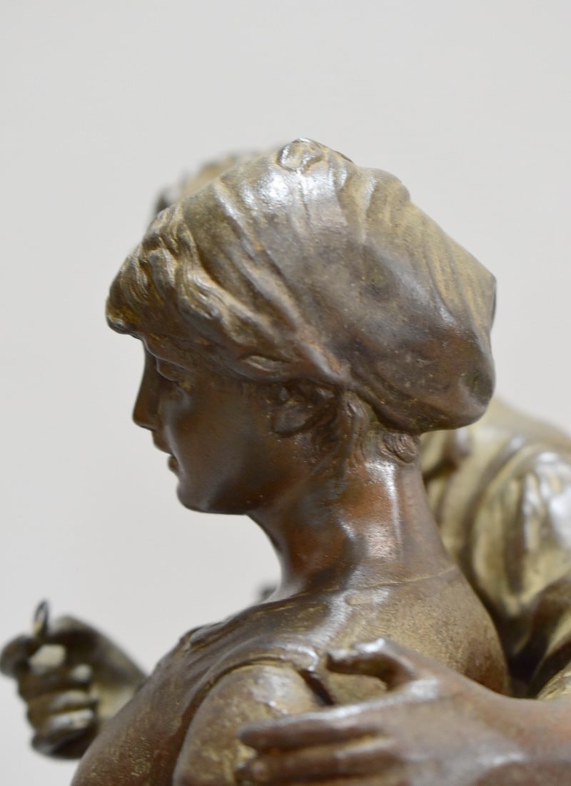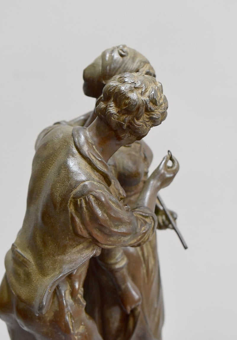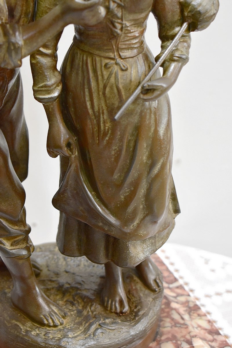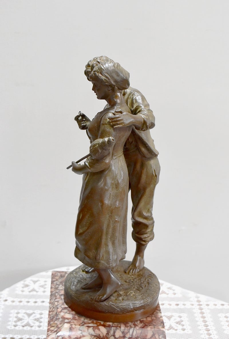 La sculpture représente un jeune homme enlaçant une jeune femme indécise de son bras gauche tout en lui proposant une alliance.