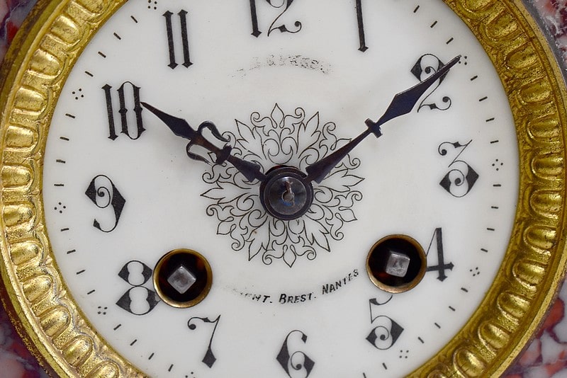 La pendule découpée de façon géométrique arbore un cadran en son centre doté de chiffres arabes et signée ‘Lorient – Brest – Nantes’.
