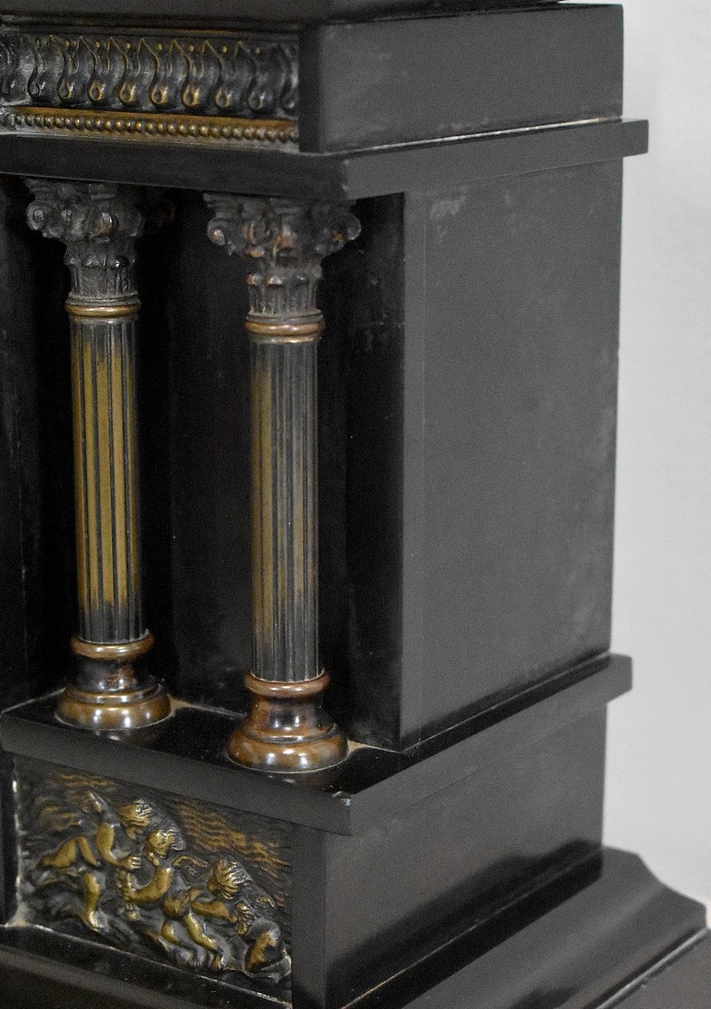Elle a pour forme celle d’un panthéon garni notamment de 4 colonnes détachées de part et d’autres du cadran. Celui-ci, non signé est à chiffres arabes et possède un mécanisme particulier.