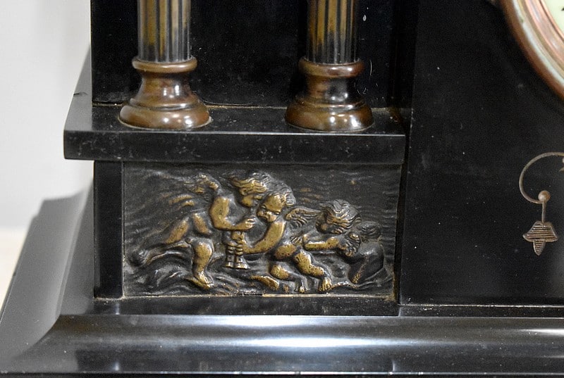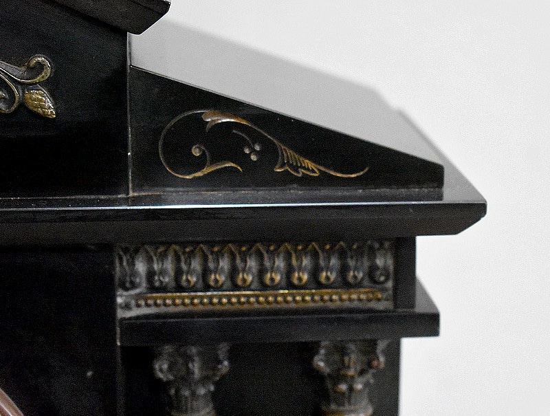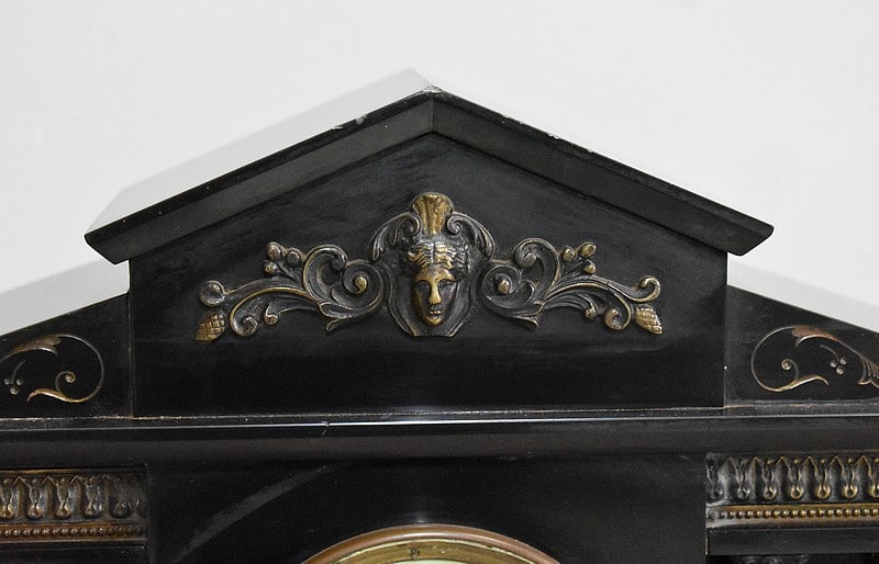 La façade est garnie en partie haute d’un masque de personnage entourés de rinceaux et pommes de pin, de frises surplombant les colonnes détachées ainsi que d’un motif en relief à décors de 3 chérubins de chaque côté. Toutes ces ornementations sont en laiton vieilli, s’ajoutant à des gravures dans le marbre qui ont été dorées.