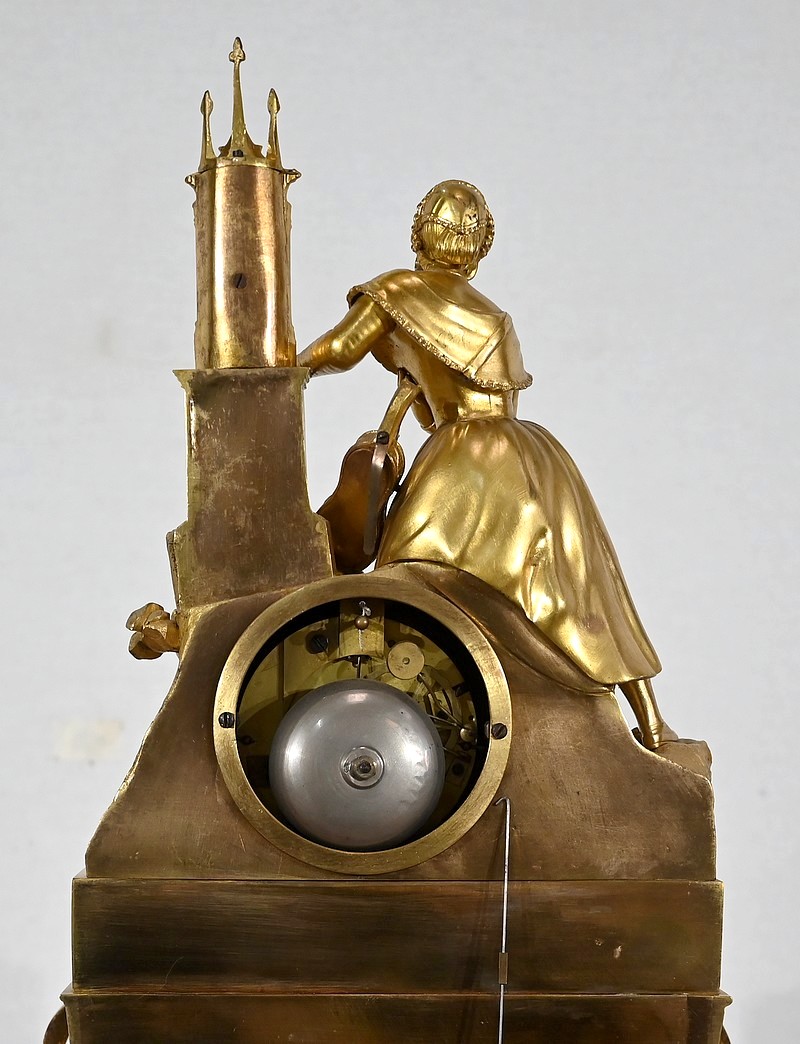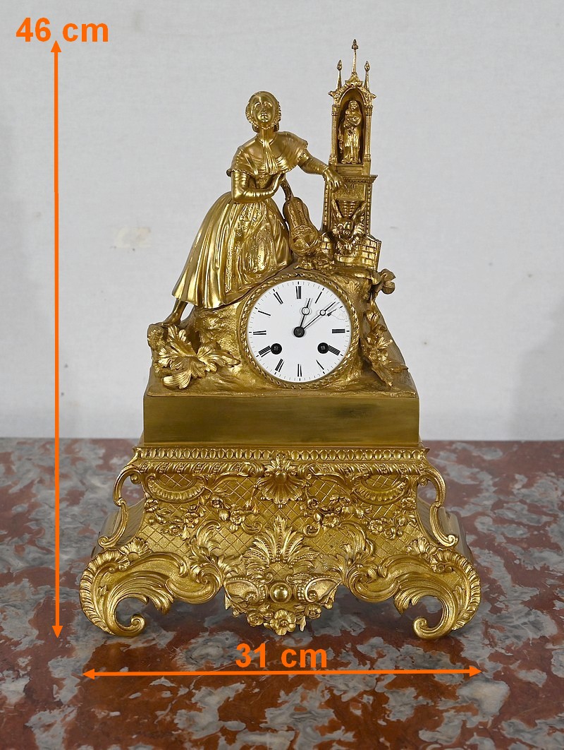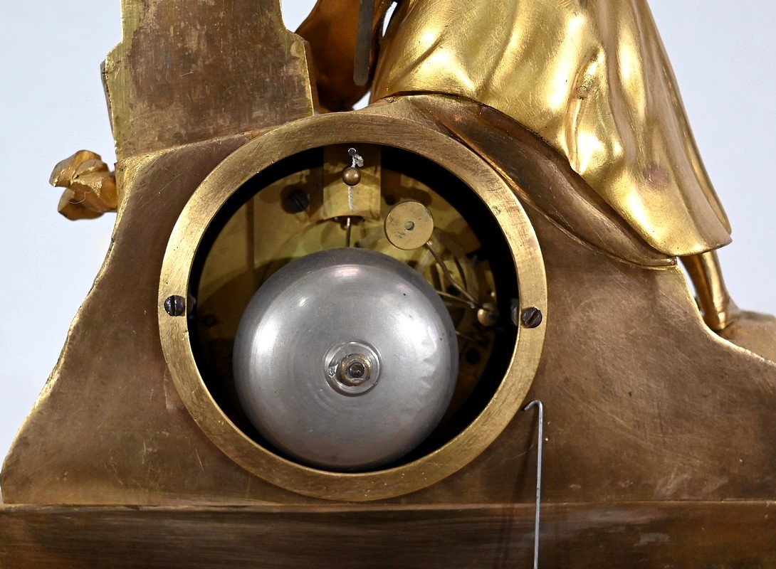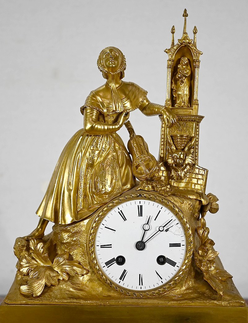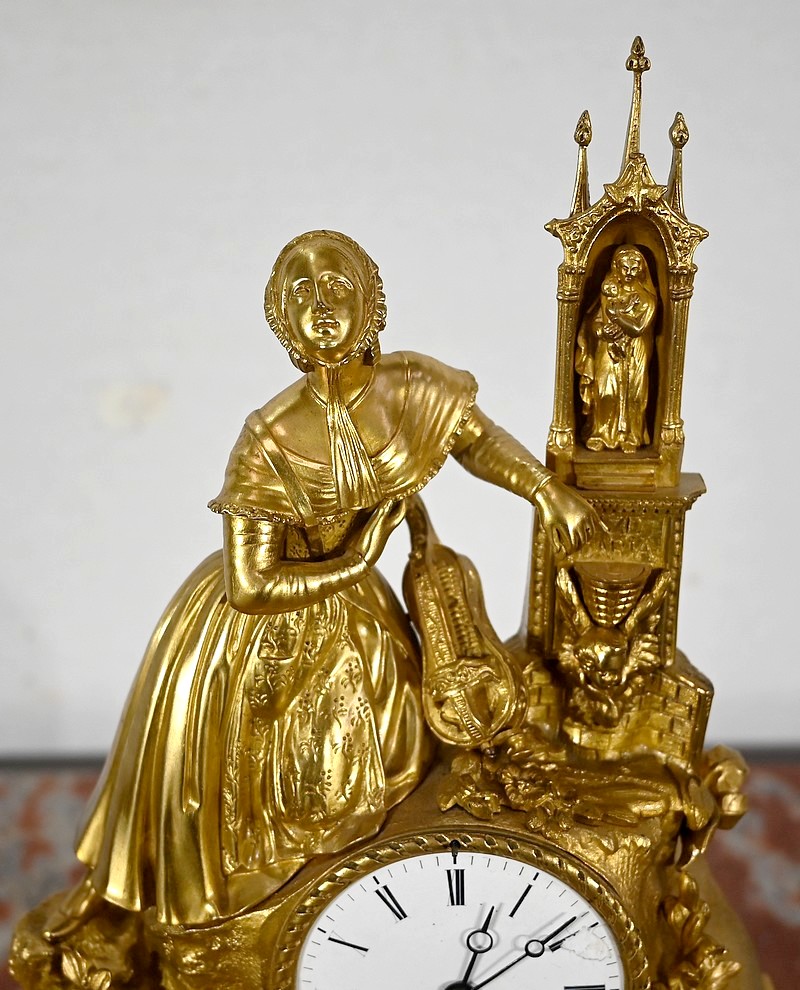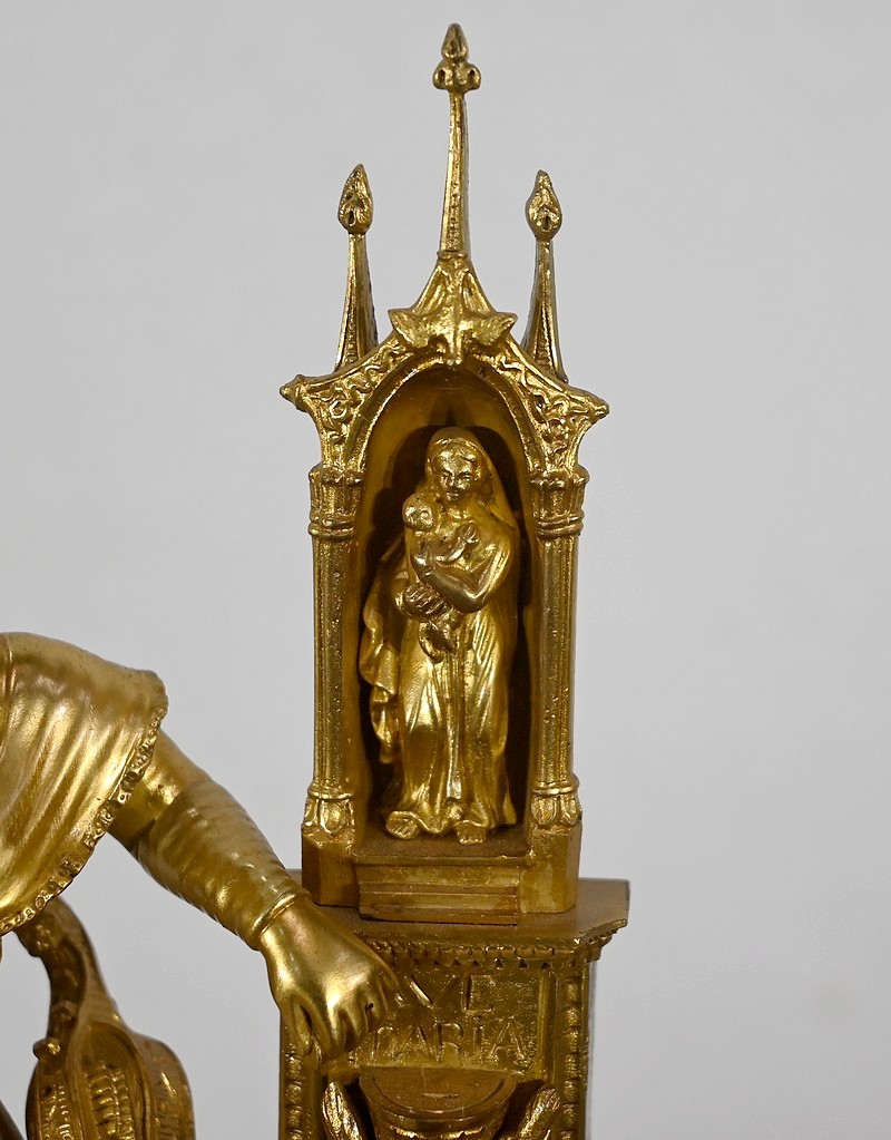Pendule en bronze doré finement ciselé, à décor d’une jeune femme pieuse en contemplation. L’élégante demoiselle est vêtue d’une tenue simple mais raffinée. Elle est coiffée d’un bonnet de dentelle qui cache ses longs cheveux tenus en un chignon sobre. Son joli visage levé vers le ciel, elle pose délicatement sa main droite sur son cœur, comme touchée par la grâce. Elle est accoudée à un bénitier orné d’un ange et surmonté d’une alcôve religieuse entourant la statue d’une vierge à l’enfant. L’inscription « AVE MARIA » est présente et souligne le caractère religieux de la scène.