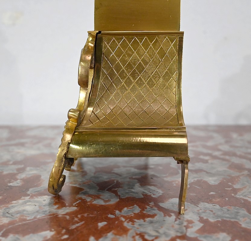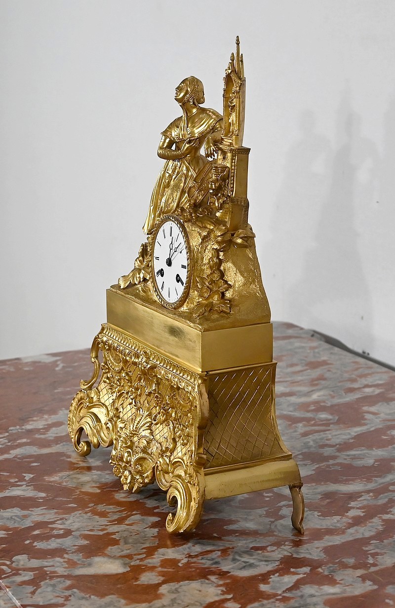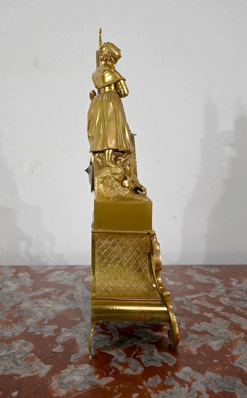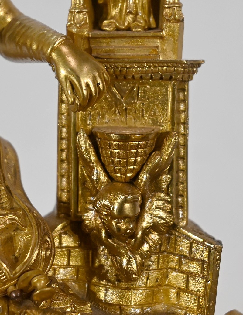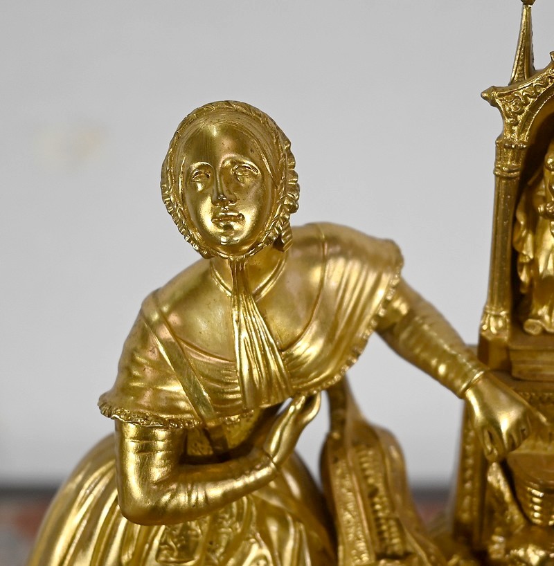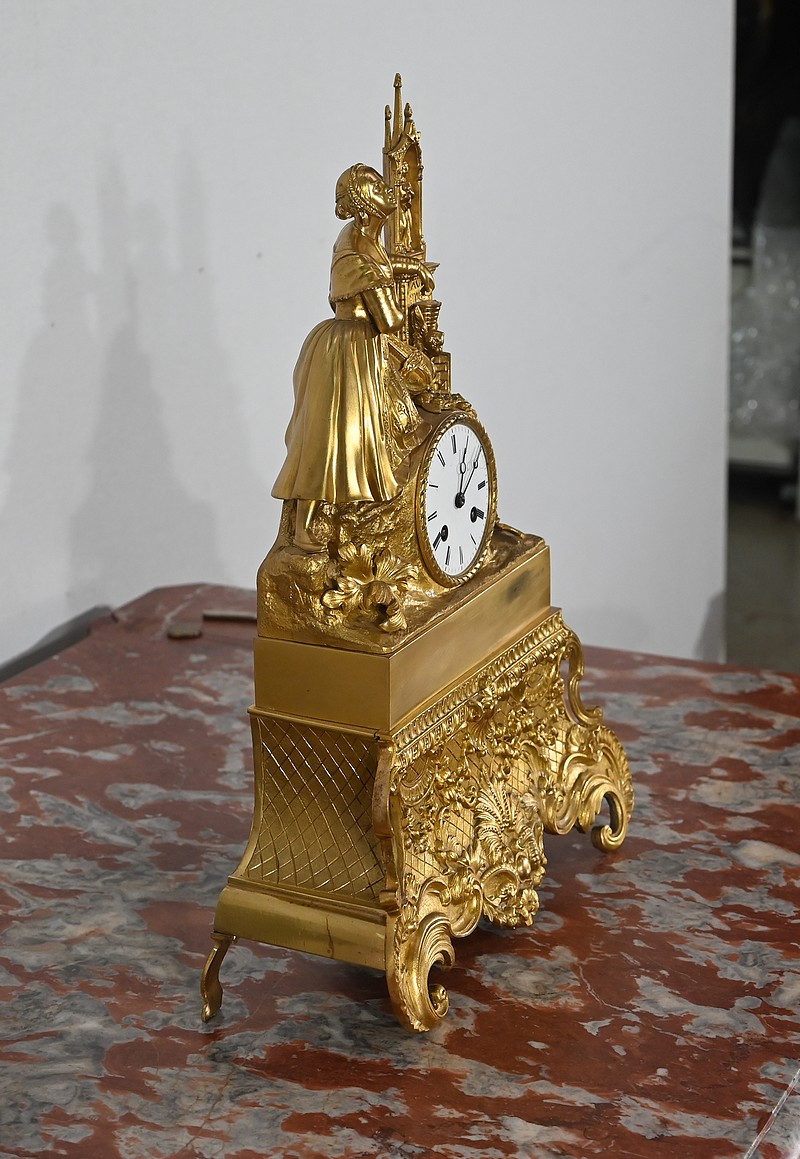 Pendule en bronze doré finement ciselé, à décor d’une jeune femme pieuse en contemplation. L’élégante demoiselle est vêtue d’une tenue simple mais raffinée. Elle est coiffée d’un bonnet de dentelle qui cache ses longs cheveux tenus en un chignon sobre. Son joli visage levé vers le ciel, elle pose délicatement sa main droite sur son cœur, comme touchée par la grâce. Elle est accoudée à un bénitier orné d’un ange et surmonté d’une alcôve religieuse entourant la statue d’une vierge à l’enfant. L’inscription « AVE MARIA » est présente et souligne le caractère religieux de la scène.
