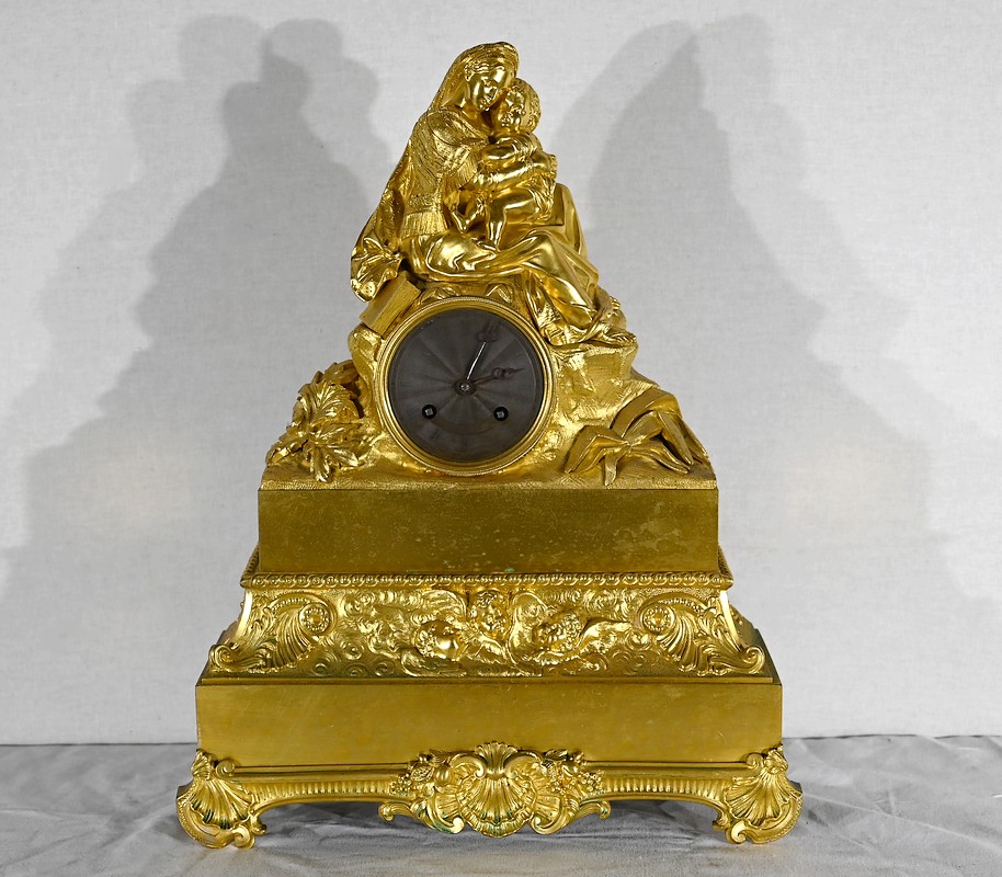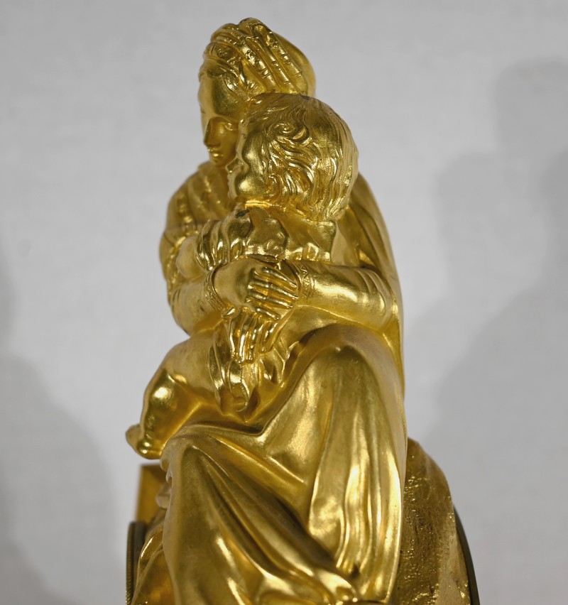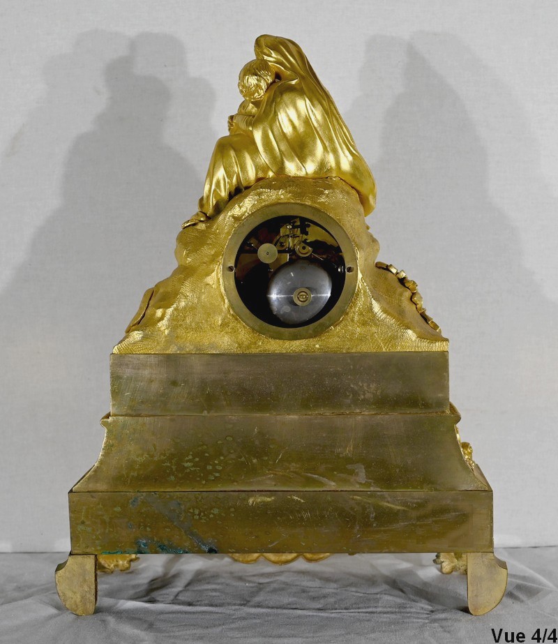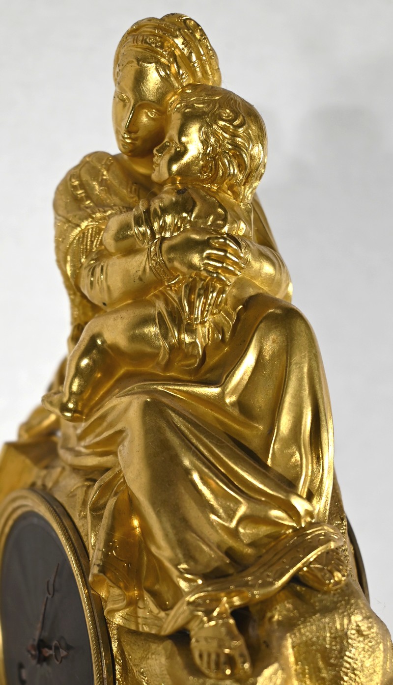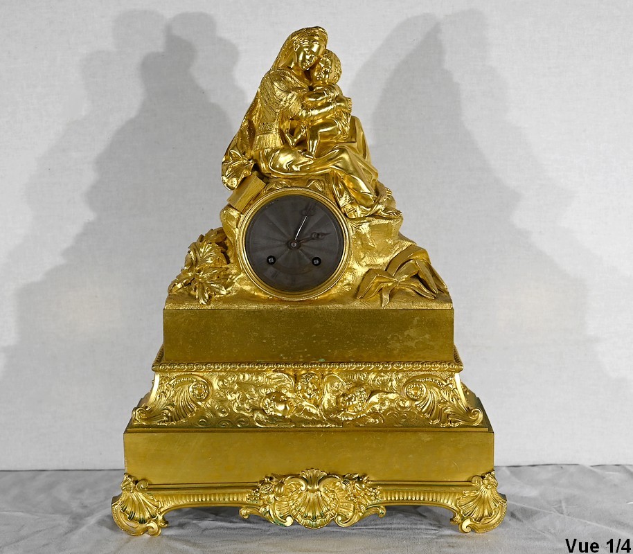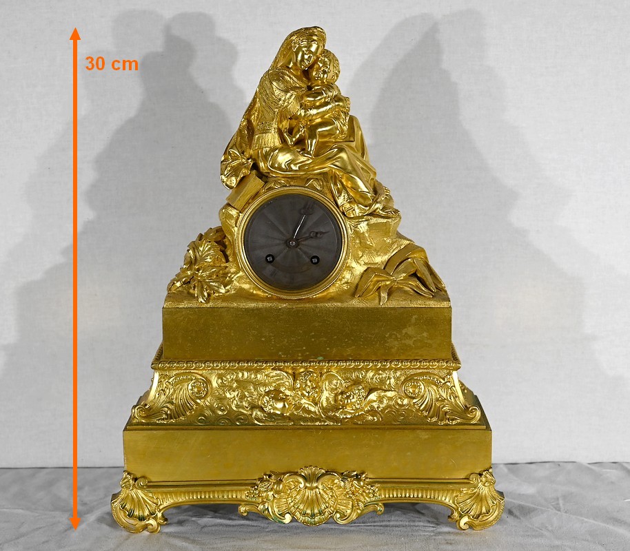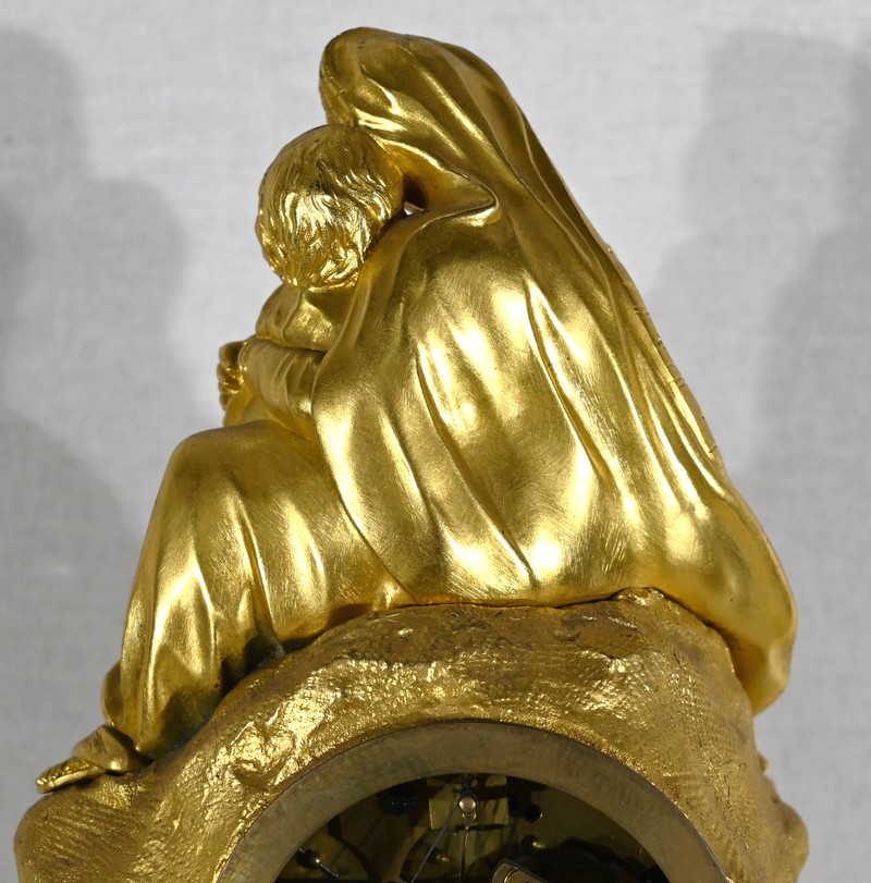 Certains admireront le caractère sacré de cet objet, tandis que d’autres retiendront surtout l’amour d’une mère à son enfant. Dans les deux cas, cette horloge plaira pour sa finesse de fabrication et son éclatante patine dorée.