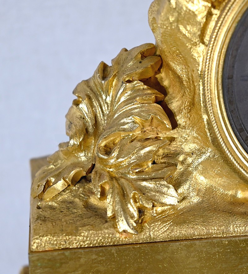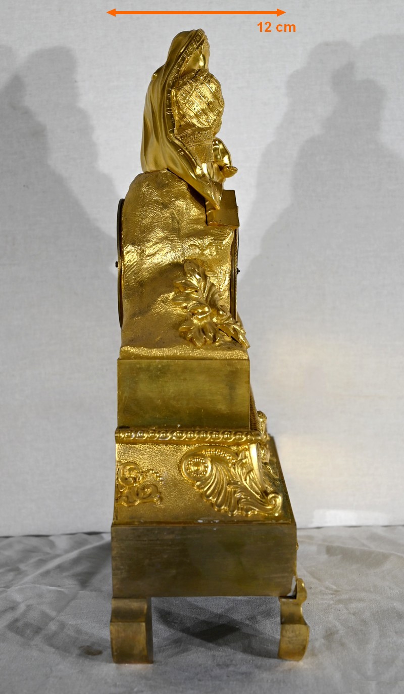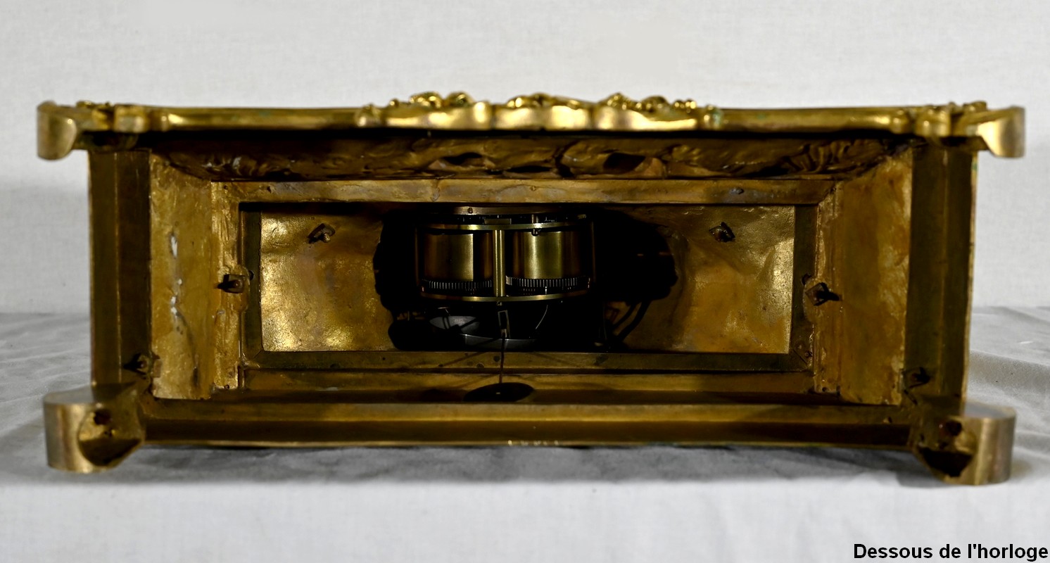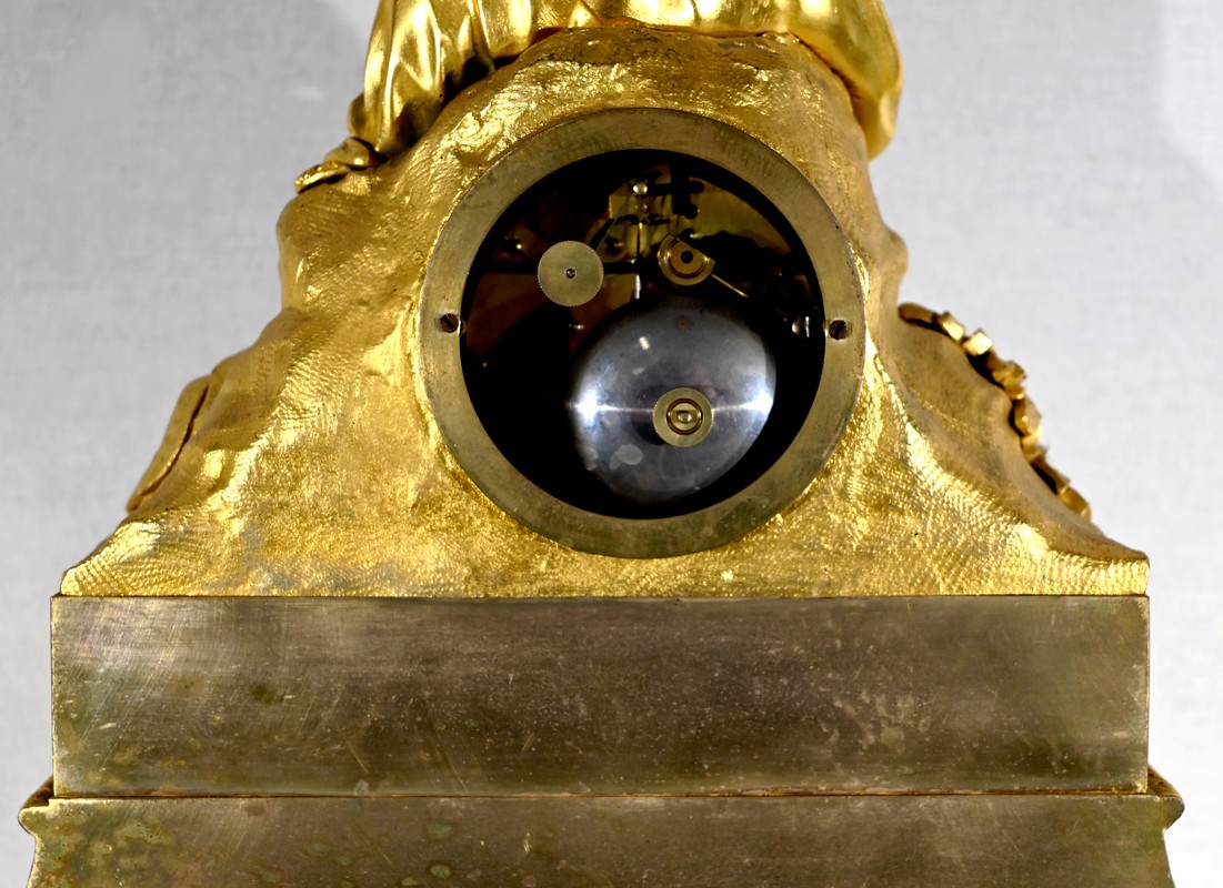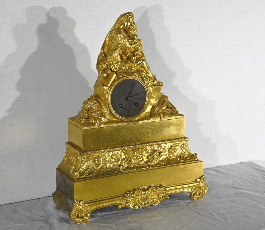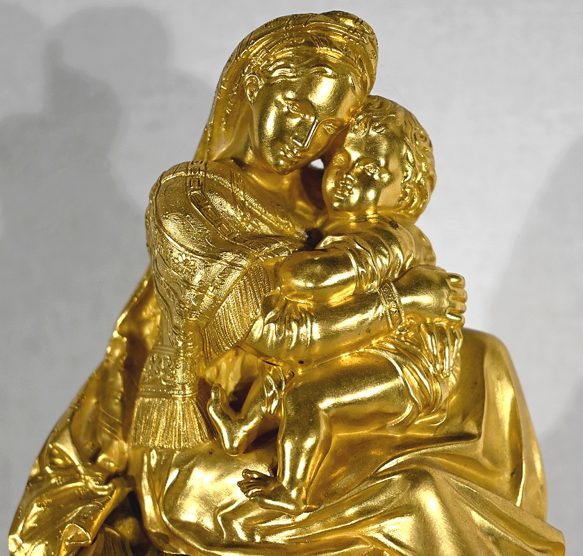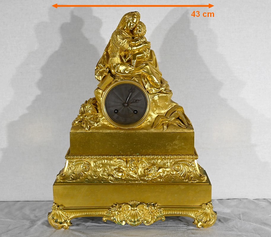Certains admireront le caractère sacré de cet objet, tandis que d’autres retiendront surtout l’amour d’une mère à son enfant. Dans les deux cas, cette horloge plaira pour sa finesse de fabrication et son éclatante patine dorée.