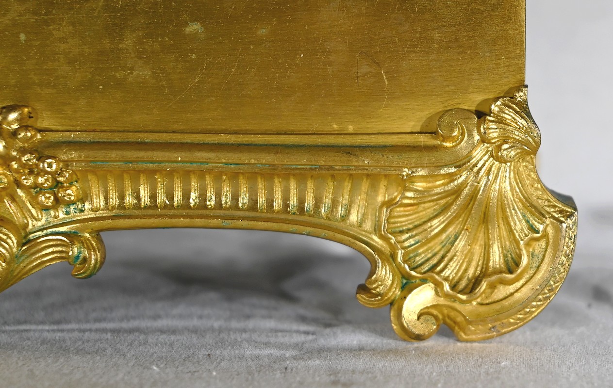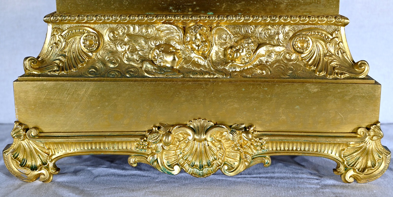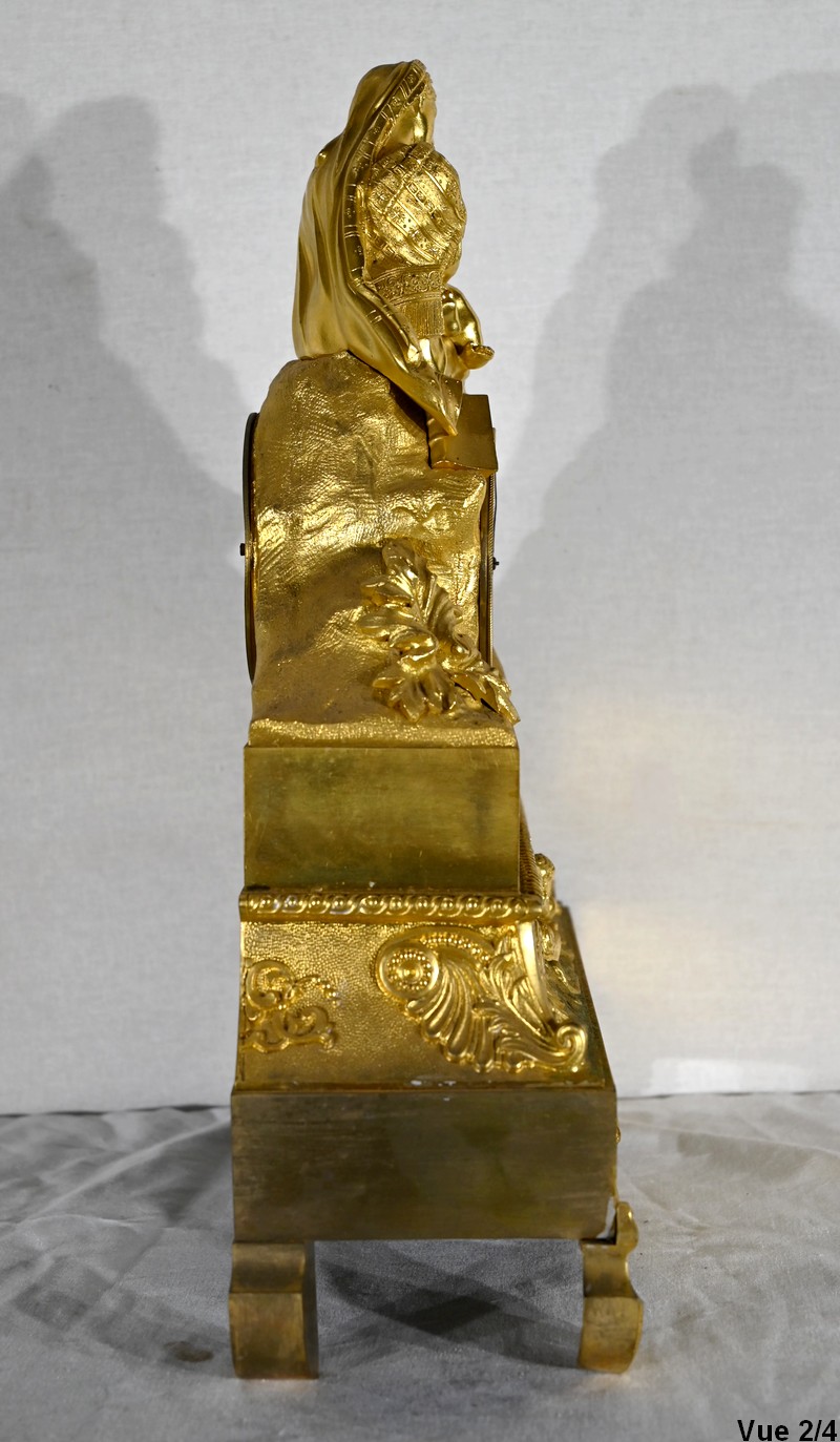 Horloge rectangulaire étagée, à mécanisme à suspension à fil, en bronze doré, figurant « La Vierge à la Chaise », tirée de l’œuvre du peintre italien Raphaël (1483-1520). Marie, assise, tient dans ses bras l’enfant Jésus.