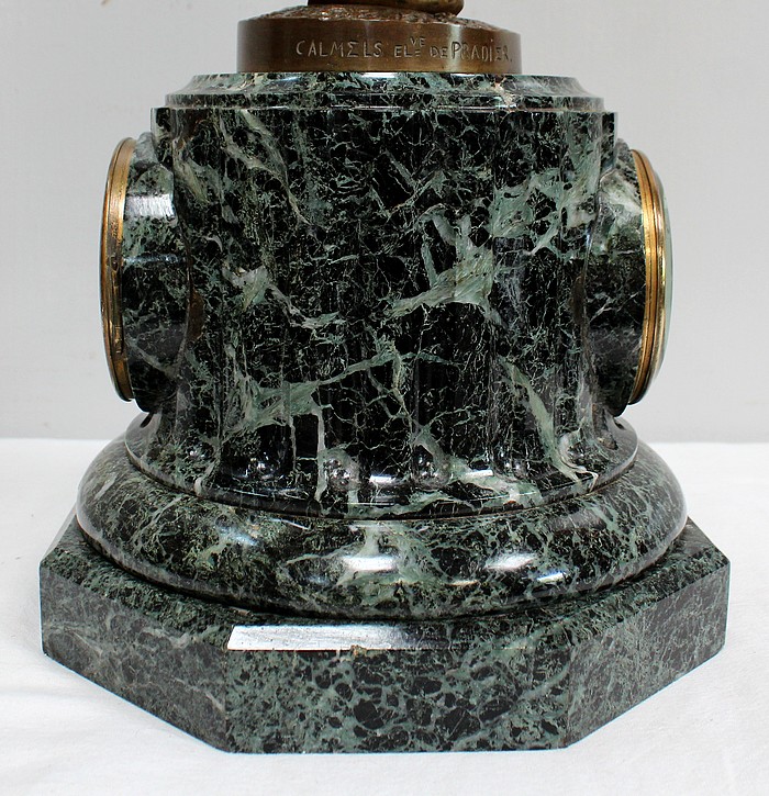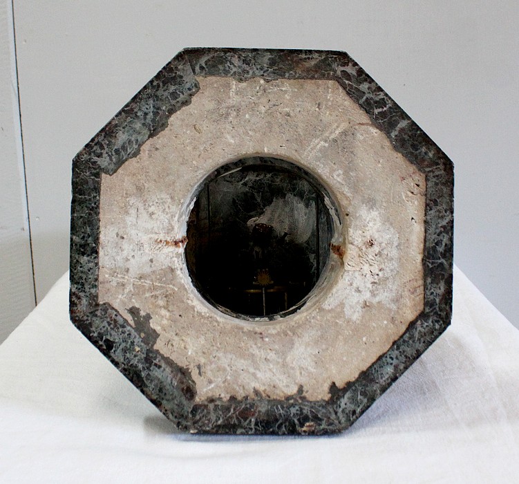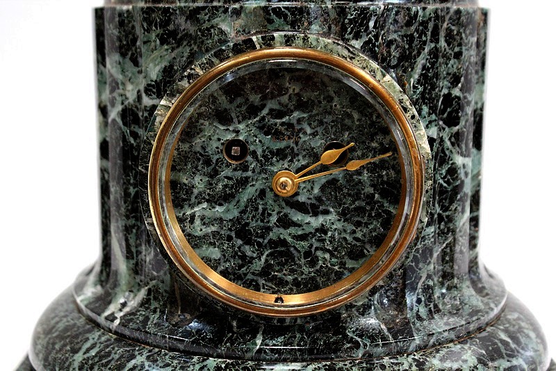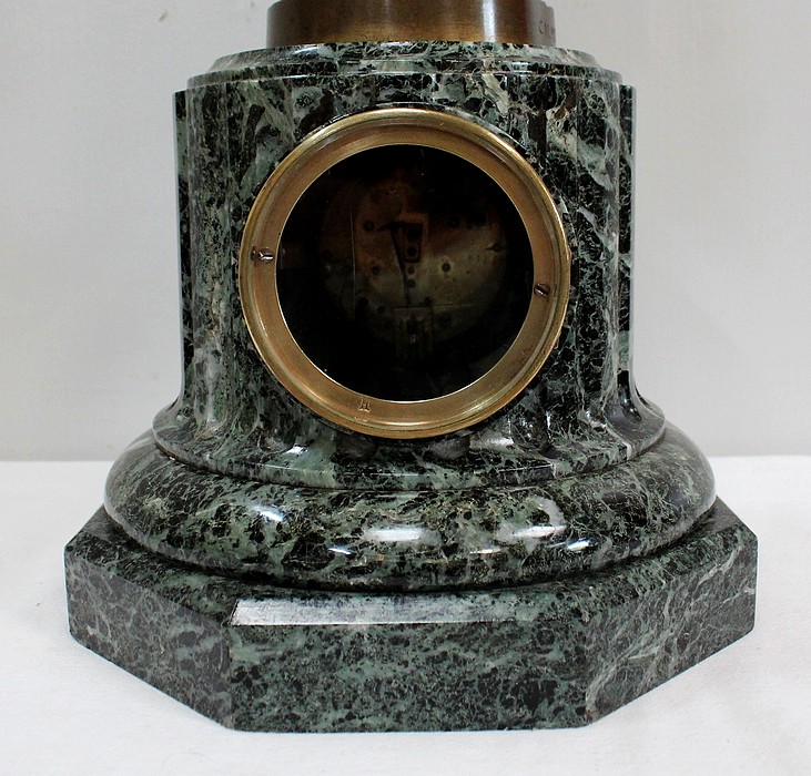 En dessous, un grand Socle en Marbre Vert de Mer, dont la base octogonale est surmontée d’une partie circulaire moulurée et d’un fût à cannelures verticales, contenant une pendule épurée avec mouvement à réviser.