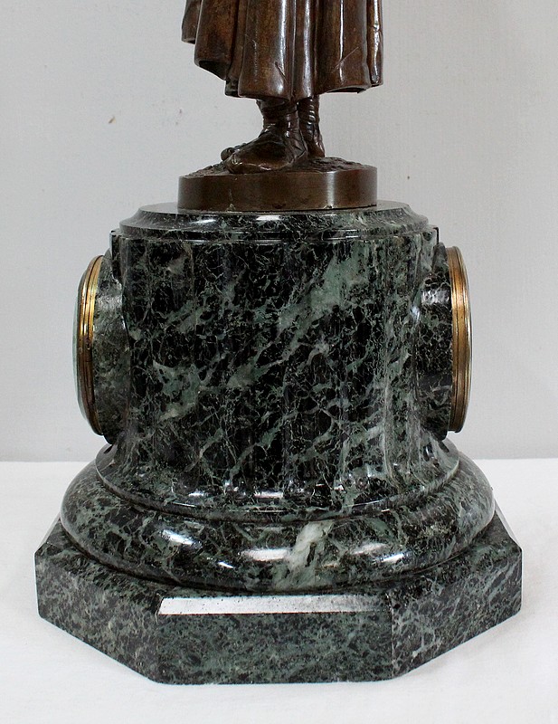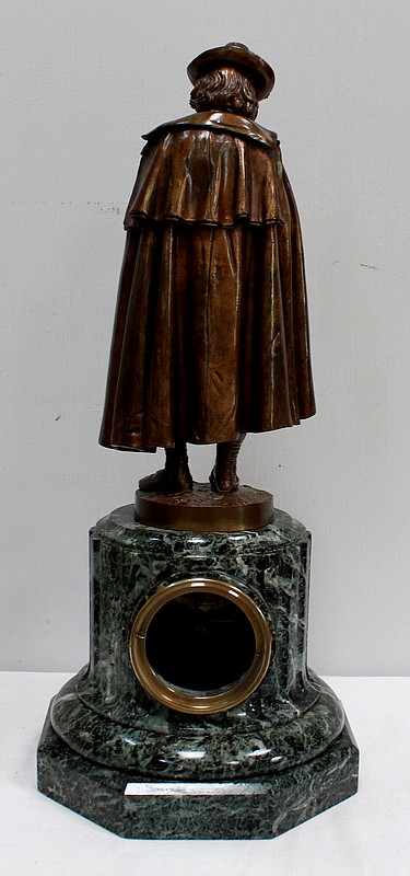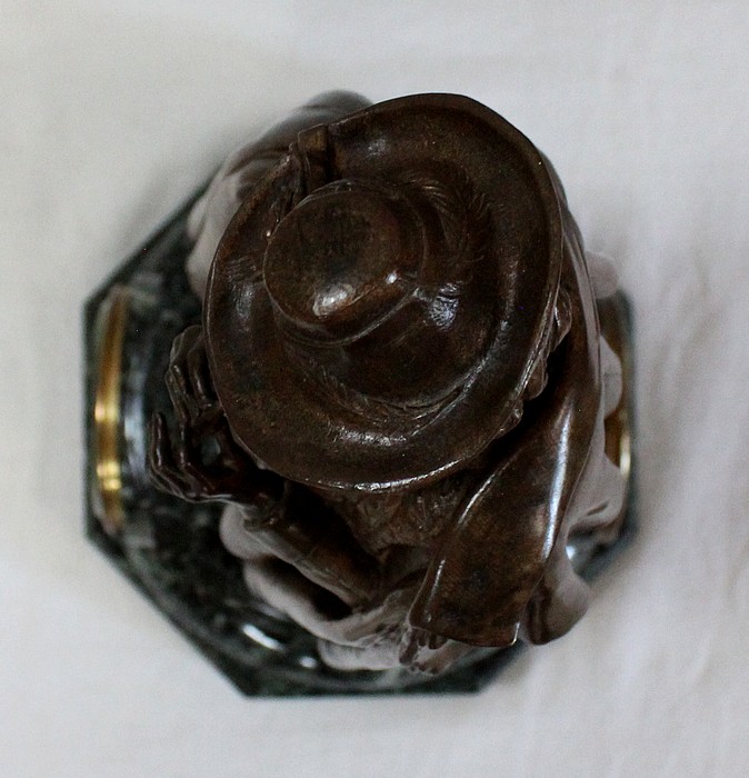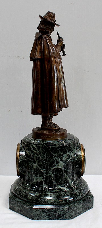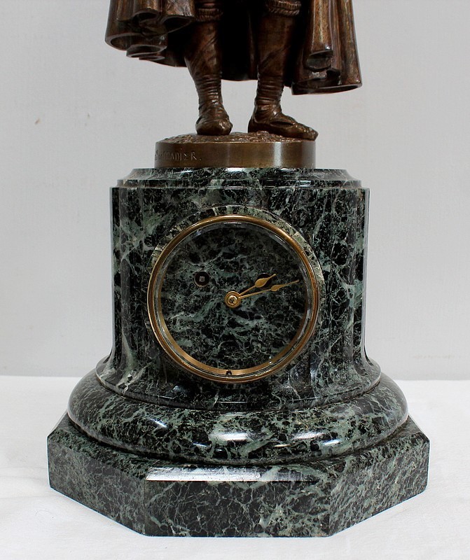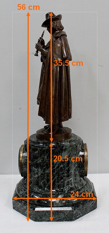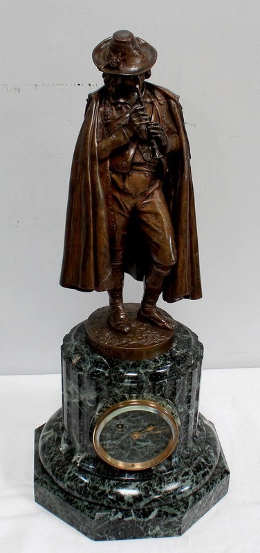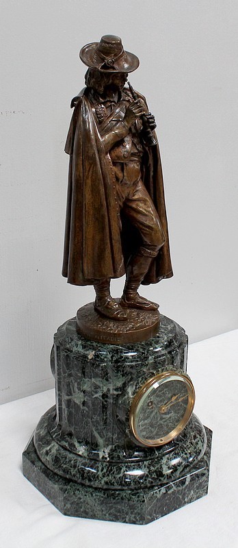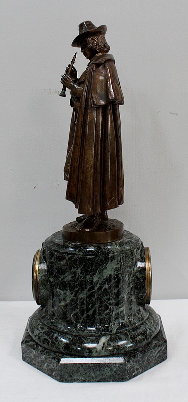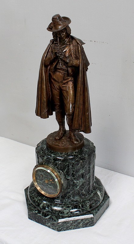 Pendule composée d’une Sculpture en Bronze à Patine Brune figurant un Joueur de Flûte, surmontant une Base en Marbre Vert d’Écume de Mer.