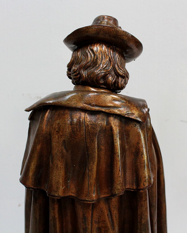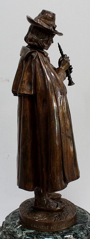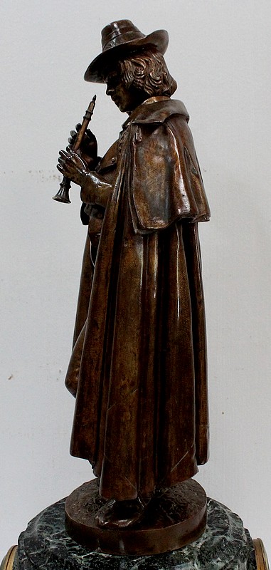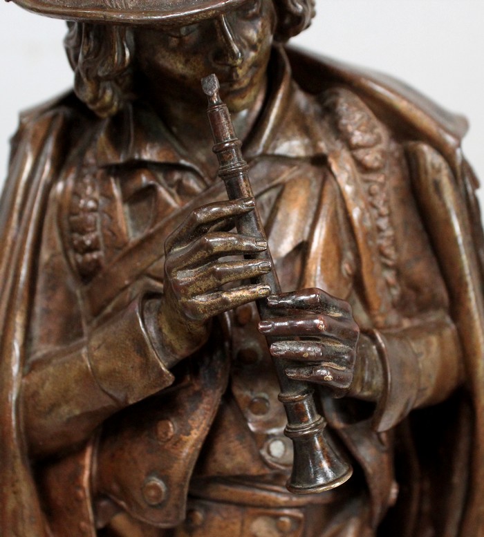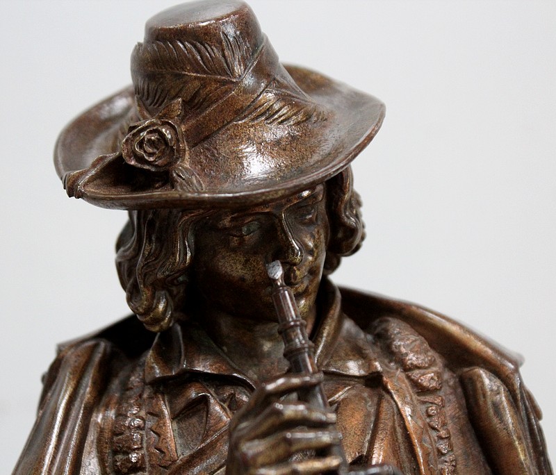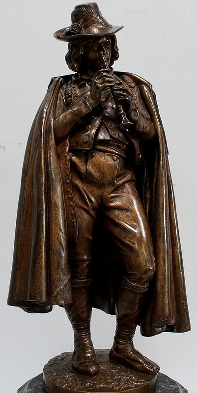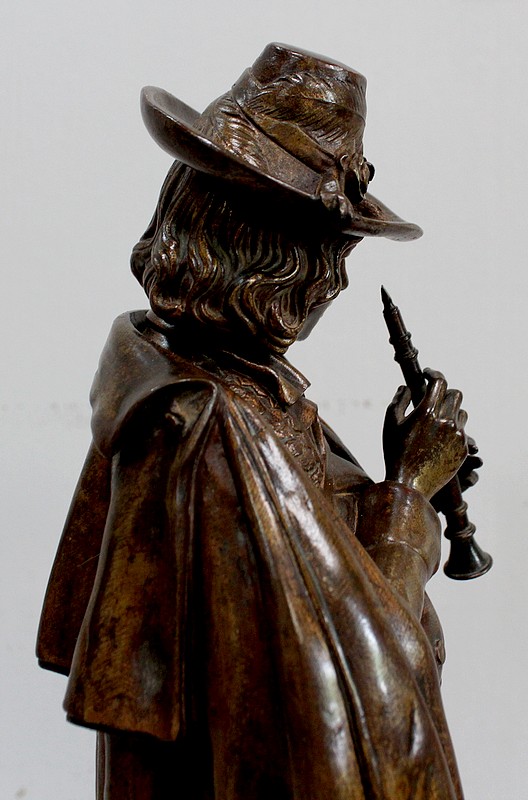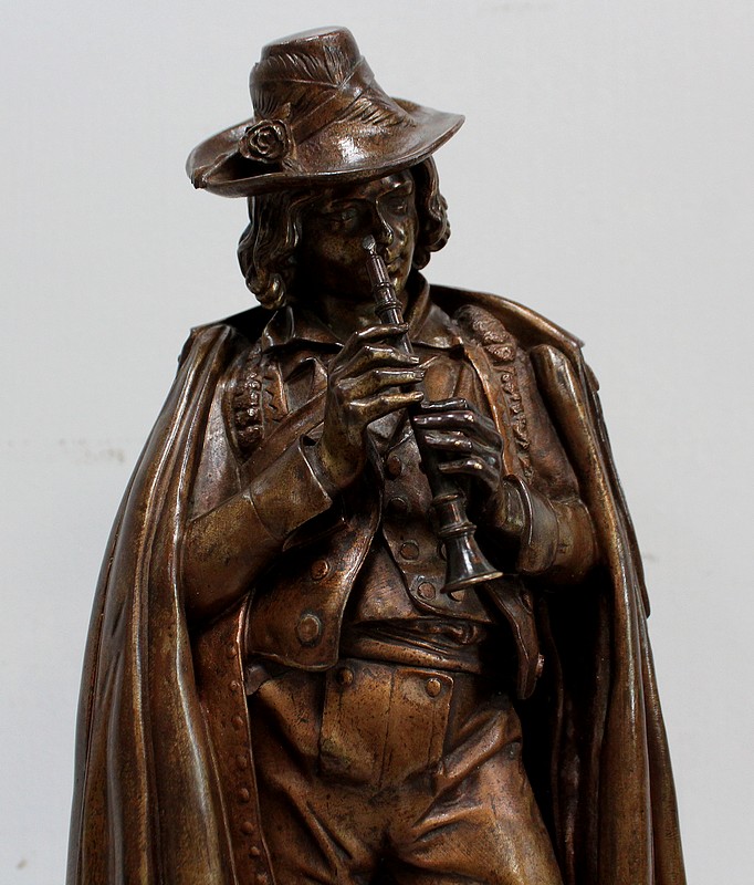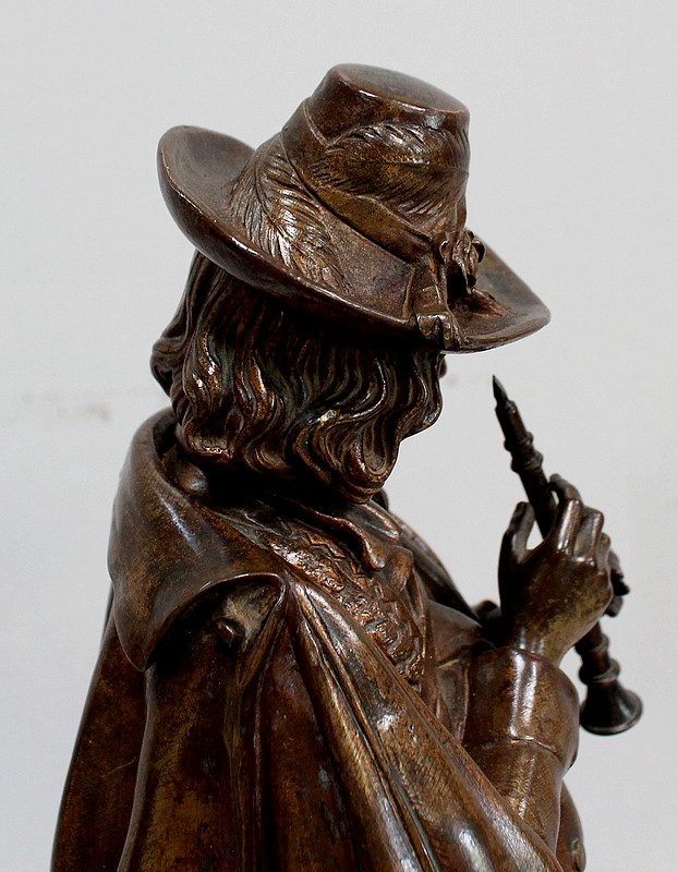 Cette Œuvre représente un Musicien tenant une Flûte de ses Mains fines et portant un Chapeau agrémenté de Plumes et d’un Ruban retenu par une Rose. Sur ses épaules, une grande Cape recouvre sa tenue travaillée en détails.