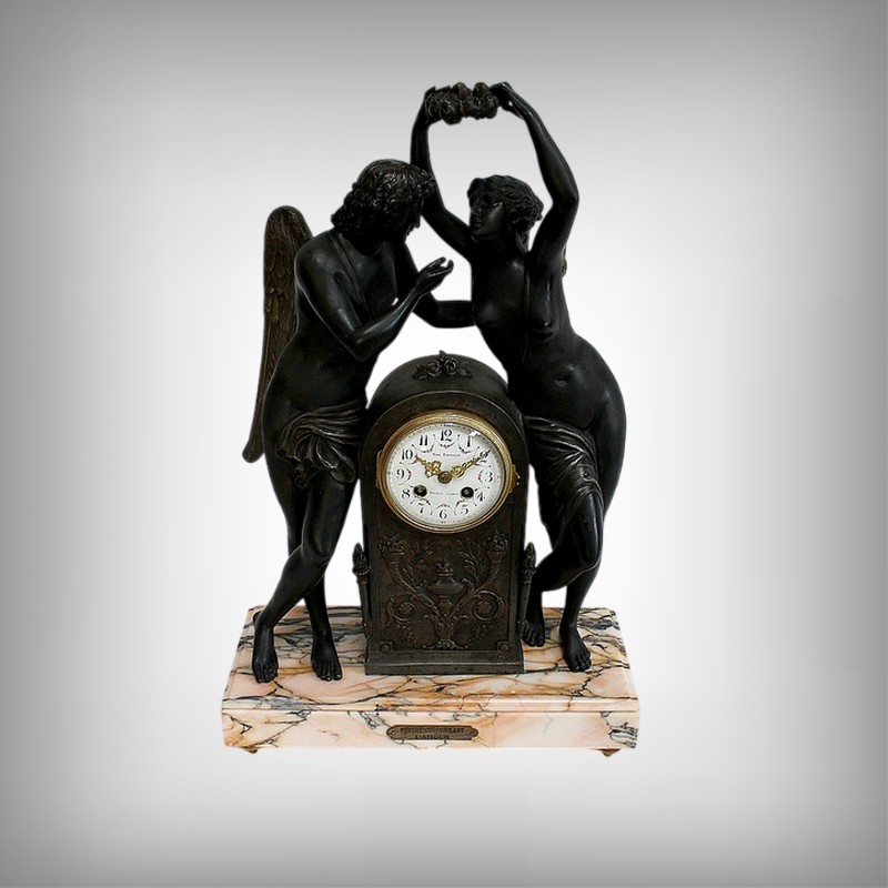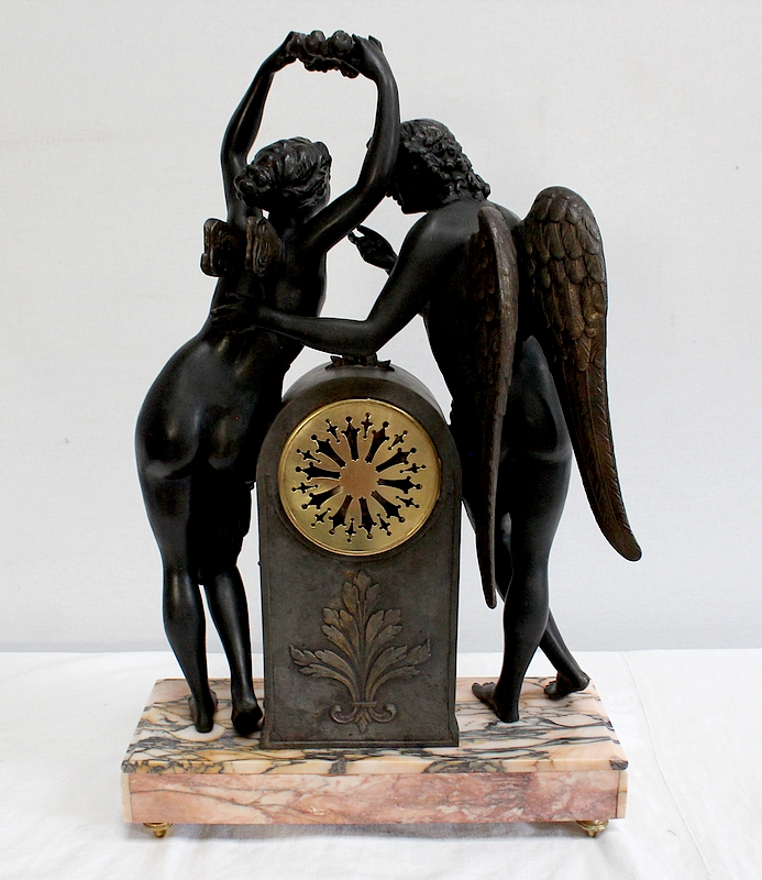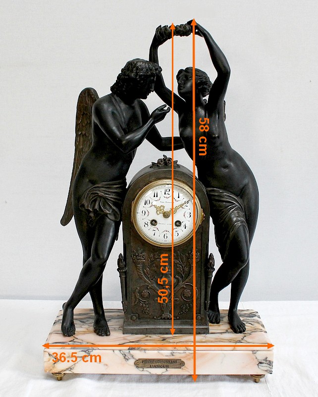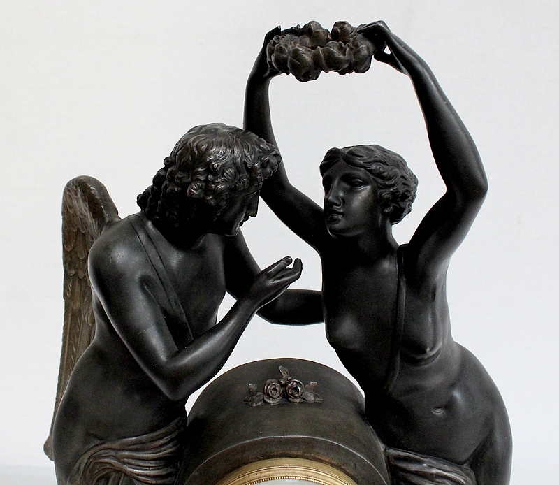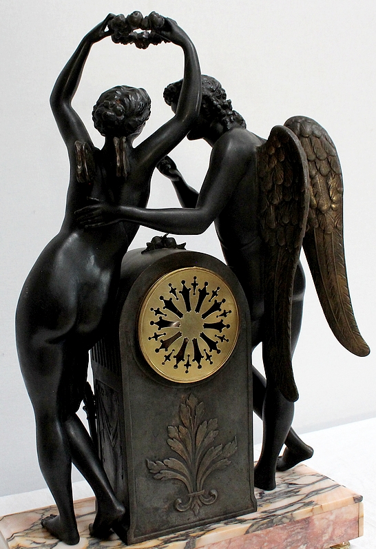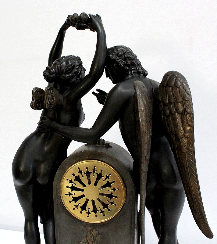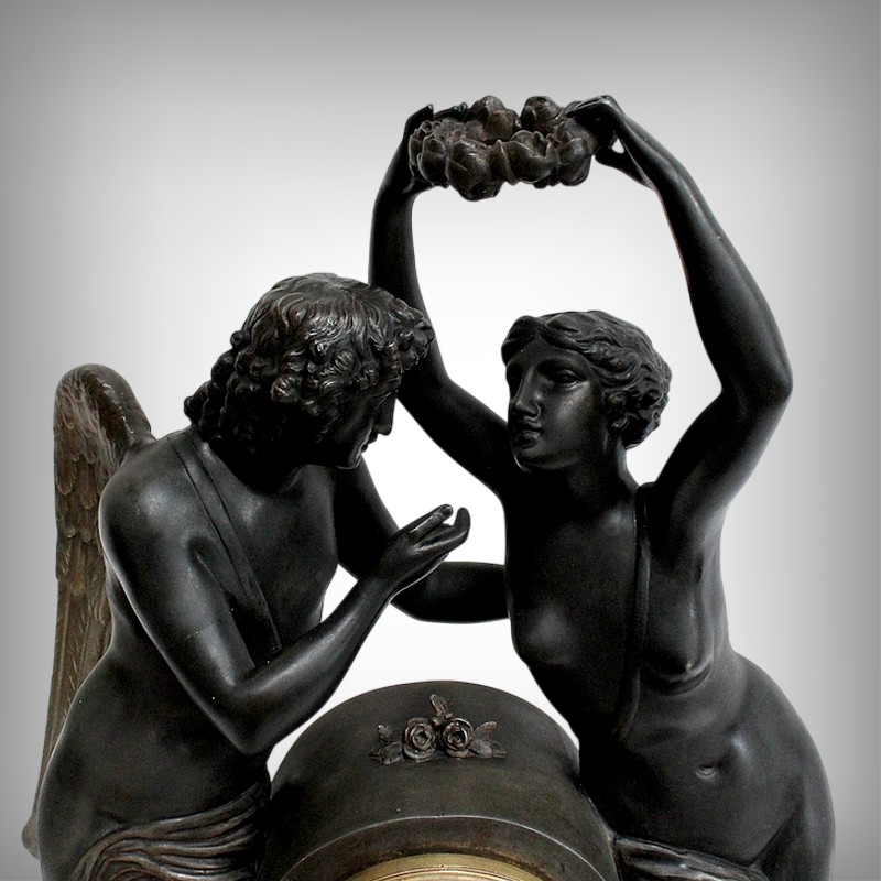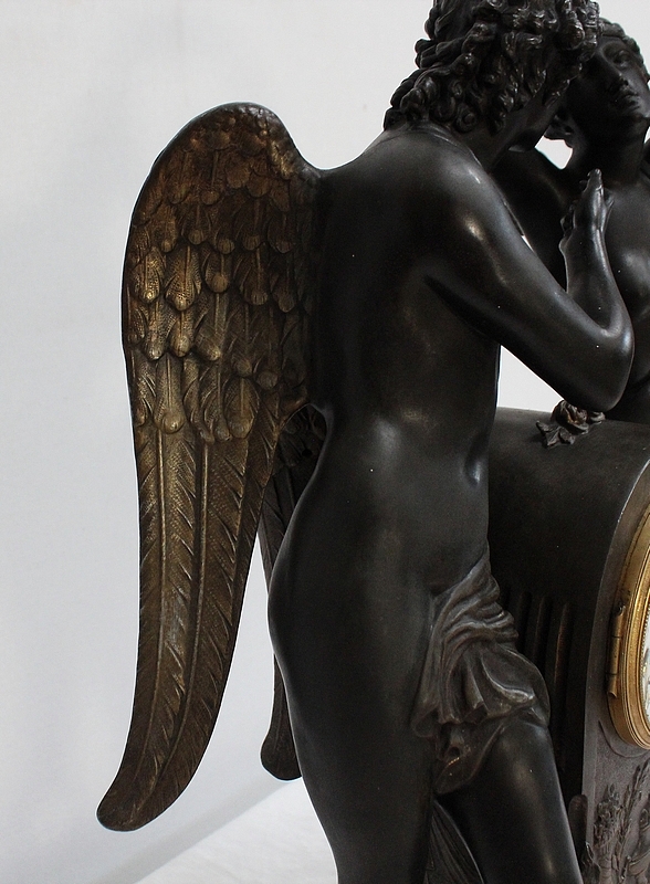 Cette Pendule illustre un épisode du mythe de Psyché dans lequel celle-ci s’apprête à déposer sur le front d’Éros sa couronne blanche de pureté. Les deux amants sont vêtus d’un simple voile qui cache leurs nudités, et ils revêtent leurs attributs respectifs, des ailes d’ange pour Cupidon et des ailes de papillon pour Psyché.