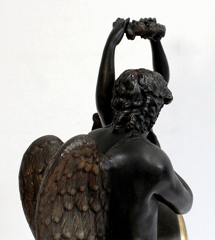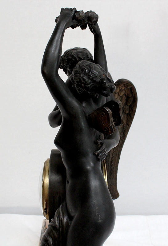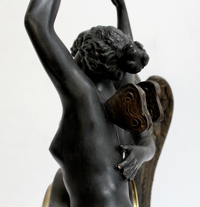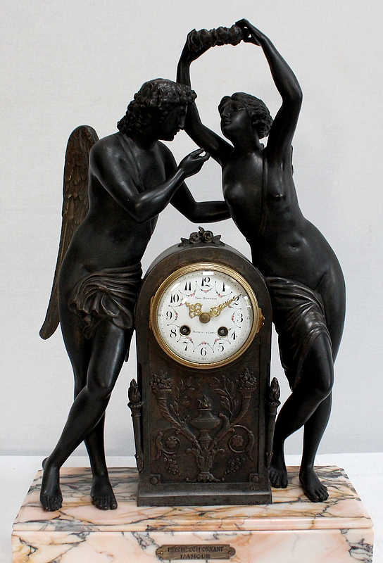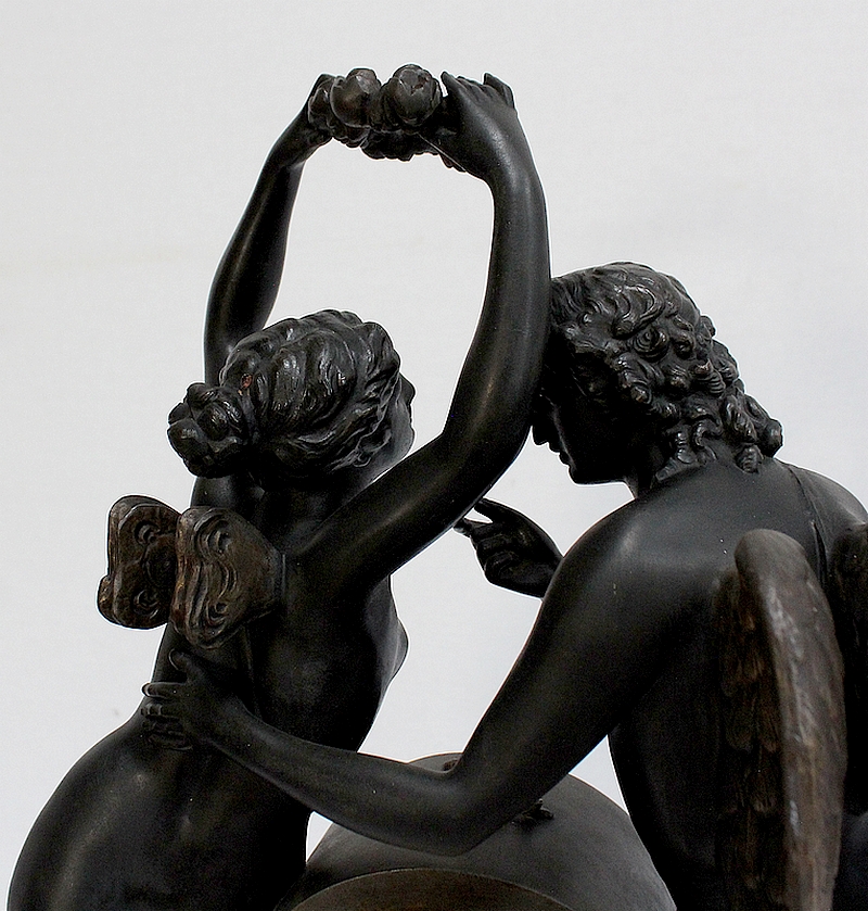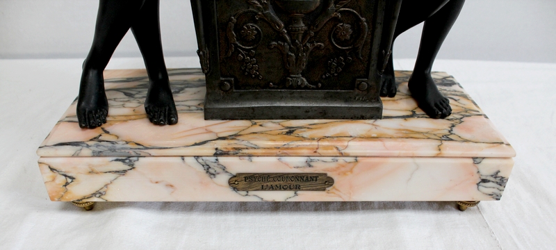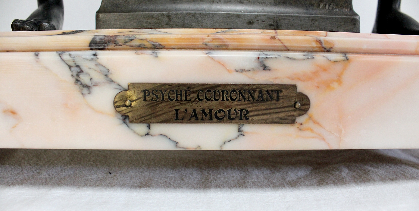 Cette Pendule illustre un épisode du mythe de Psyché dans lequel celle-ci s’apprête à déposer sur le front d’Éros sa couronne blanche de pureté. Les deux amants sont vêtus d’un simple voile qui cache leurs nudités, et ils revêtent leurs attributs respectifs, des ailes d’ange pour Cupidon et des ailes de papillon pour Psyché.