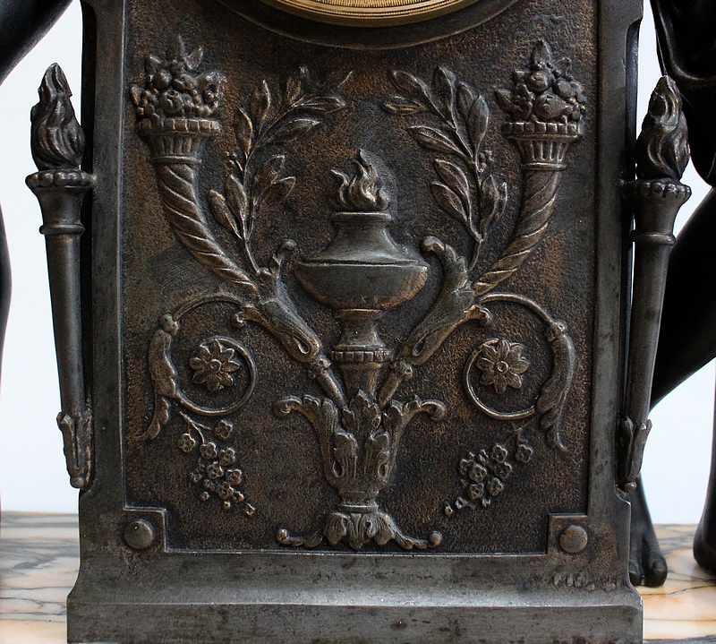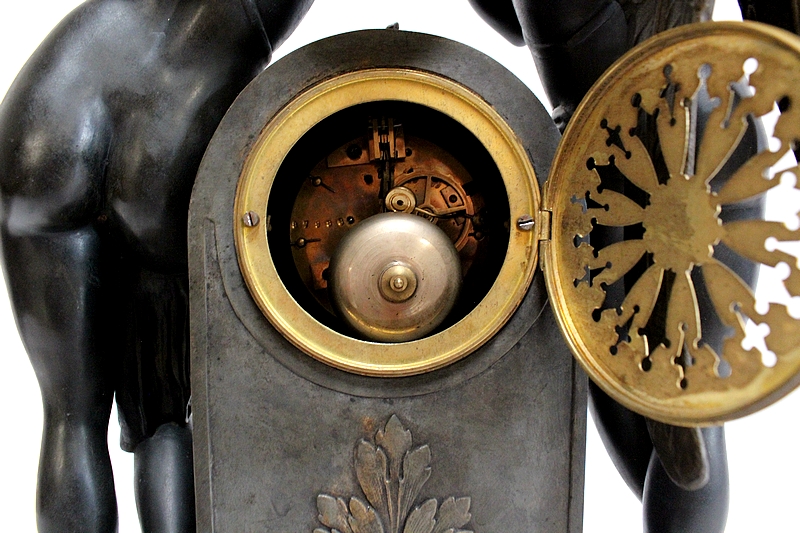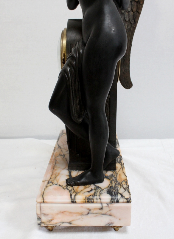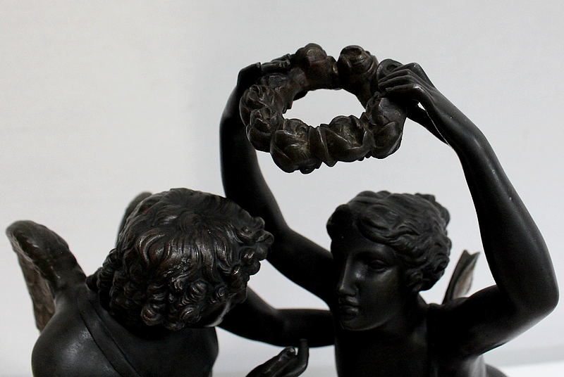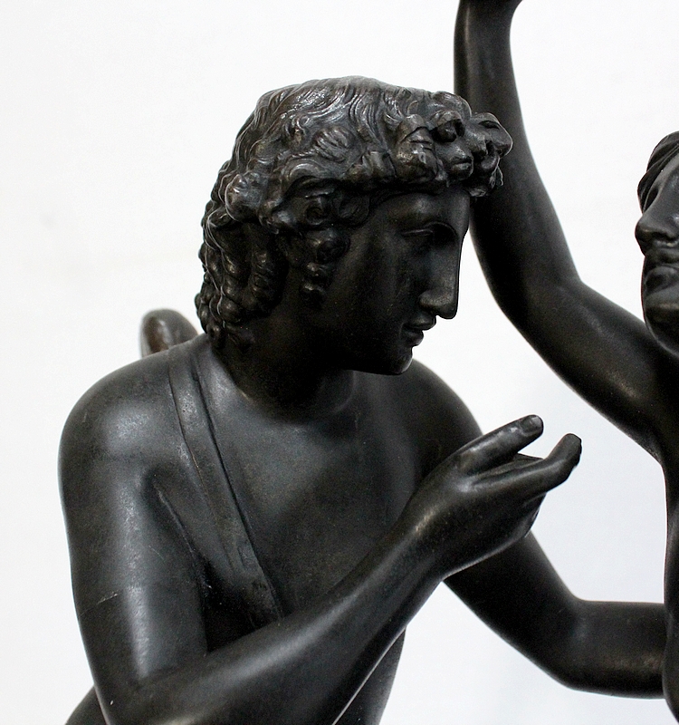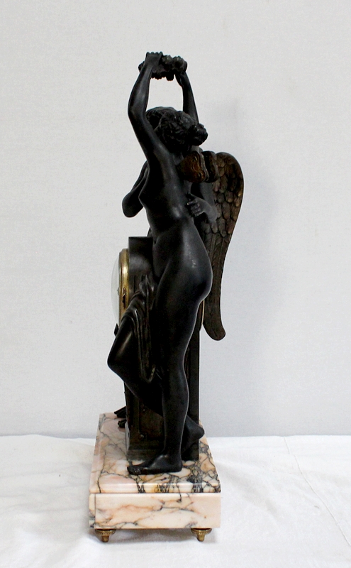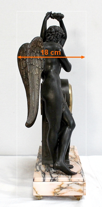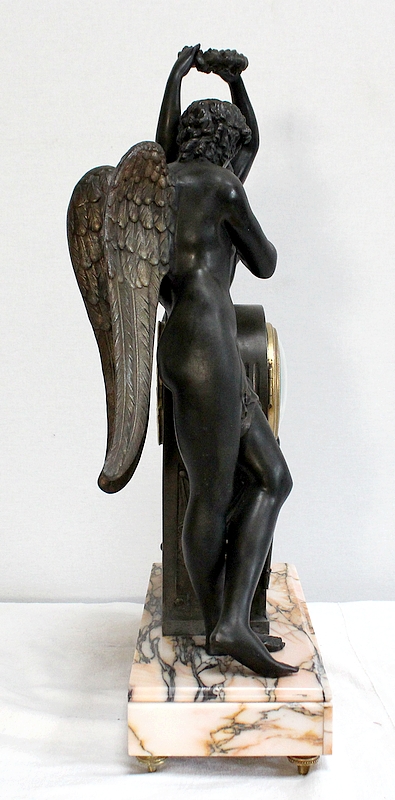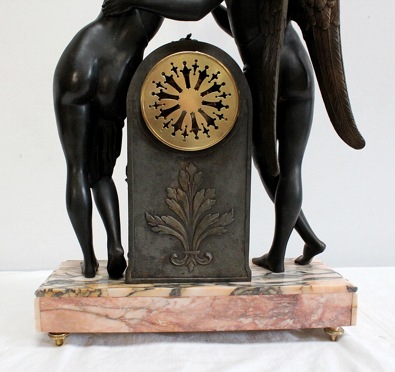 Cette Pendule illustre un épisode du mythe de Psyché dans lequel celle-ci s’apprête à déposer sur le front d’Éros sa couronne blanche de pureté. Les deux amants sont vêtus d’un simple voile qui cache leurs nudités, et ils revêtent leurs attributs respectifs, des ailes d’ange pour Cupidon et des ailes de papillon pour Psyché.