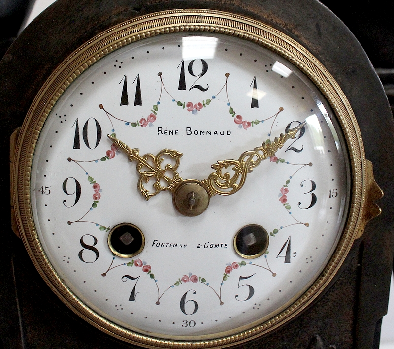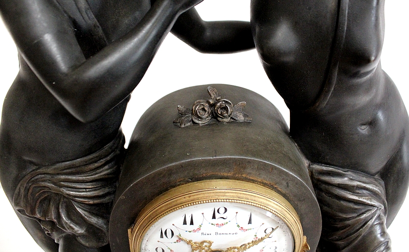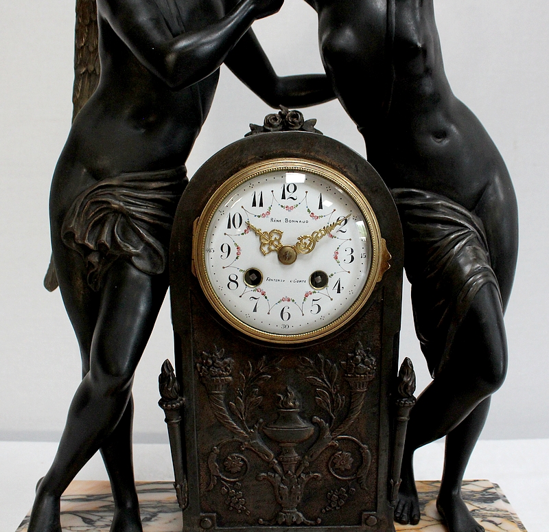 Cet important groupe en régule à patine brune entoure une borne centrale délicatement ciselée où figure des fleurs et des flambeaux. Au centre un cadran en émail blanc accompagné de ses fines aiguilles dorées est orné de fleurs et signé « René Bonnaud – Fontenay le comte ». Son verre est bombé.