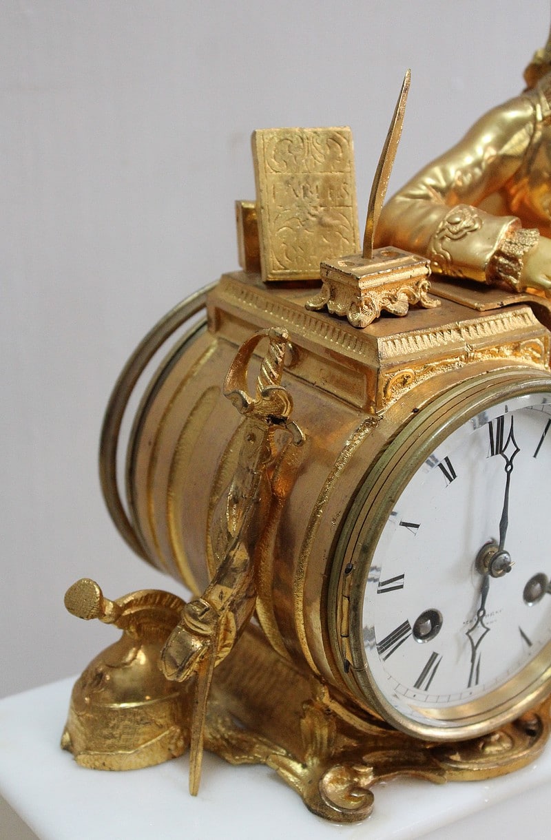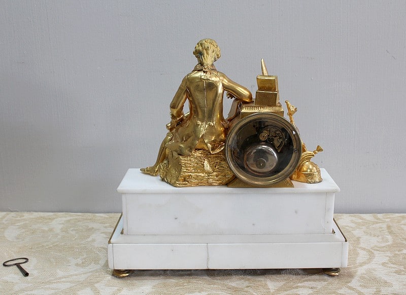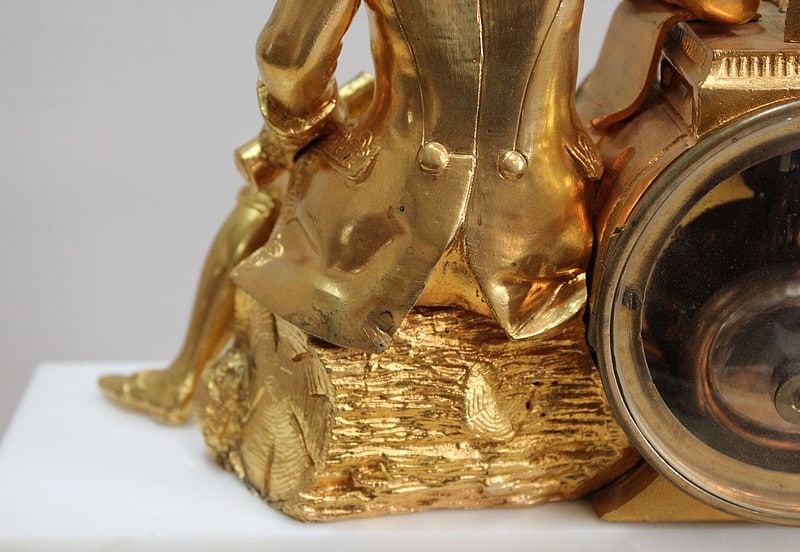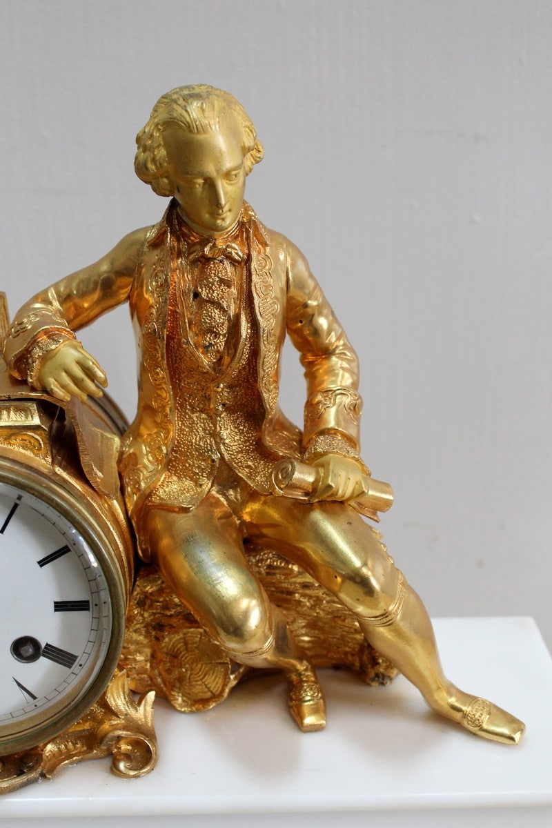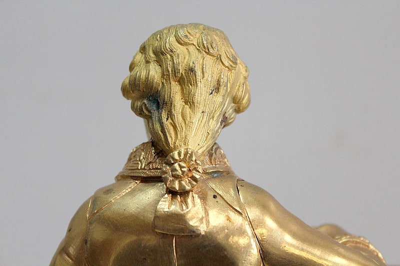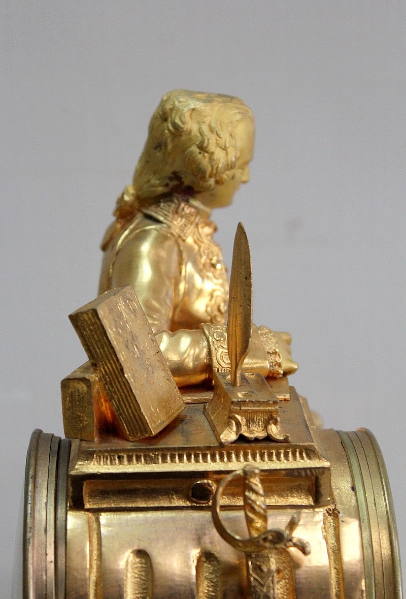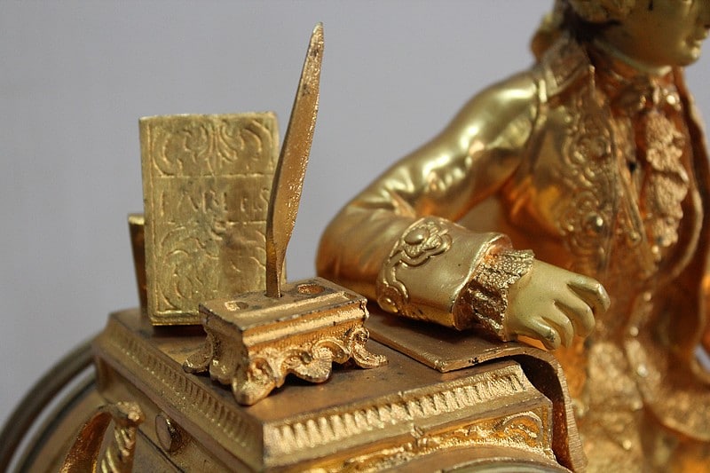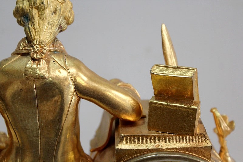 Le bronze présente un gentilhomme assis, un parchemin en main et en appui sur la pendule sur laquelle se trouvent un encrier et un livre de Fables. Une épée dans son fourreau ainsi qu’un casque d’officier de Dragons son posés sur le côté. Ces détails font penser à la représentation du fabuliste Jean-Pierre Claris de Florian né en 1755 et mort en 1794.