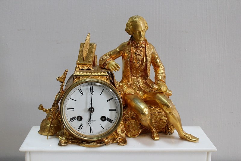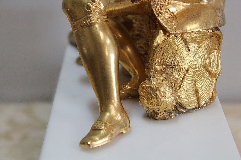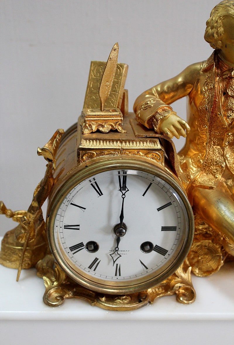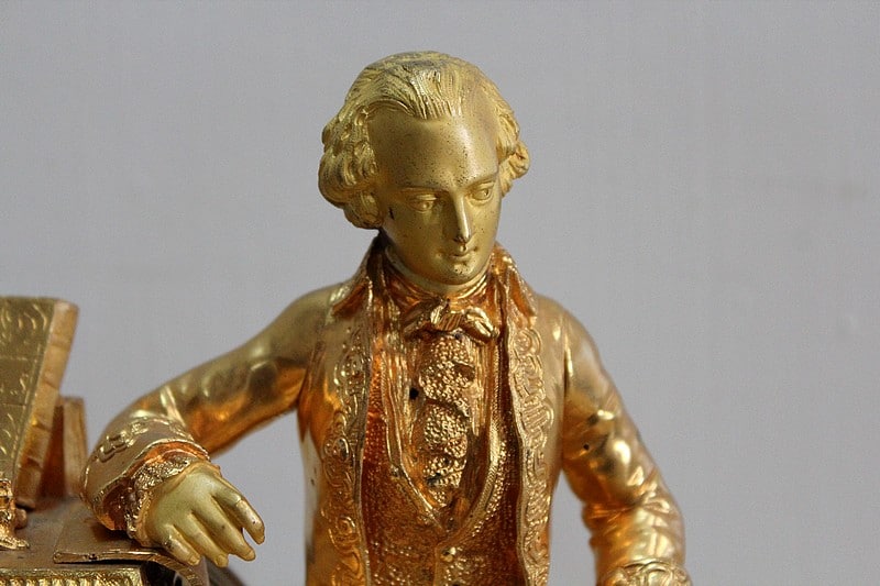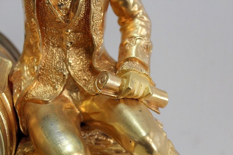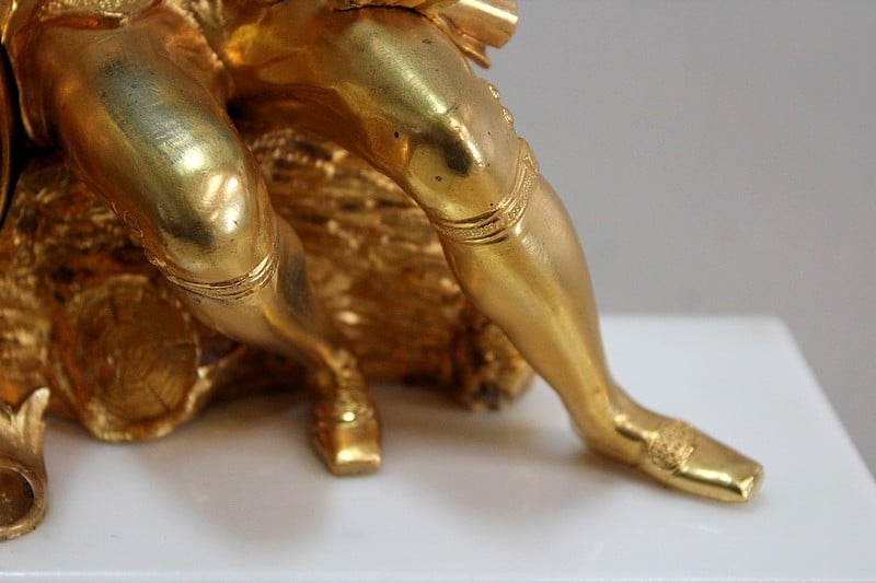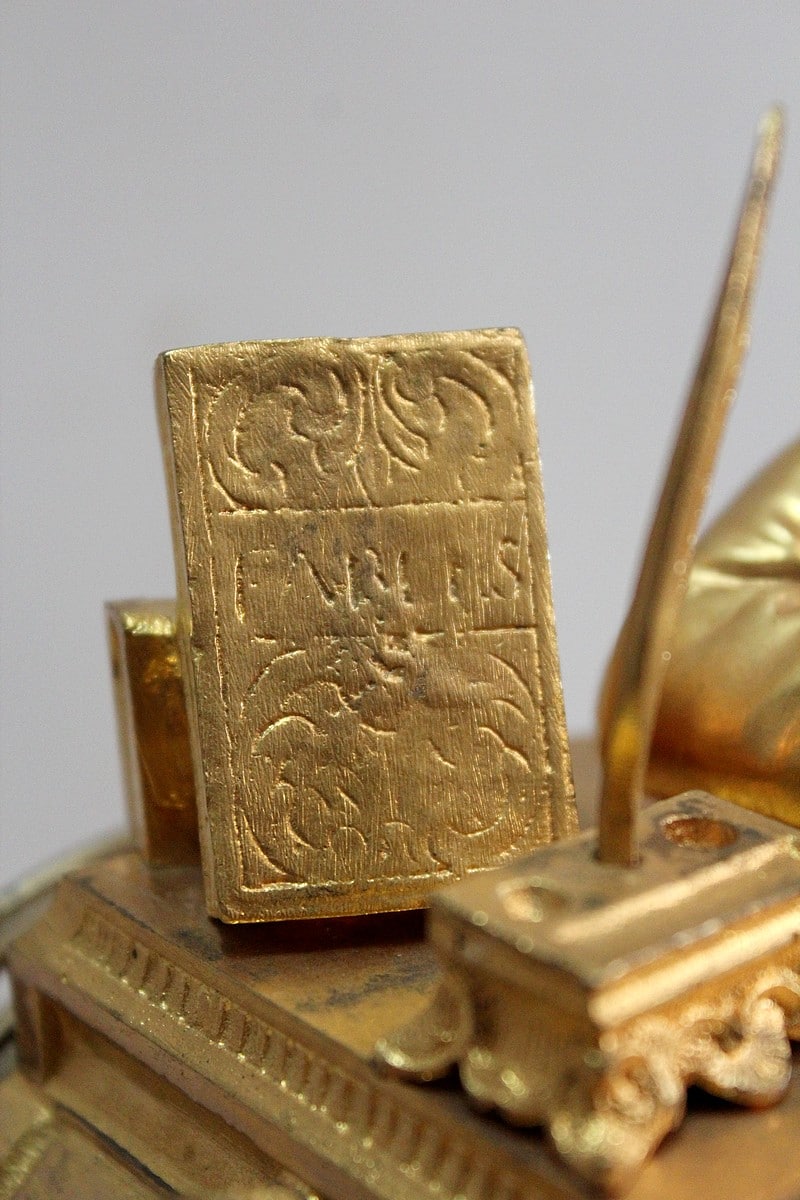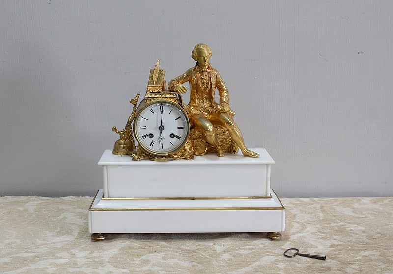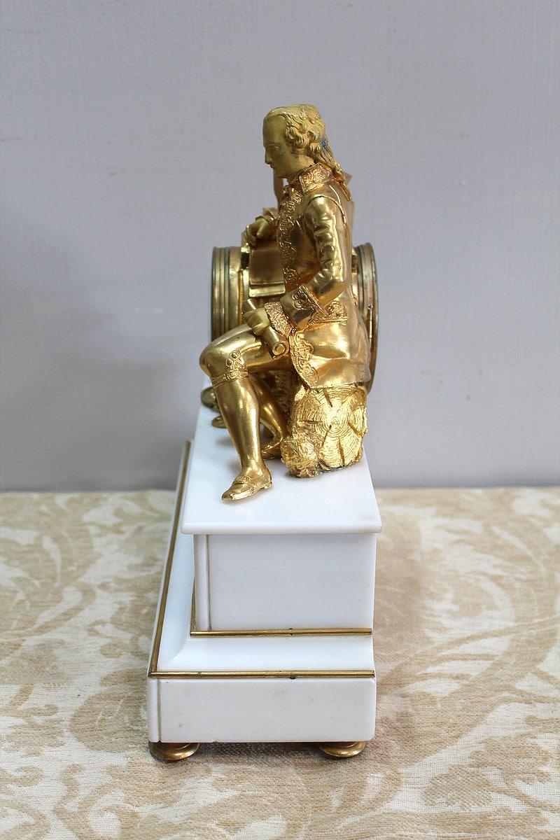 Le bronze présente un gentilhomme assis, un parchemin en main et en appui sur la pendule sur laquelle se trouvent un encrier et un livre de Fables. Une épée dans son fourreau ainsi qu’un casque d’officier de Dragons son posés sur le côté. Ces détails font penser à la représentation du fabuliste Jean-Pierre Claris de Florian né en 1755 et mort en 1794.