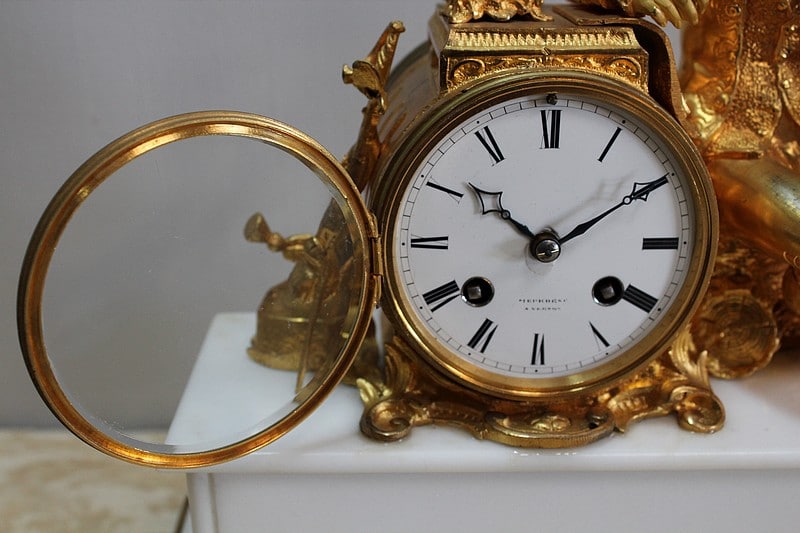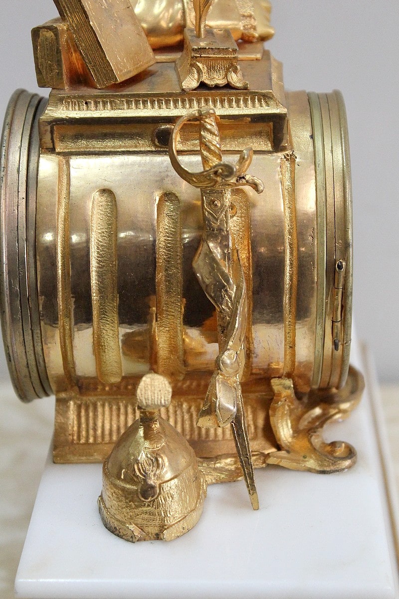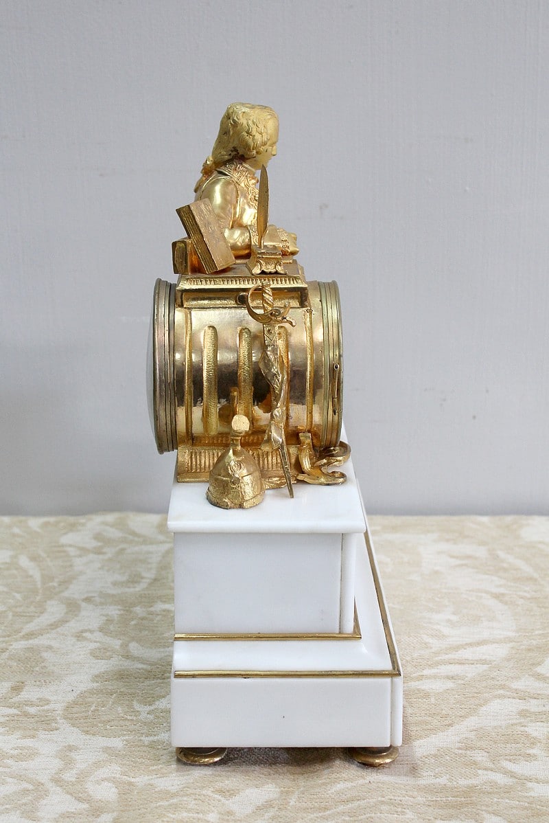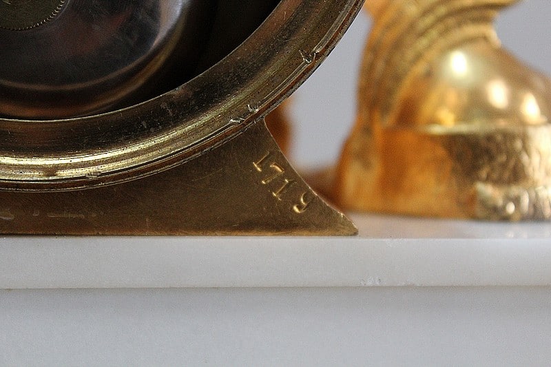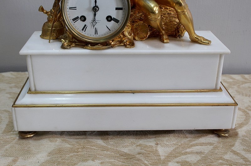 Très belle pendulette arborant un bronze finement travaillé posé sur un marbre blanc de Carrare orné de baguettes de laiton.